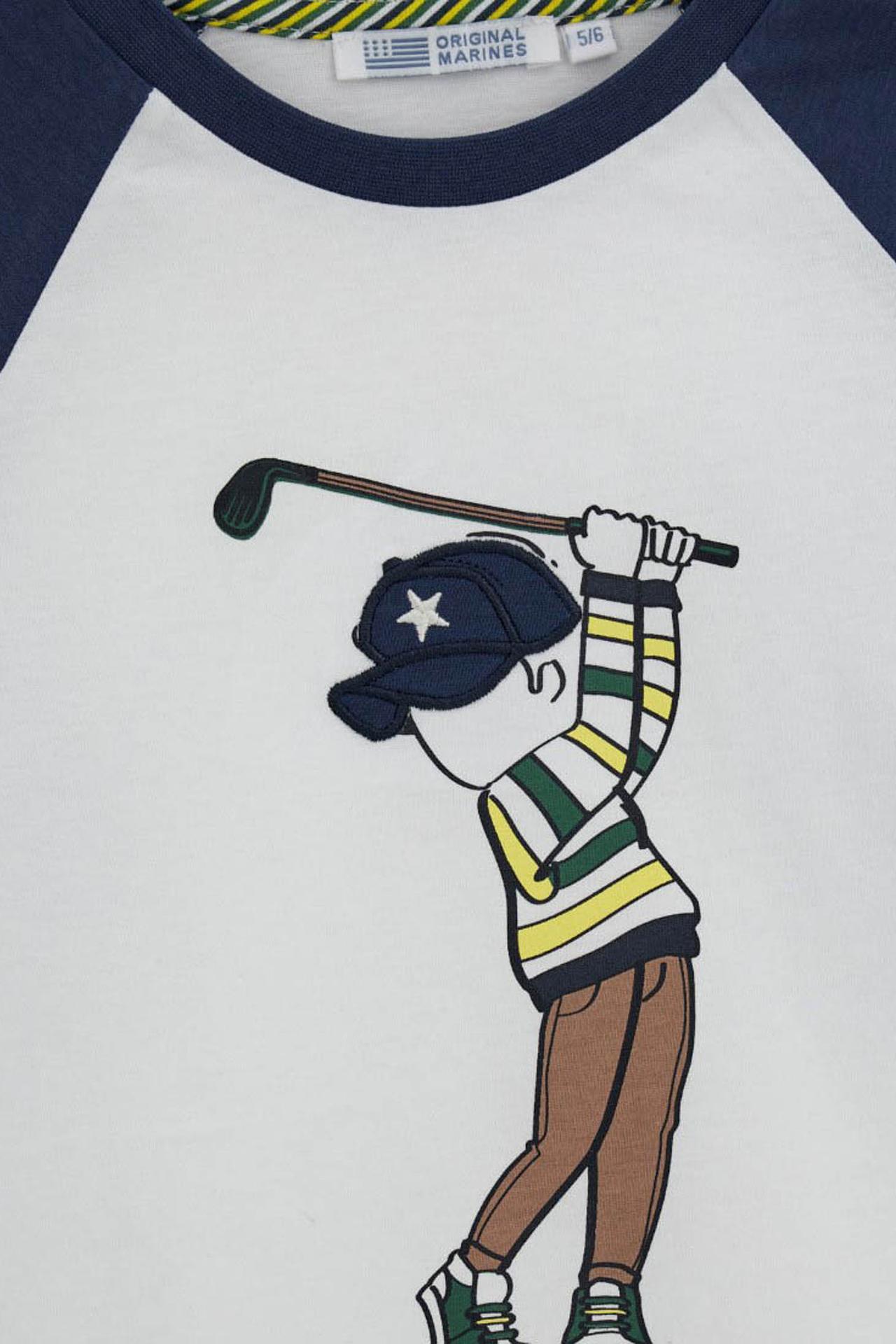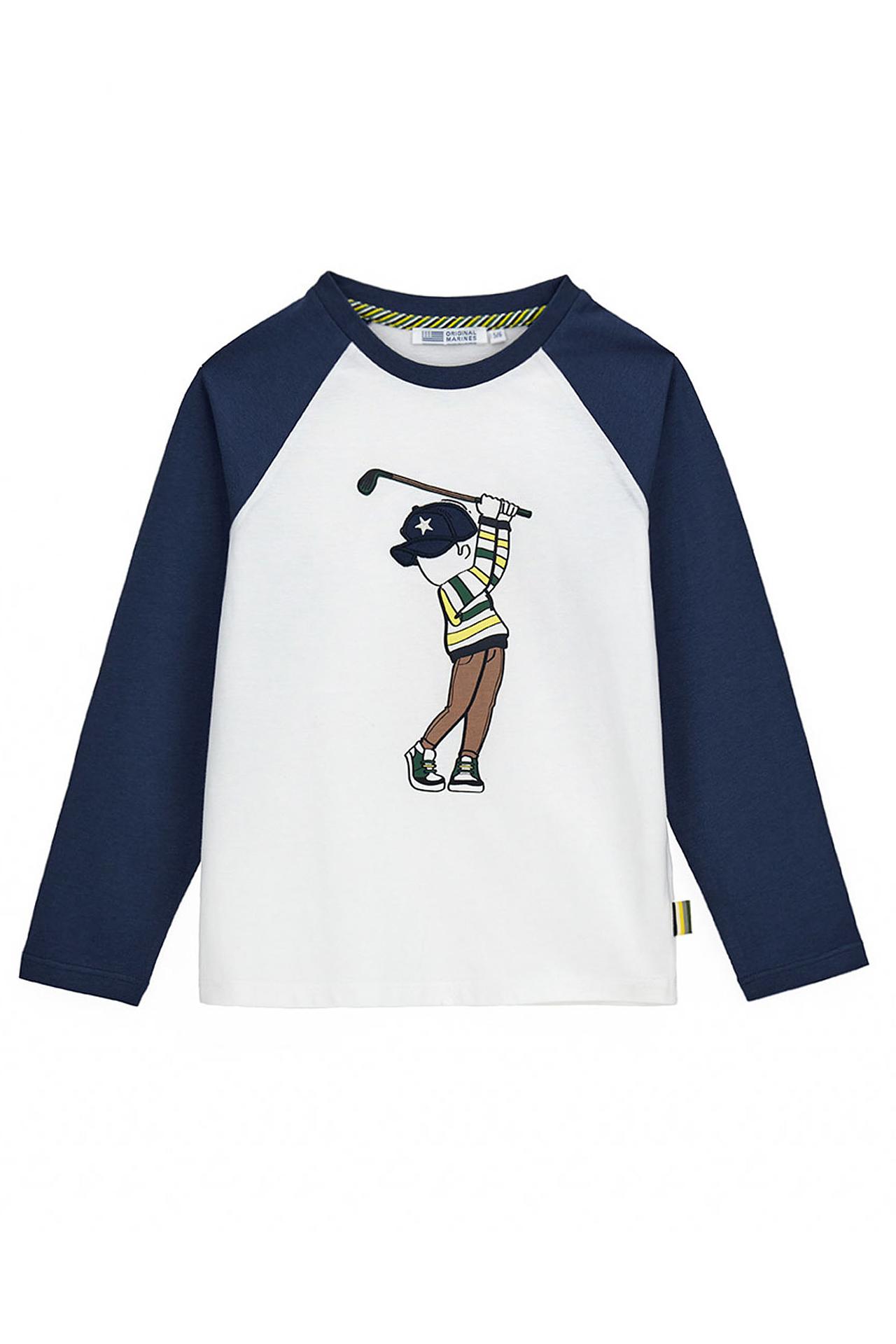- Оригинальный дизайн. Модный принт мальчика-гольфиста и контрастные темно-синие рукава реглан делают эту футболку по-настоящему запоминающейся. Это отличный лонгслив для создания стильного и веселого образа.