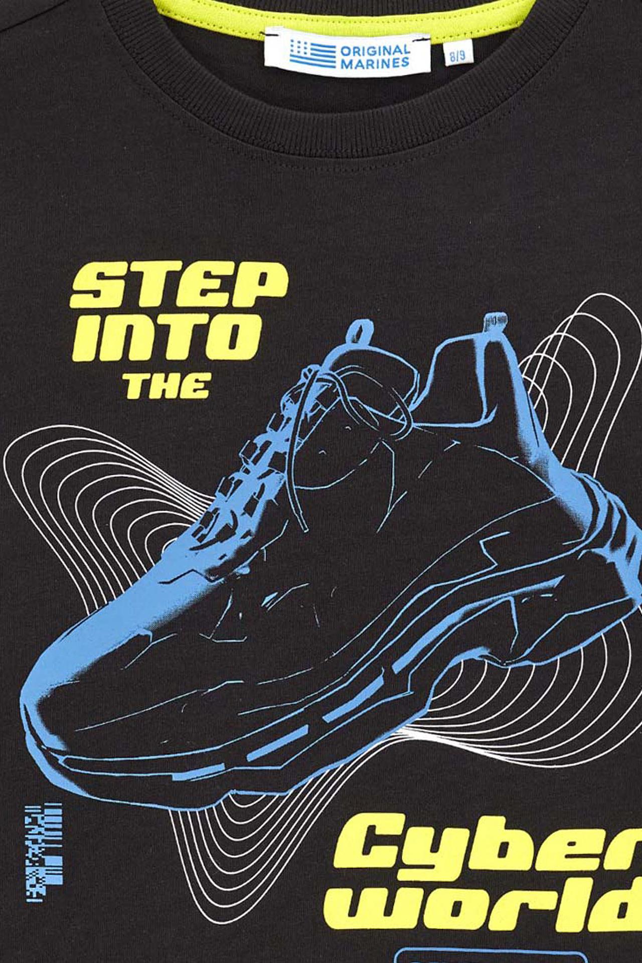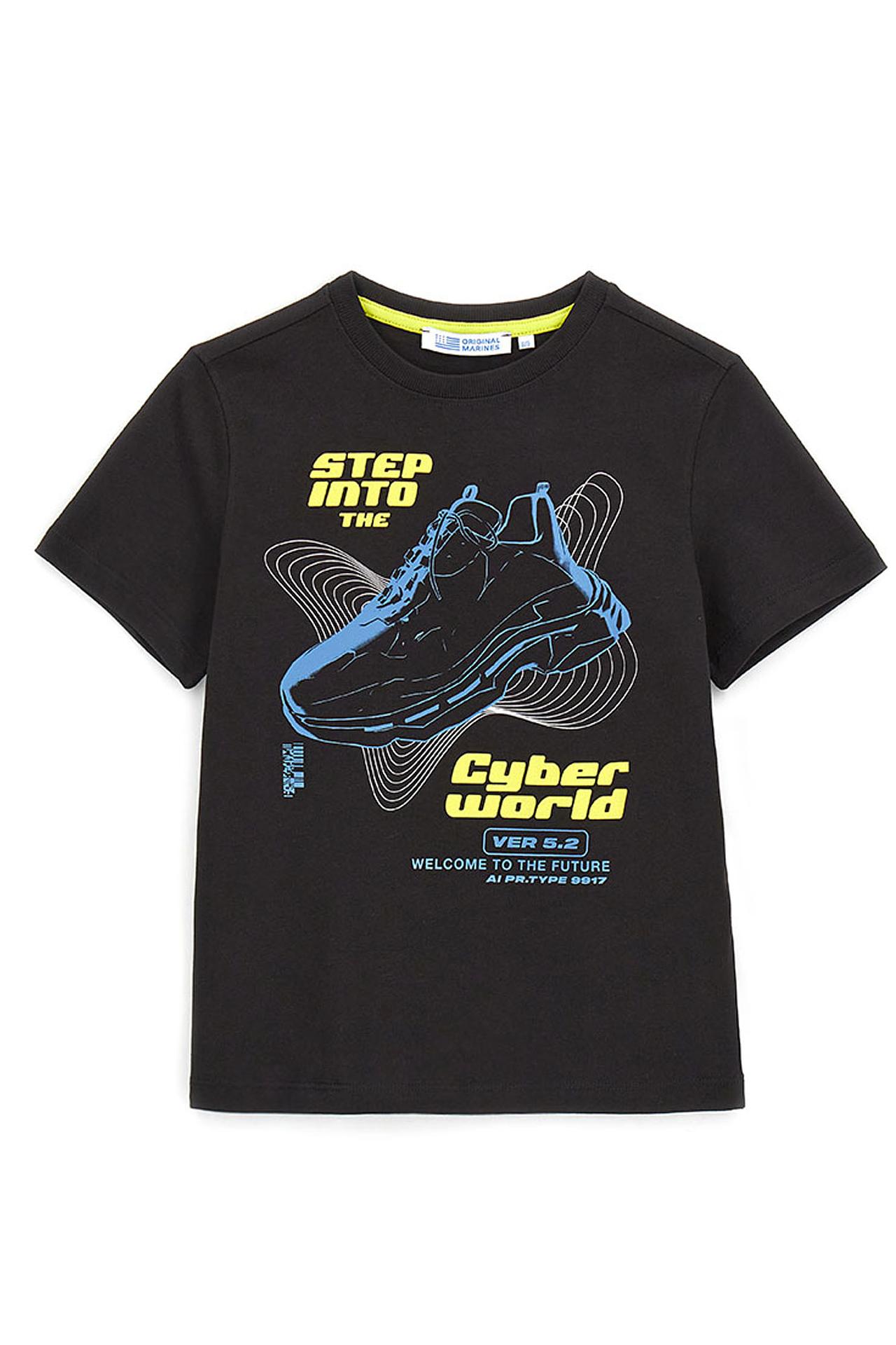 Стильная детская футболка от Original Marines, выполненная в черном цвете, станет отличным дополнением к гардеробу юного модника. Оригинальный принт в стиле киберпанк с изображением кроссовка и надписью "Cyber world" подчеркнет индивидуальность вашего ребенка. Идеально подходит для повседневной носки, прогулок и активных игр.