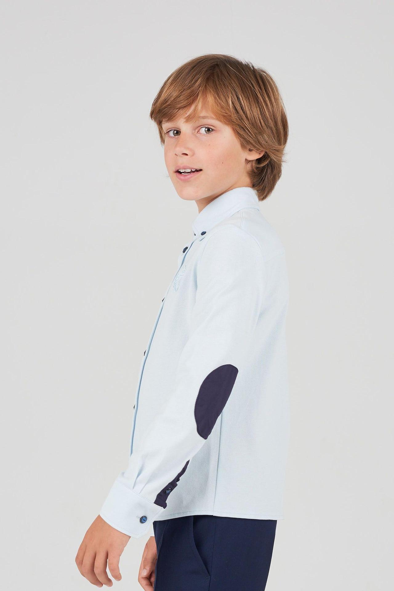 - Элегантный дизайн: Голубая рубашка украшена изящной вышивкой логотипа Choupette на груди и контрастными темно-синими накладками на локтях, которые не только добавляют стильный акцент, но и служат дополнительной защитой от истирания. Классический воротник на пуговицах завершает образ.