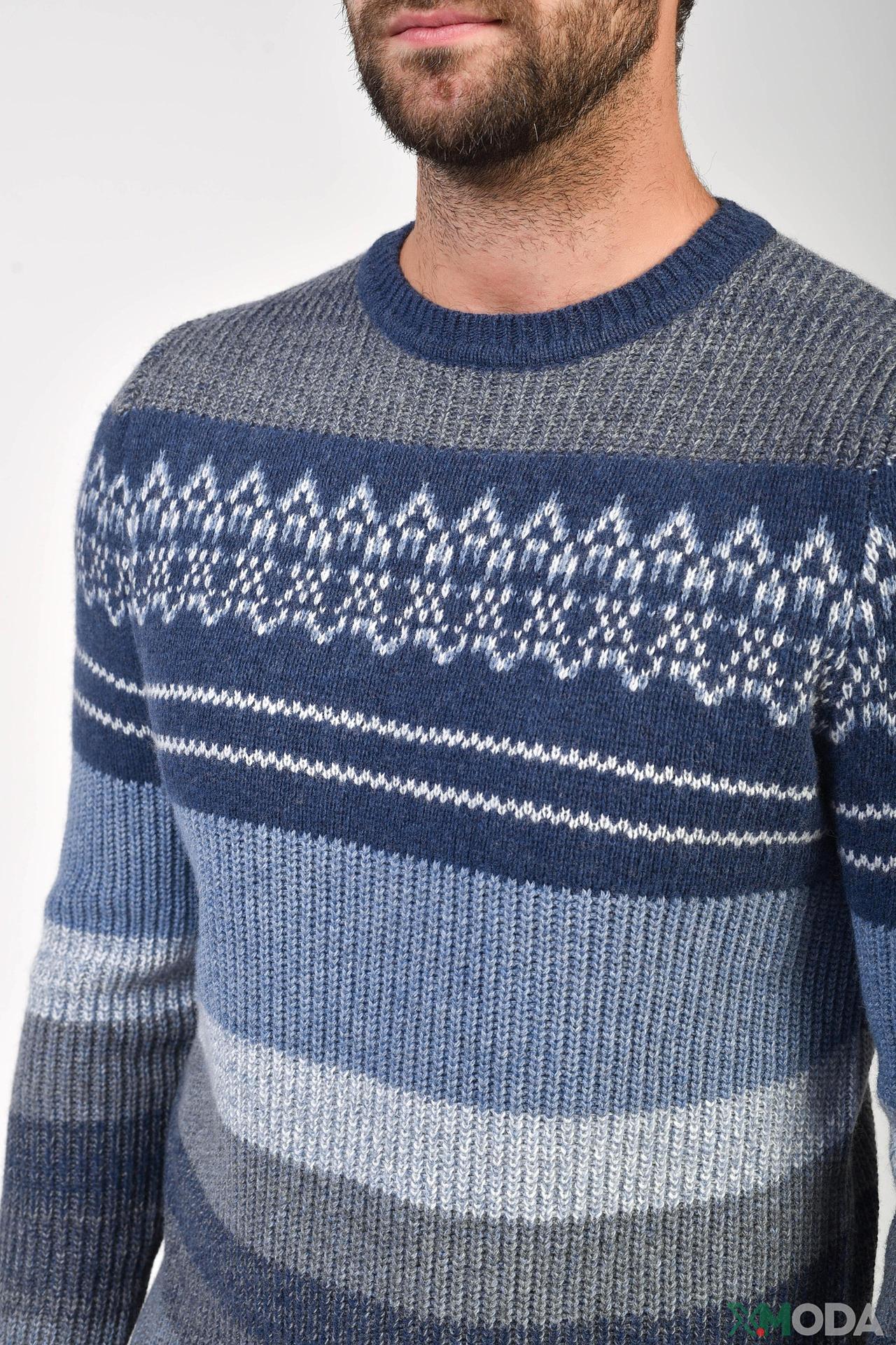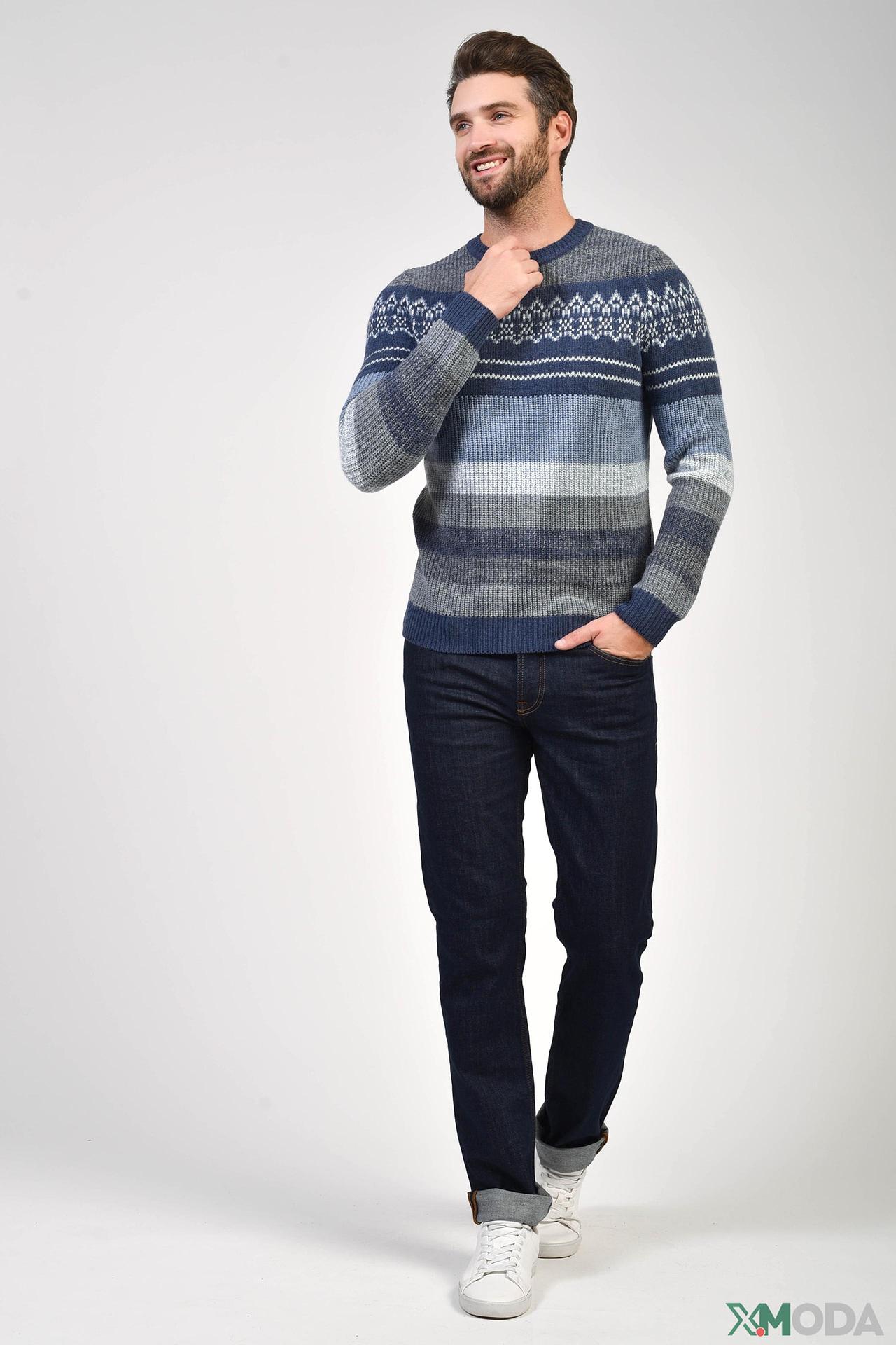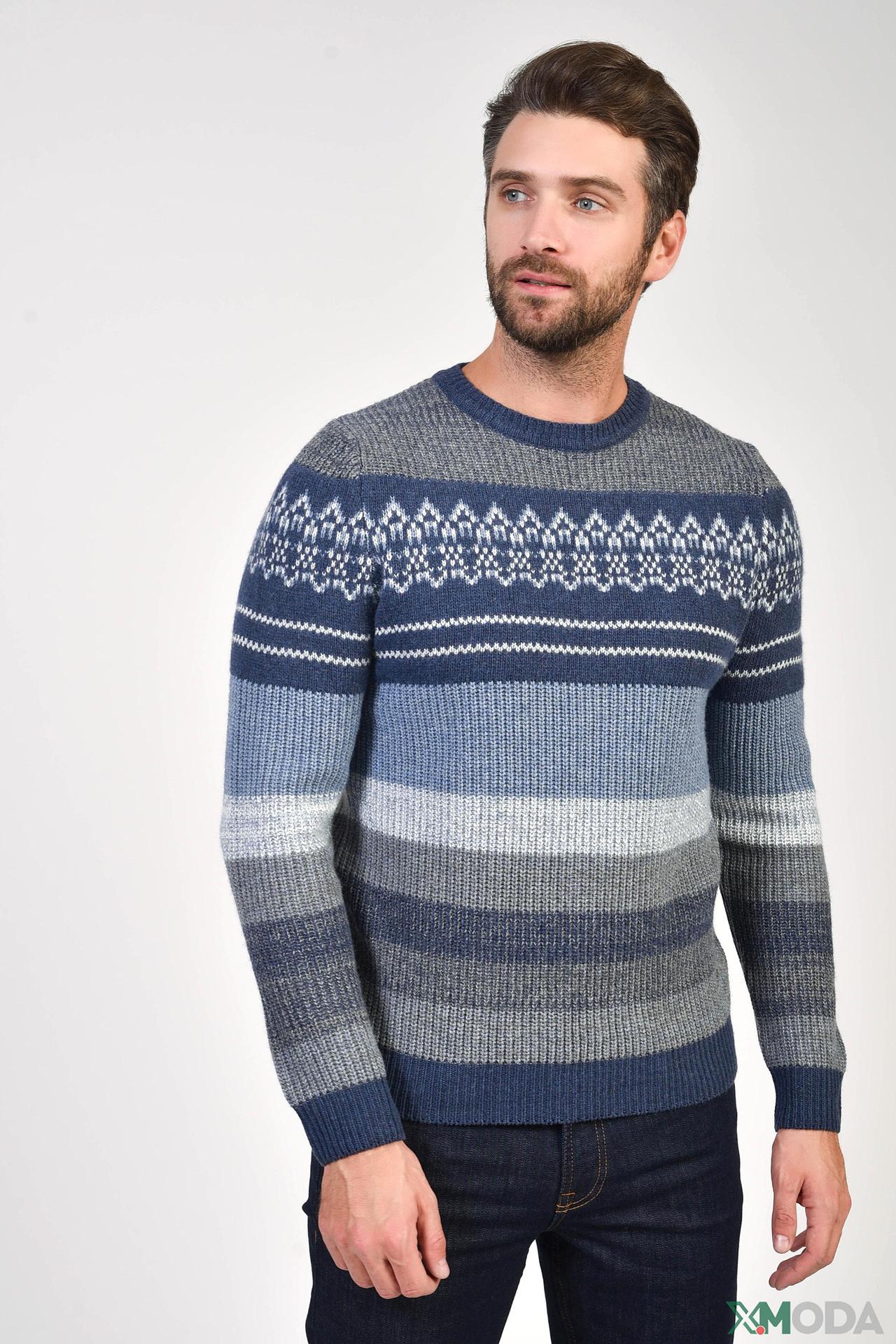 - Дизайн: Классический джемпер с круглым вырезом и узором в стиле "норвежский". Полосатый принт на рукавах и нижней части изделия создает современный вид.