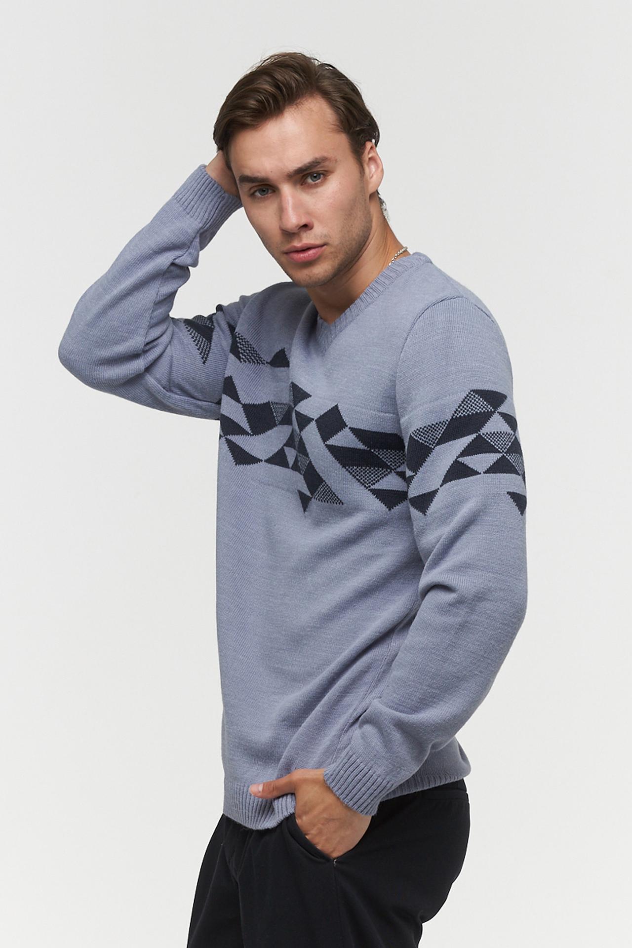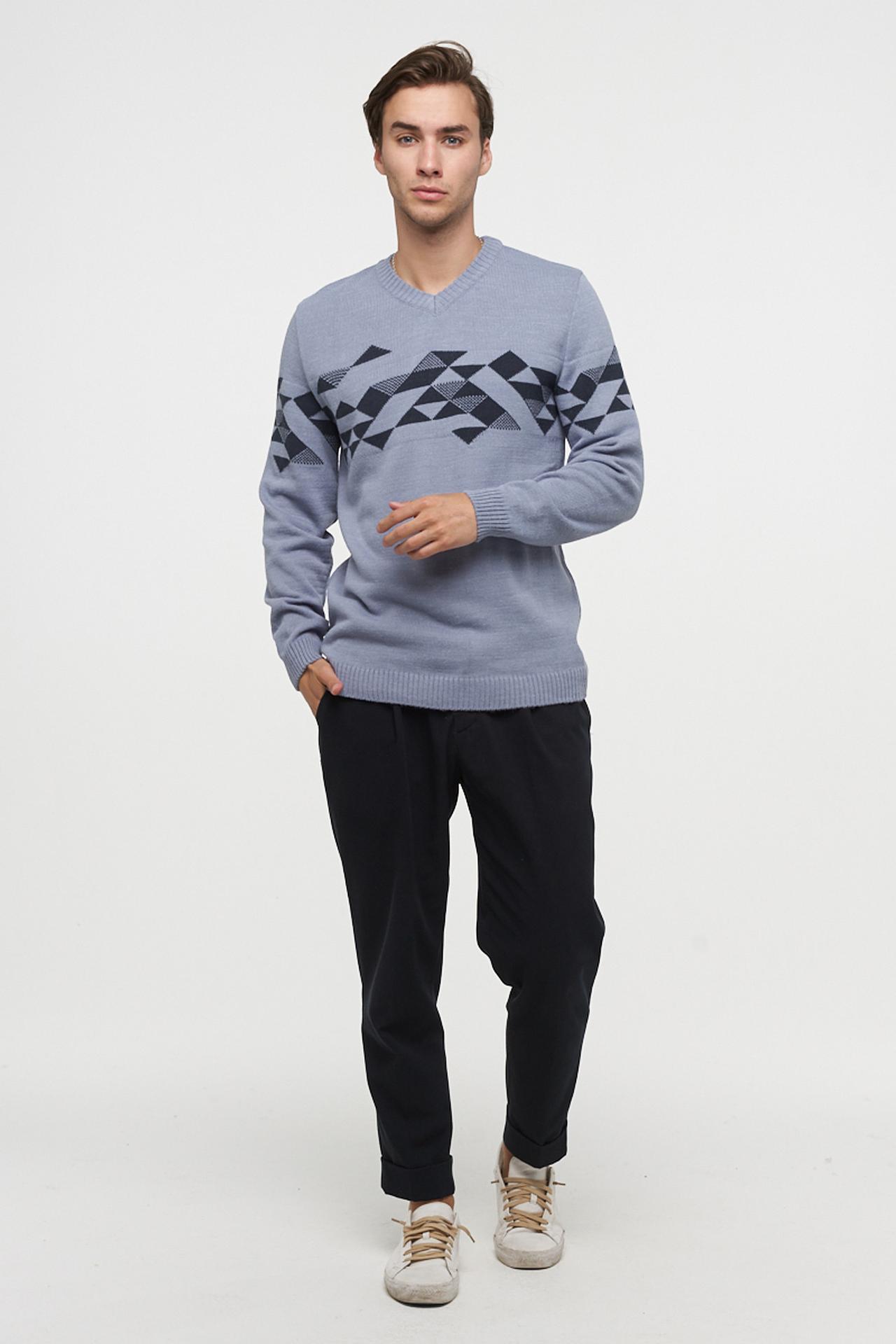 Голубой джемпер с V-образным вырезом станет прекрасным дополнением к вашему гардеробу. Он легко сочетается с различными элементами одежды, позволяя создавать как повседневные, так и более нарядные образы. Геометрический узор добавляет изюминку и оригинальность.