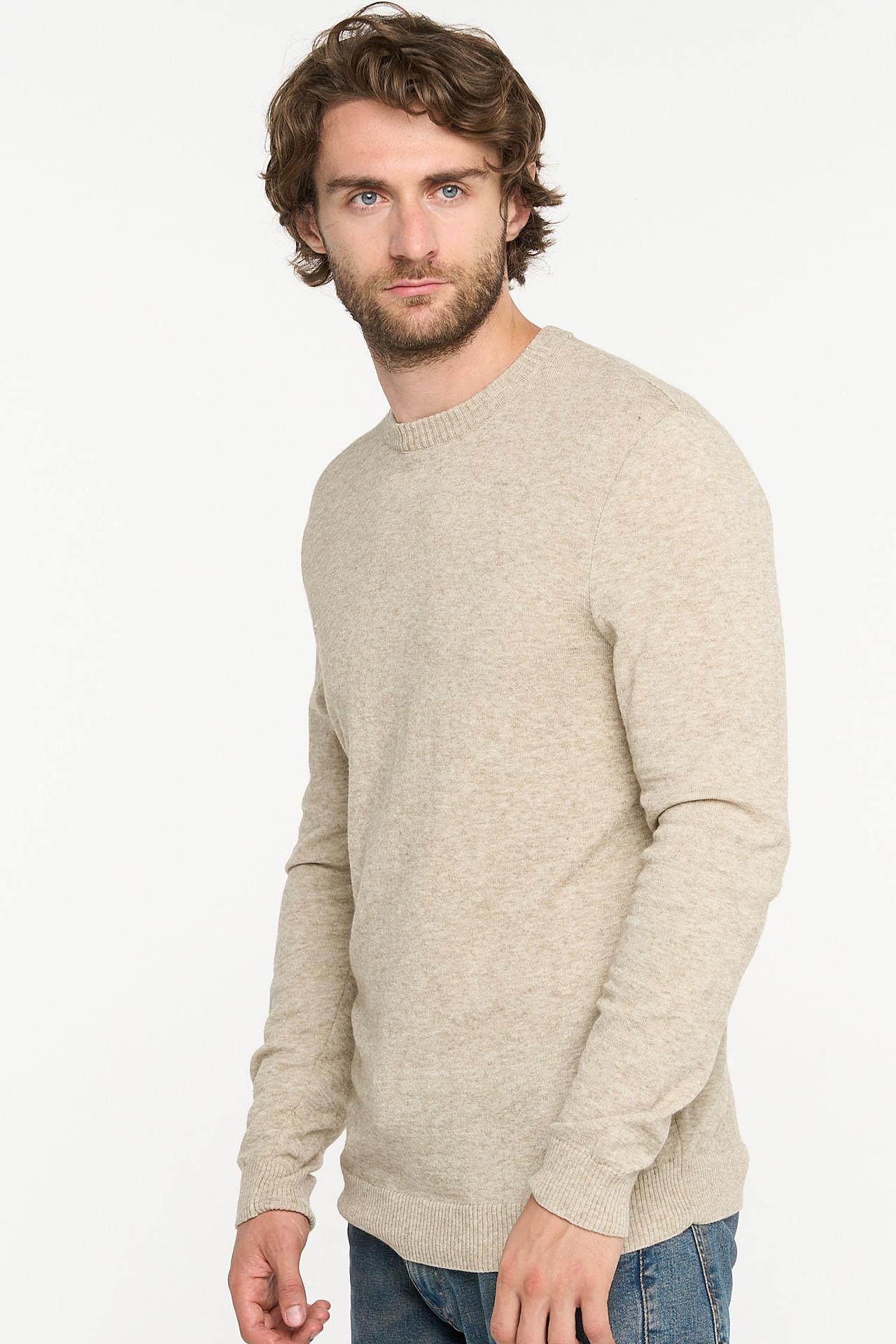 - Универсальный стиль: Классический круглый вырез и нейтральный бежевый цвет позволяют легко комбинировать джемпер с джинсами, брюками или чиносами, создавая множество актуальных образов для любого случая.