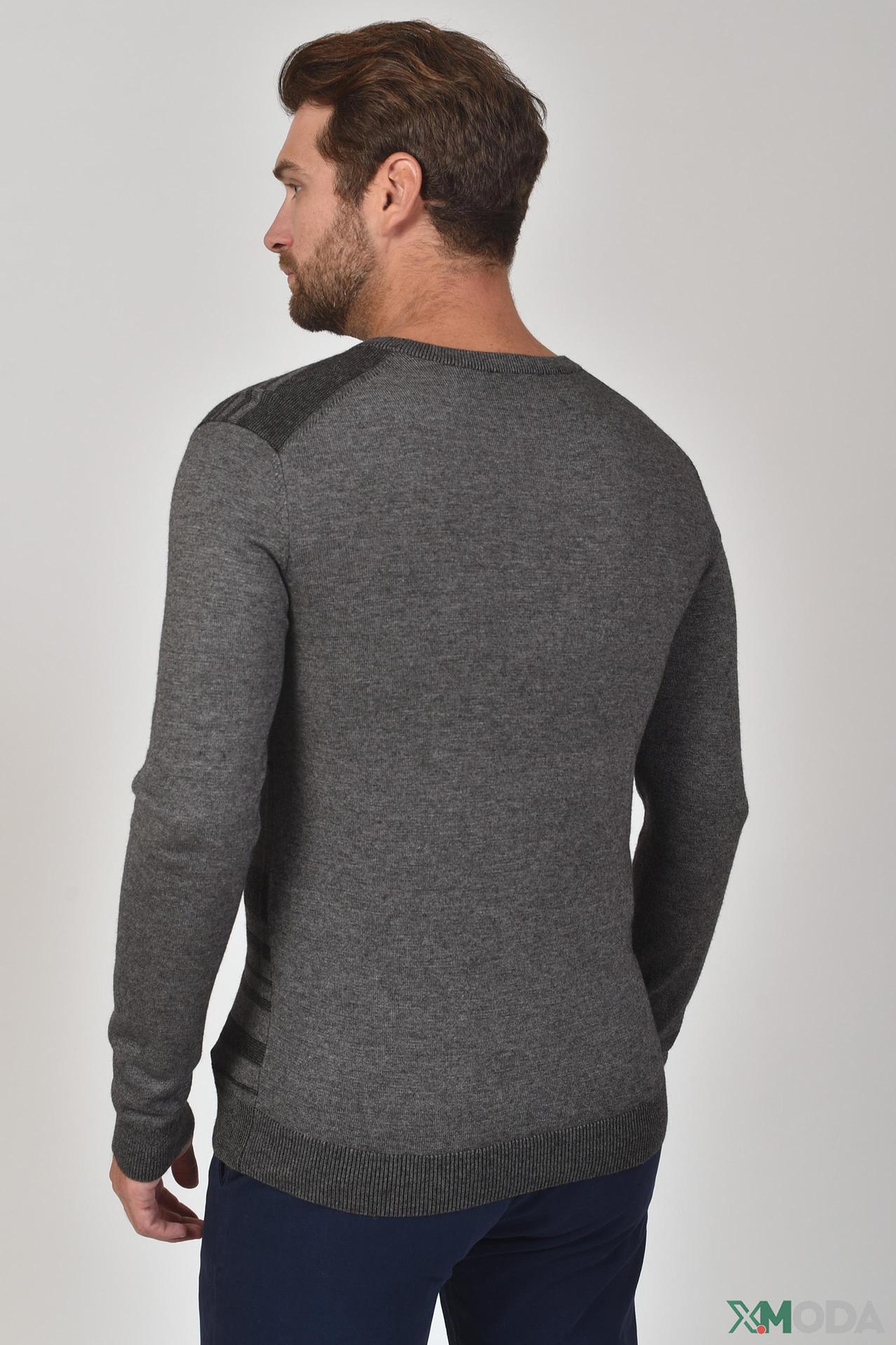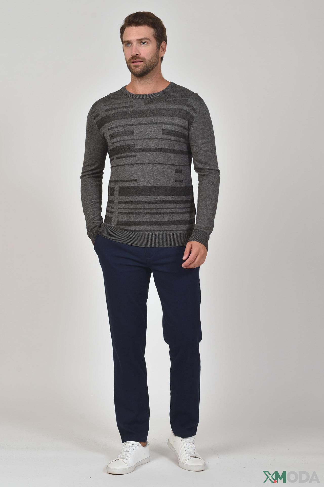- Дизайн: Однотонный серый джемпер с контрастным геометрическим принтом на груди и спине. Круглый вырез горловины и длинные рукава.