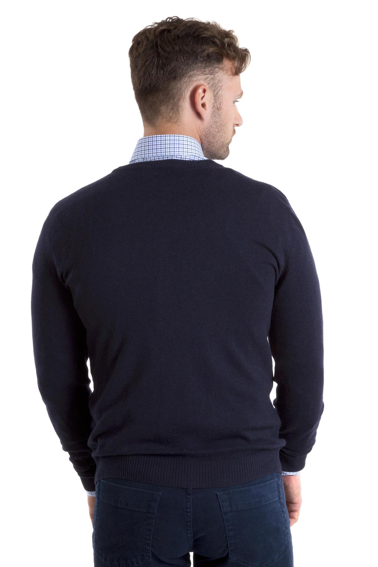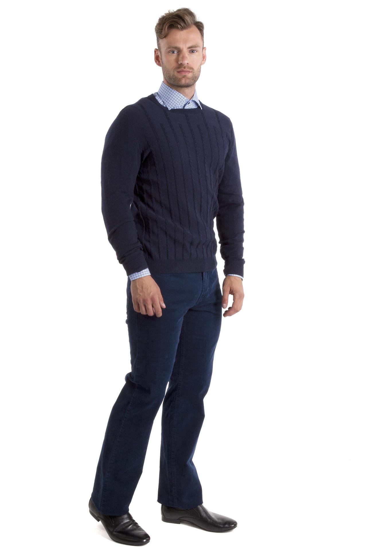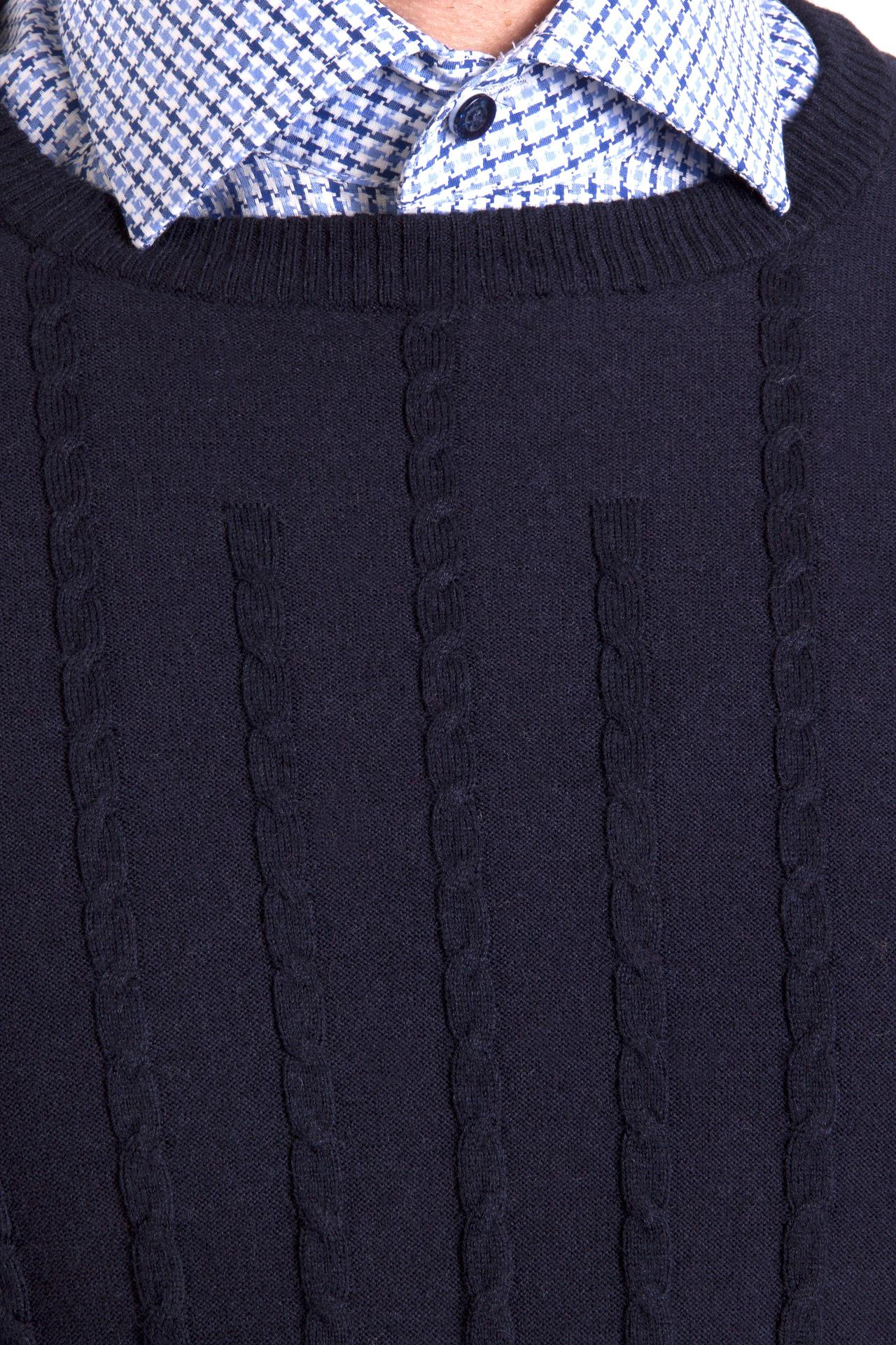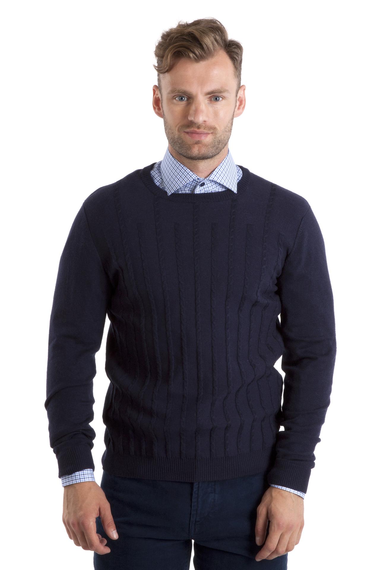 Темно-синий мужской джемпер Pezzo прямого кроя с вязанным фактурным узором. Изделие дополнено круглым вырезом. Ворот, манжеты и нижний кант оформлены трикотажной резинкой.