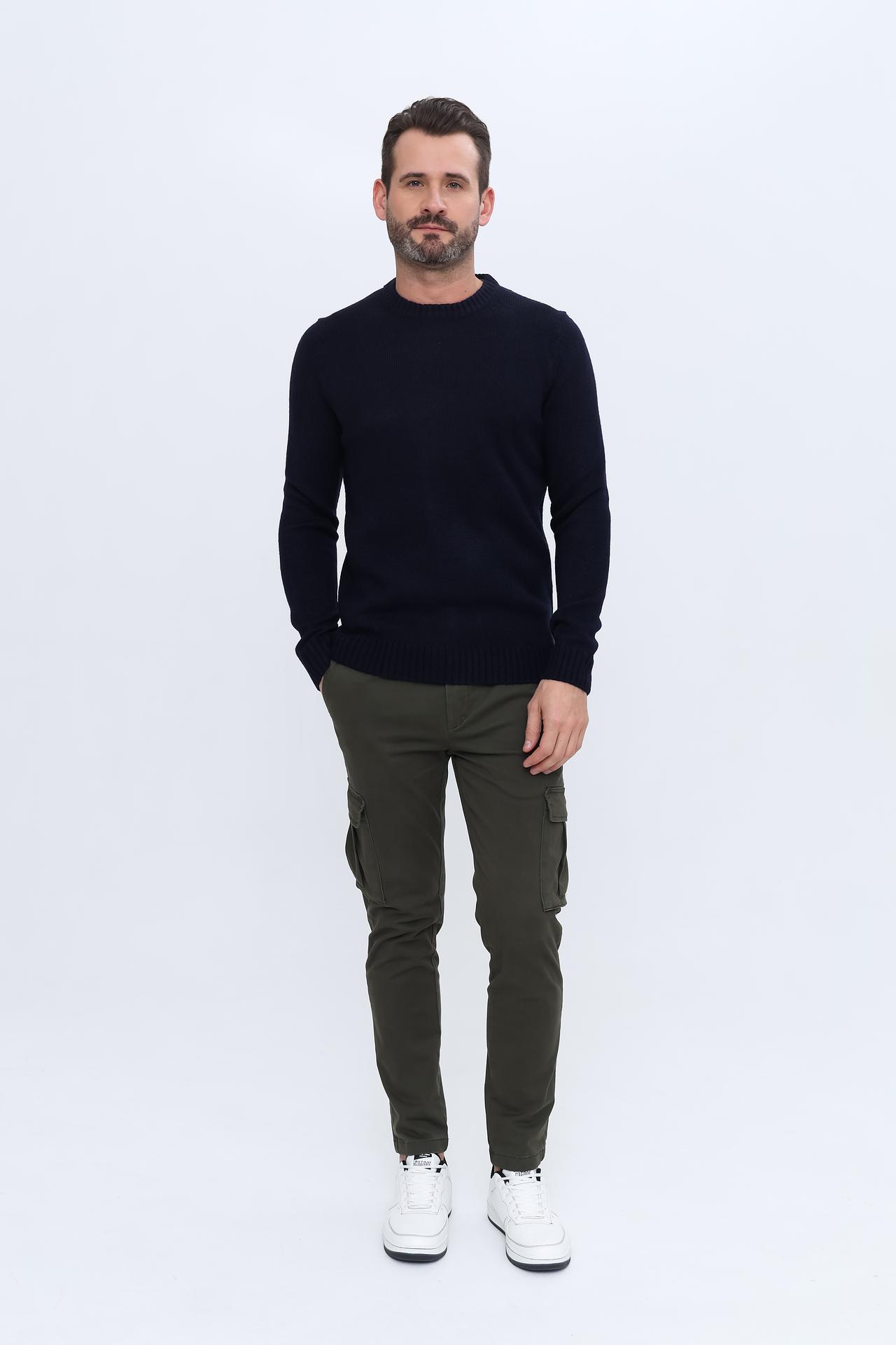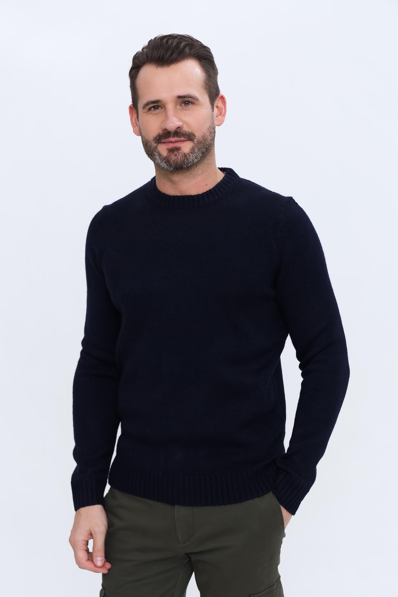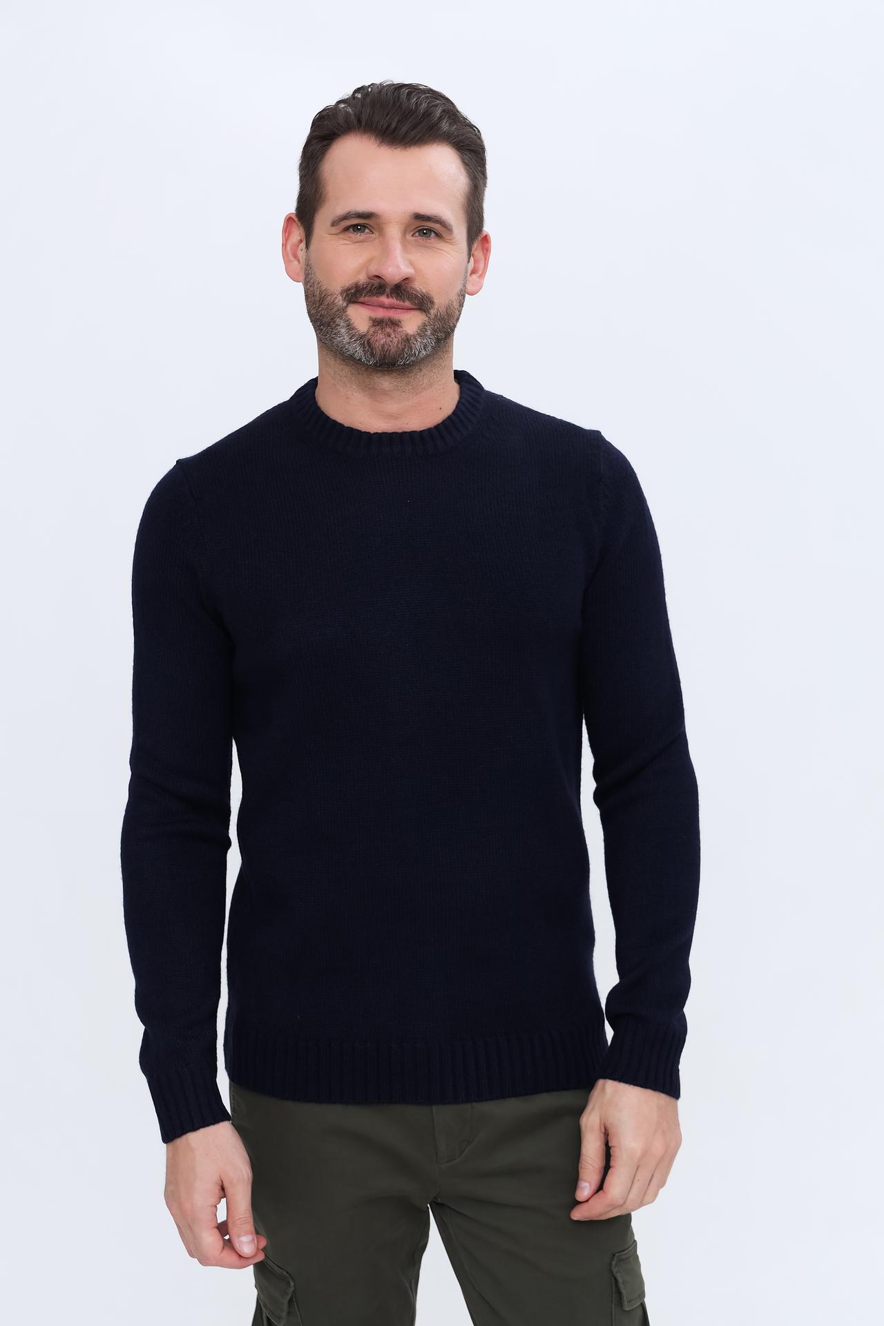 - Классический дизайн. Однотонный тёмно-синий цвет и универсальный круглый вырез горловины позволяют легко интегрировать пуловер в деловой или повседневный стиль.
