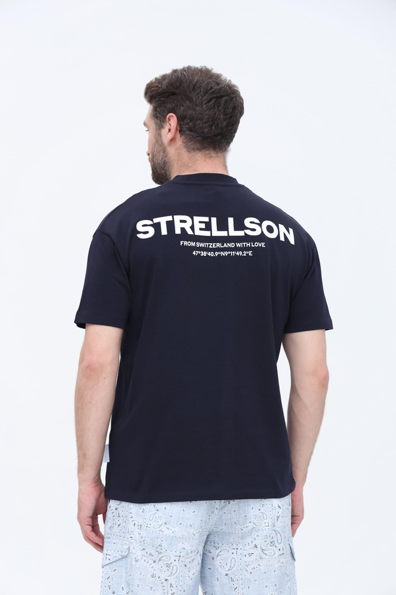Стильная темно-синяя футболка Strellson, выполненная из 100% хлопка, идеально подходит для создания комфортных и актуальных образов. Классический прямой крой и высокое качество материала обеспечивают удобство на протяжении всего дня. На спинке футболки расположен оригинальный принт с названием бренда и координатами, что добавляет изделию индивидуальности и характера. Эта футболка станет универсальным дополнением к вашему повседневному гардеробу, легко сочетаясь с джинсами, шортами или брюками.