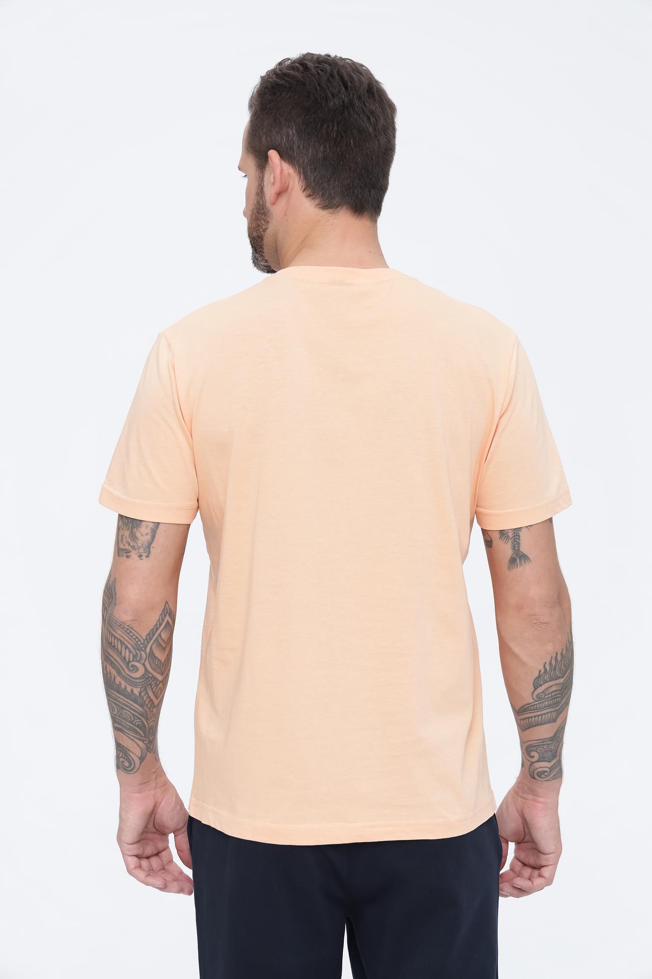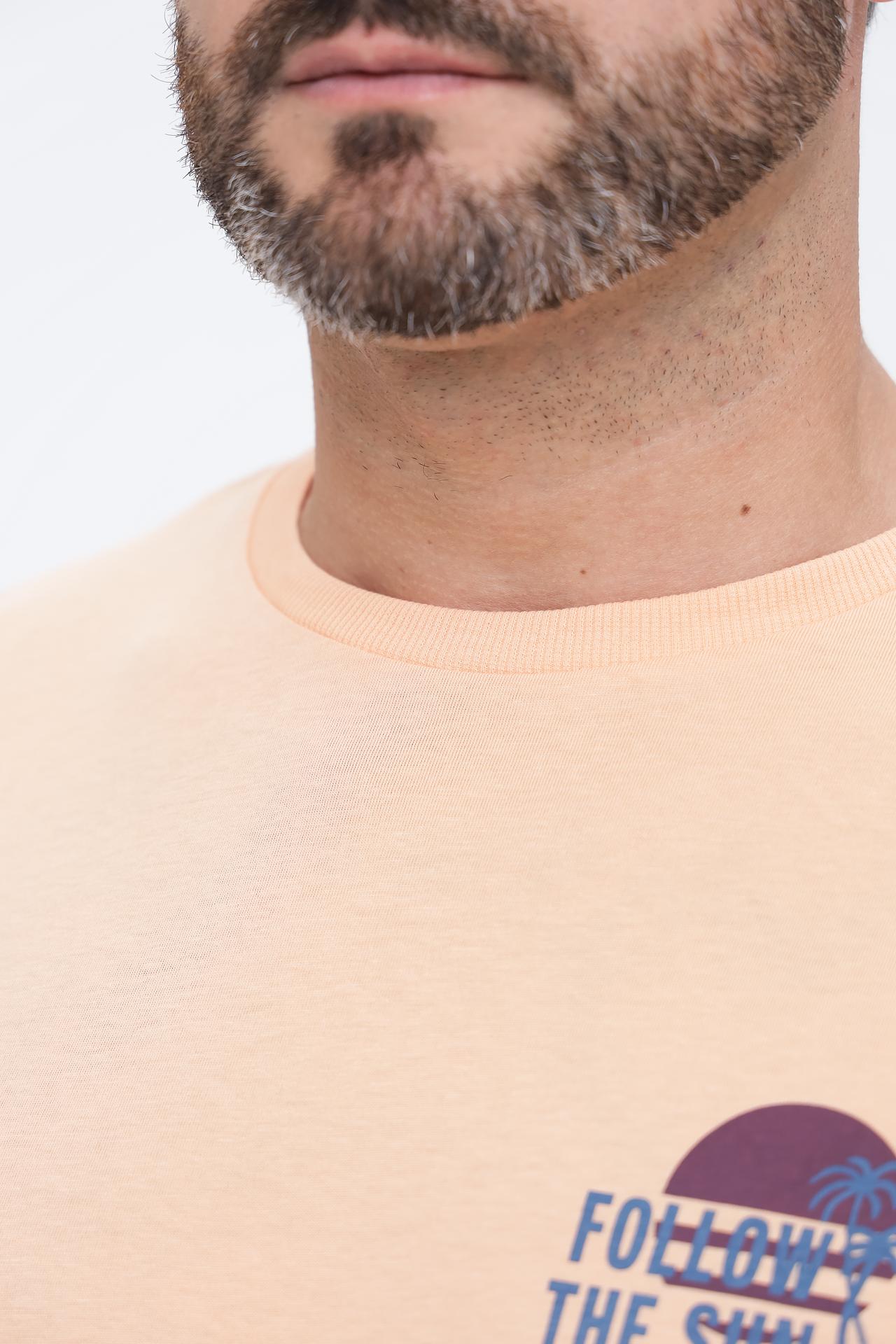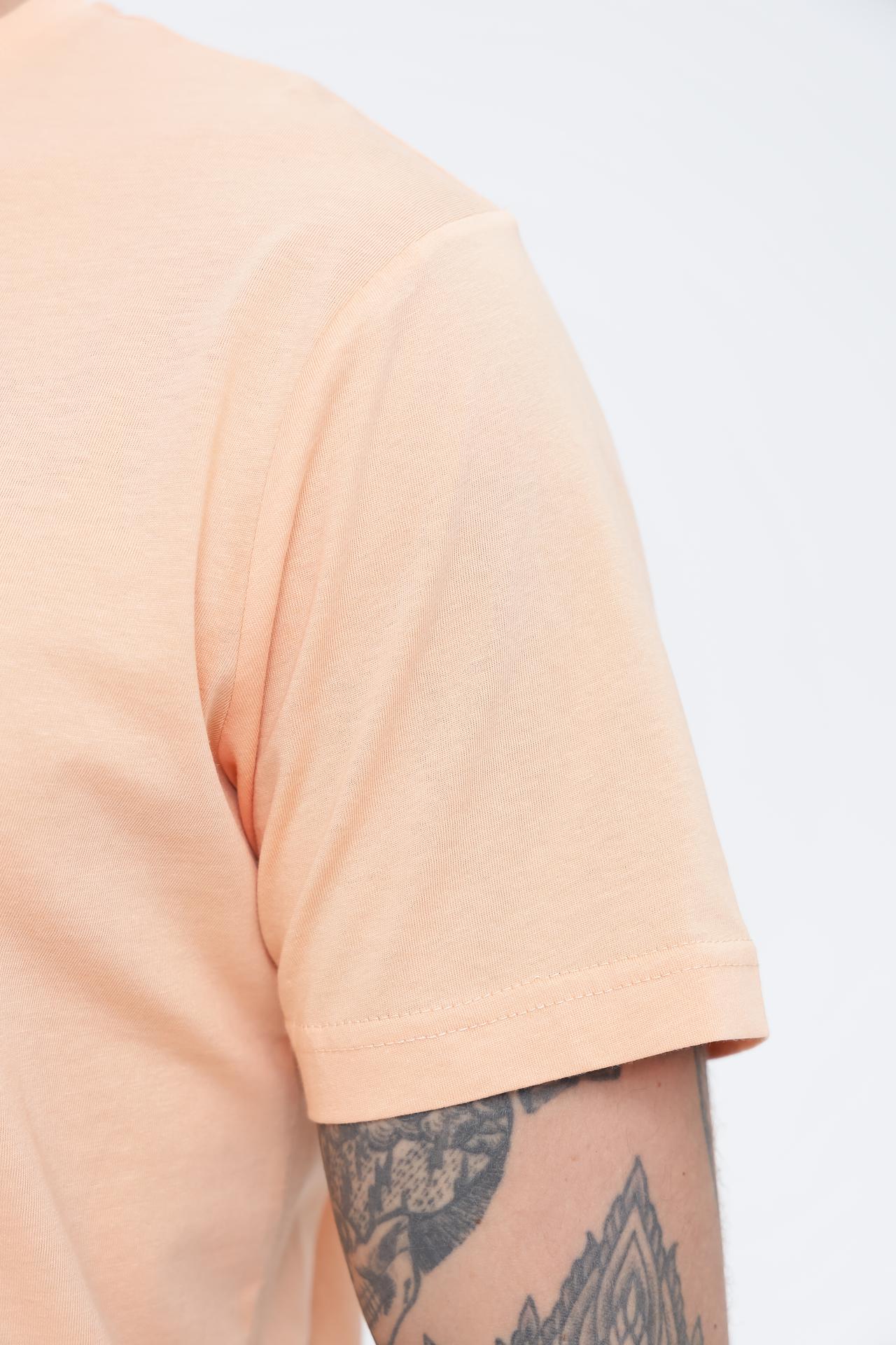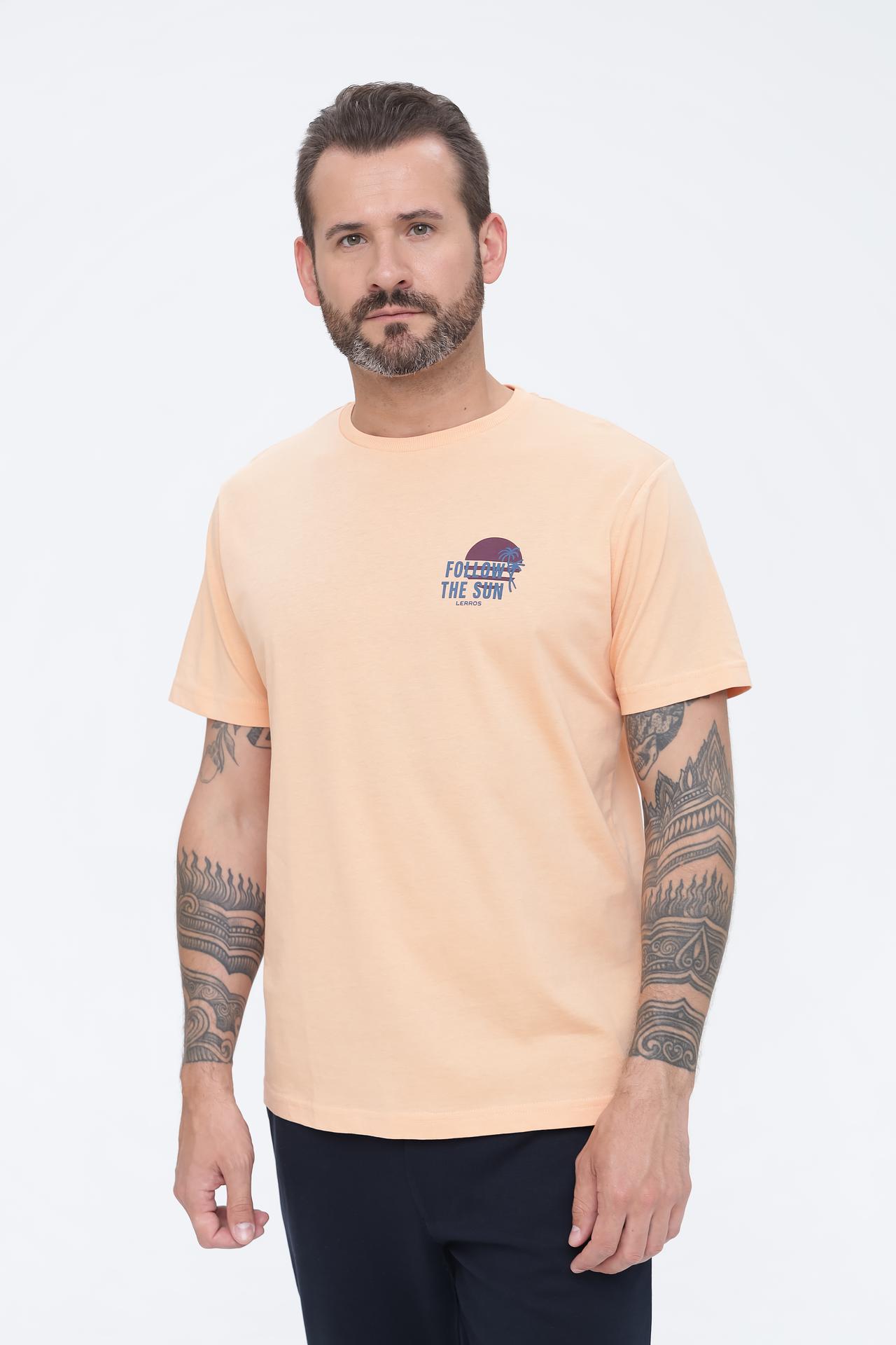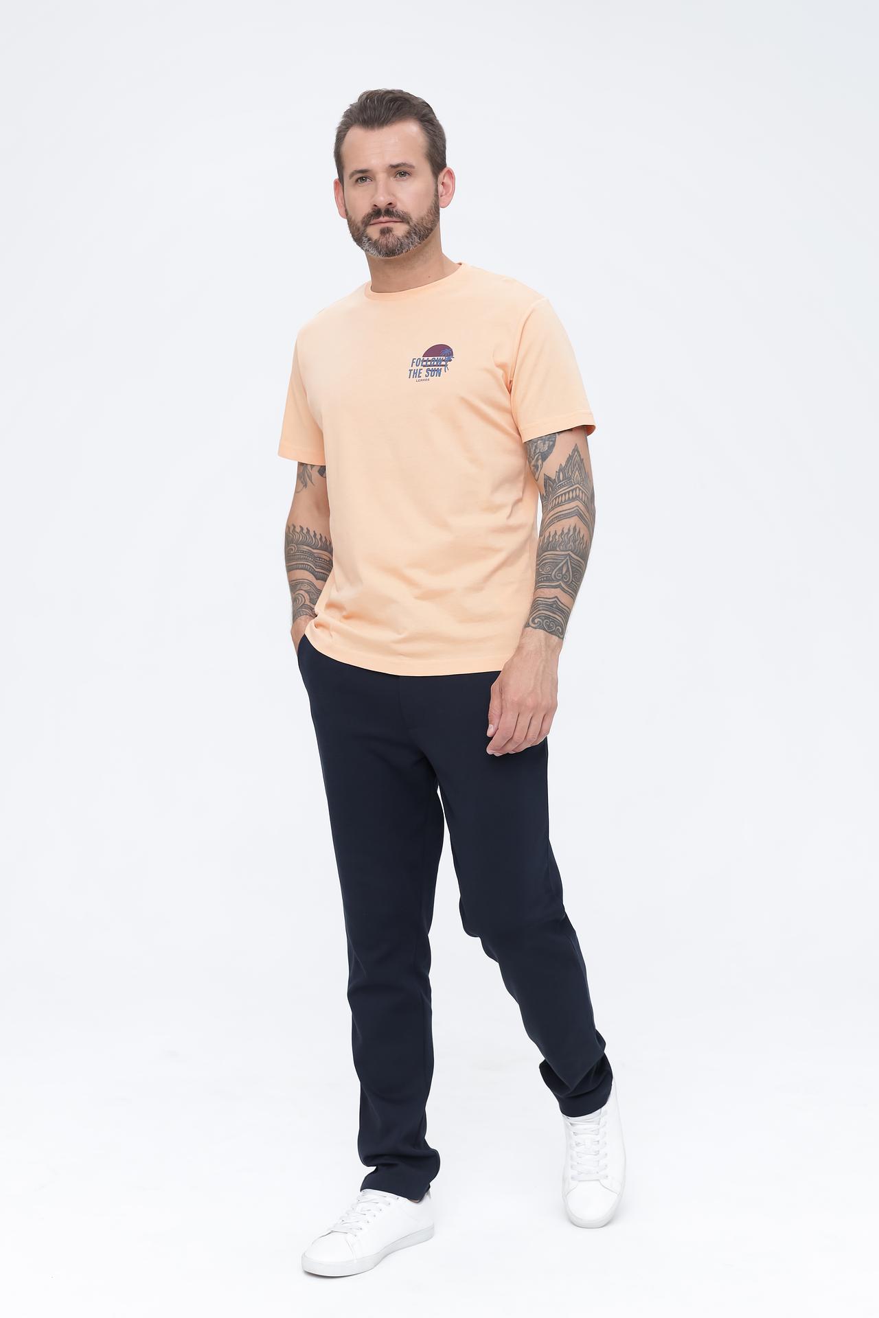 Футболка идеально сочетается с джинсами, шортами или спортивными брюками, что делает ее универсальным элементом гардероба. Приобретите эту футболку, чтобы подчеркнуть свой стиль и ощутить комфорт на протяжении всего дня. Футболка мужская, летняя футболка, футболка с принтом, стильная футболка, хлопковая футболка, персиковая футболка.