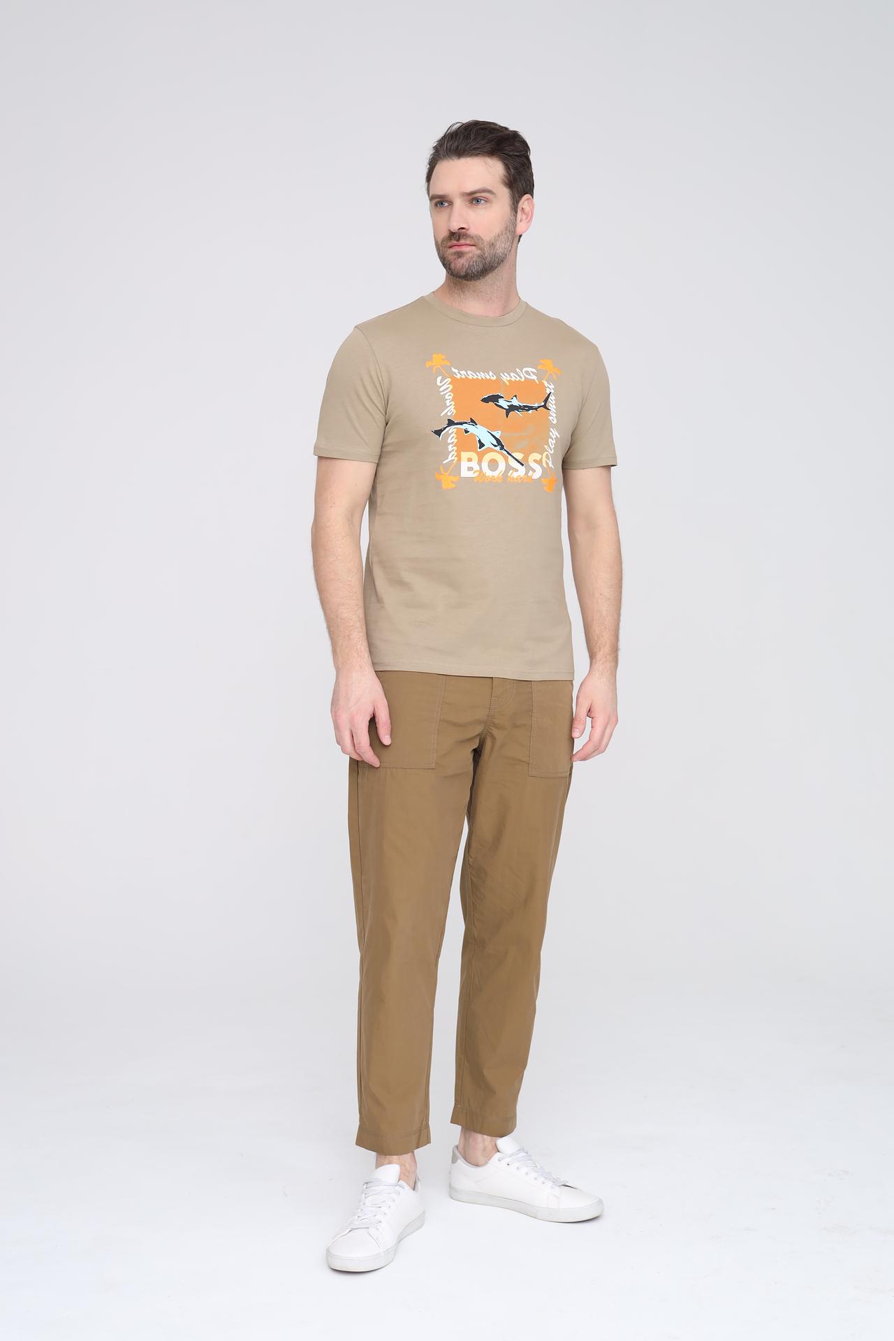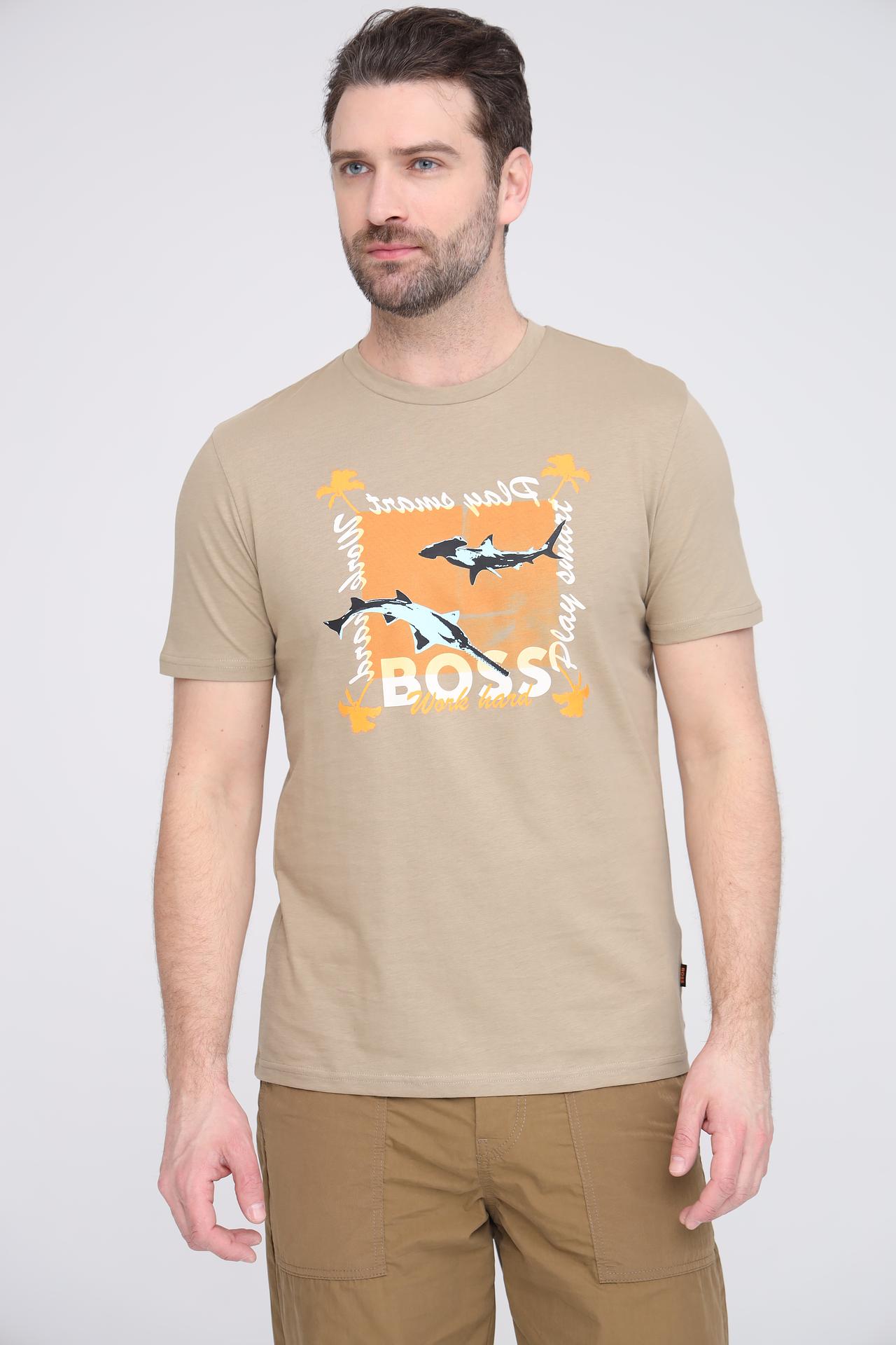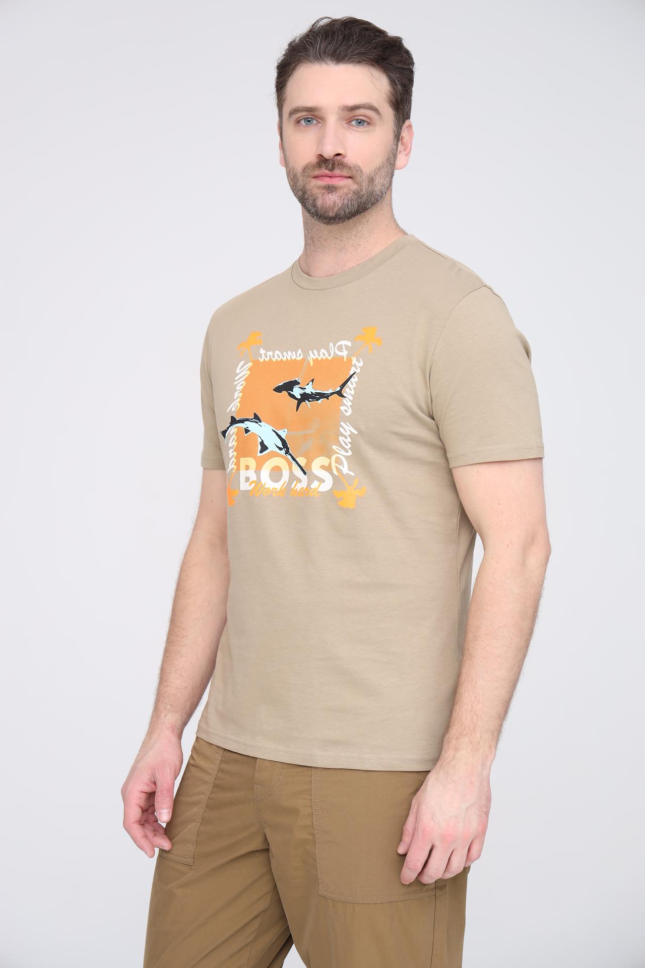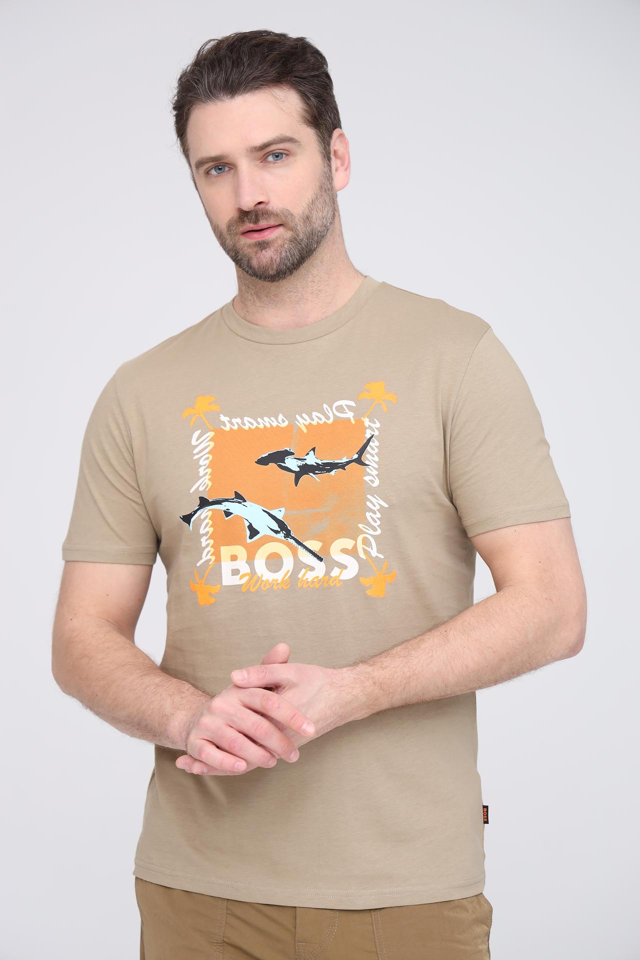 Дизайн футболки Boss Orange выделяет её среди других. Яркий принт с изображением акул и надписями, делают эту футболку ярким акцентом в вашем гардеробе. Классический круглый вырез и короткие рукава обеспечивают универсальность и легкость в сочетании с различными элементами одежды.