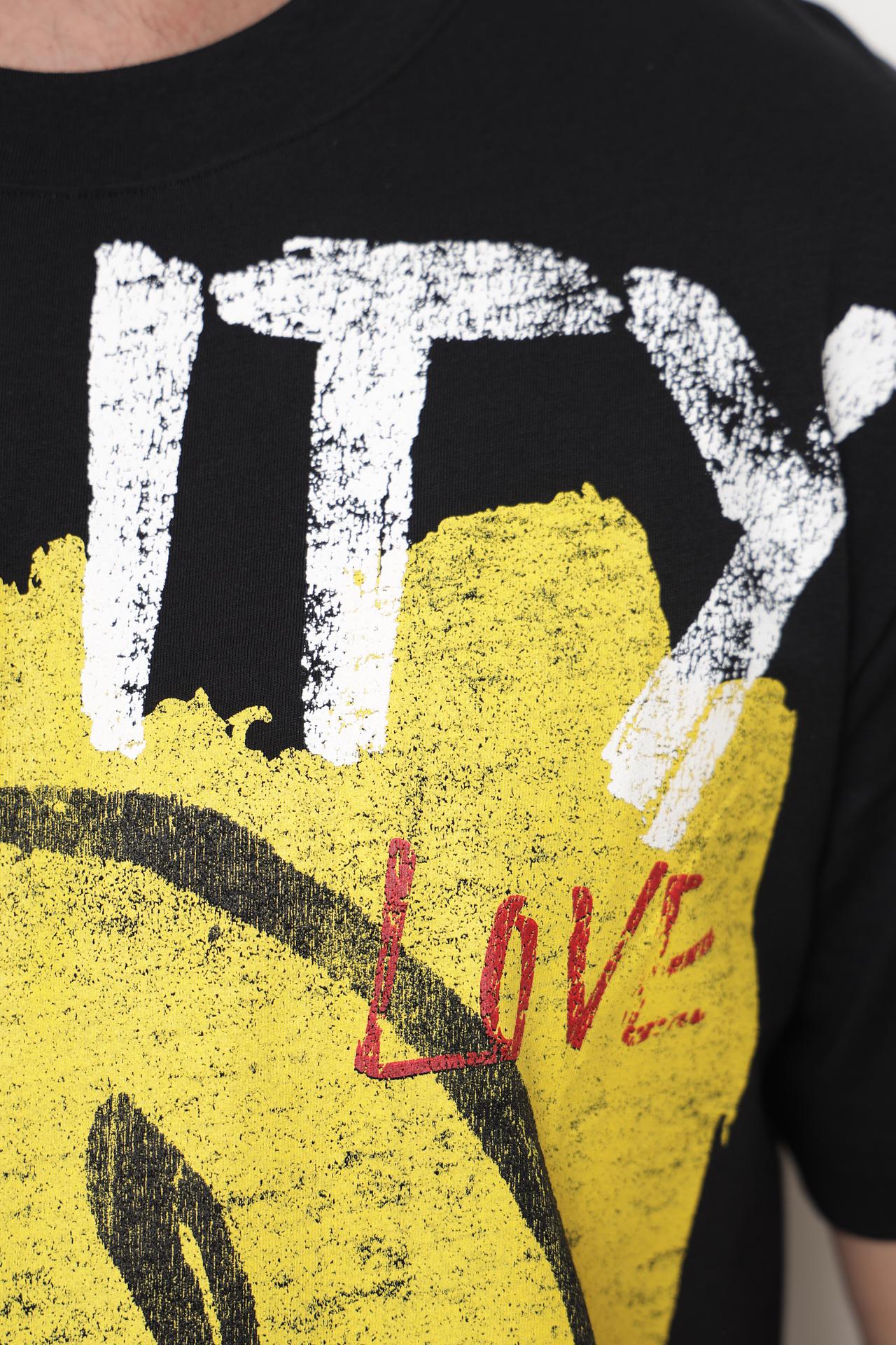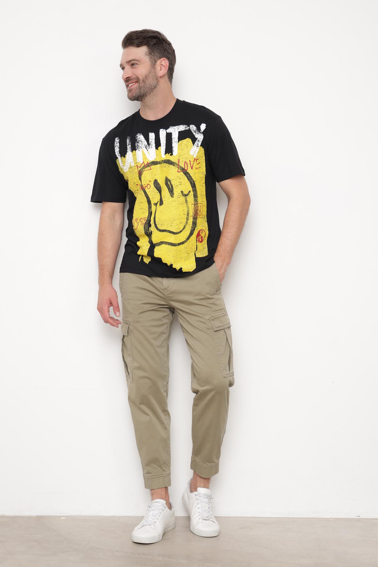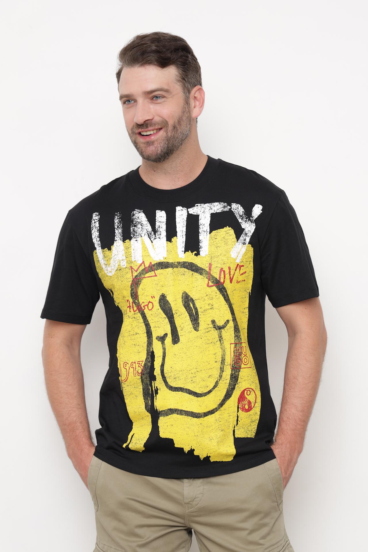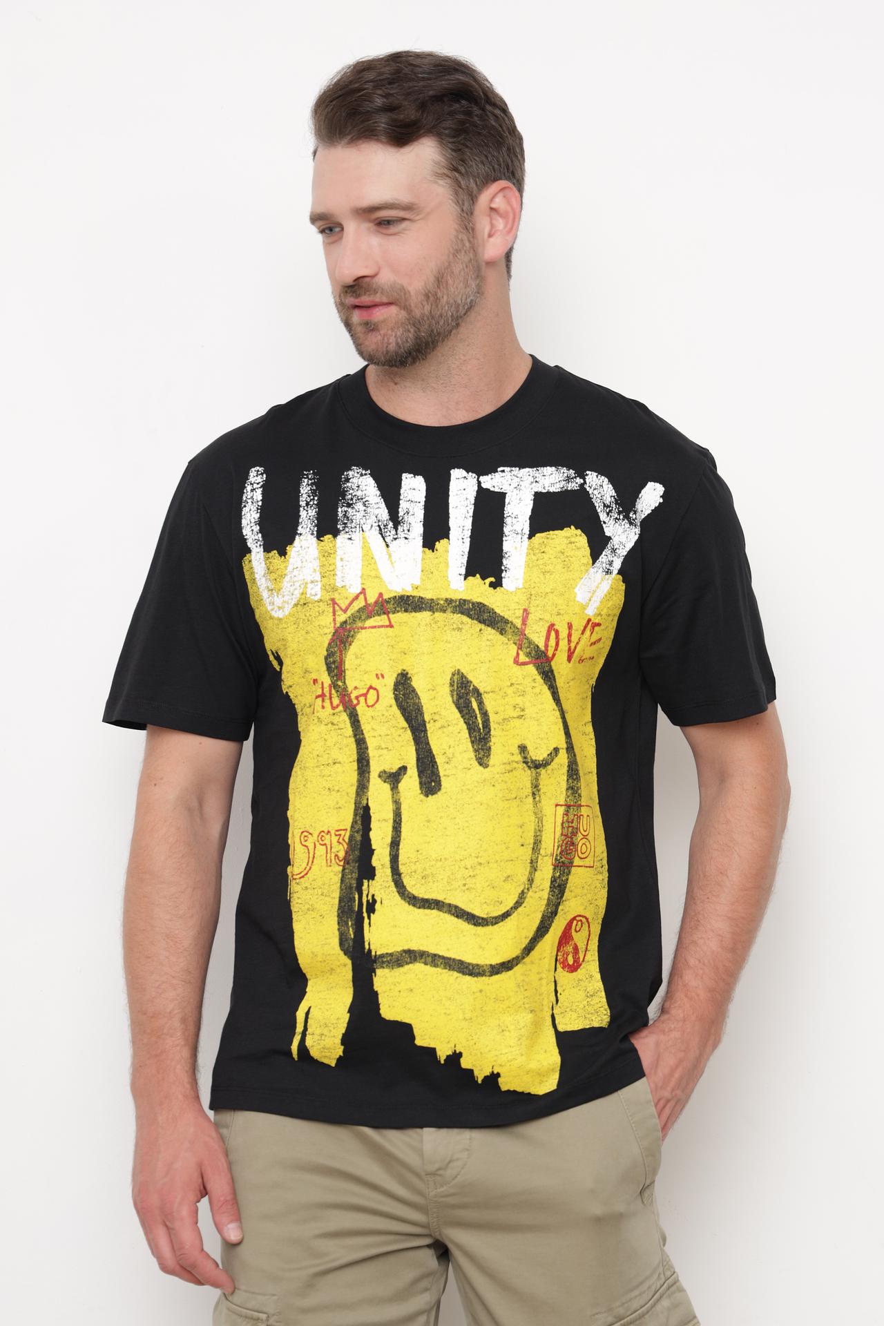 - Яркий дизайн. Изделие украшено выразительным графическим принтом в стиле граффити, включающим надпись "UNITY" и оригинальный смайлик. Этот эффектный декор придает футболке уникальный и смелый характер.