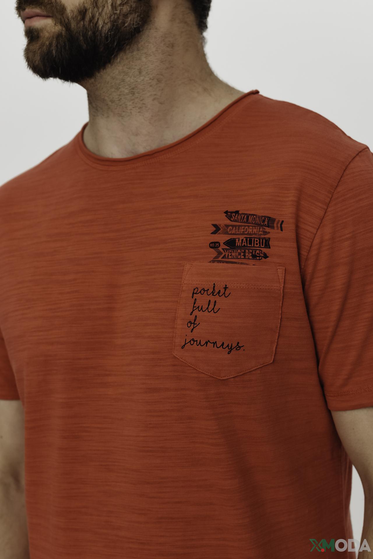 - Стильный дизайн: Классический крой и насыщенный красный цвет с легким меланжевым эффектом делают эту футболку универсальной. Декоративный нагрудный карман с текстовым принтом добавляет модели индивидуальности и современности, подчеркивая ваш вкус.