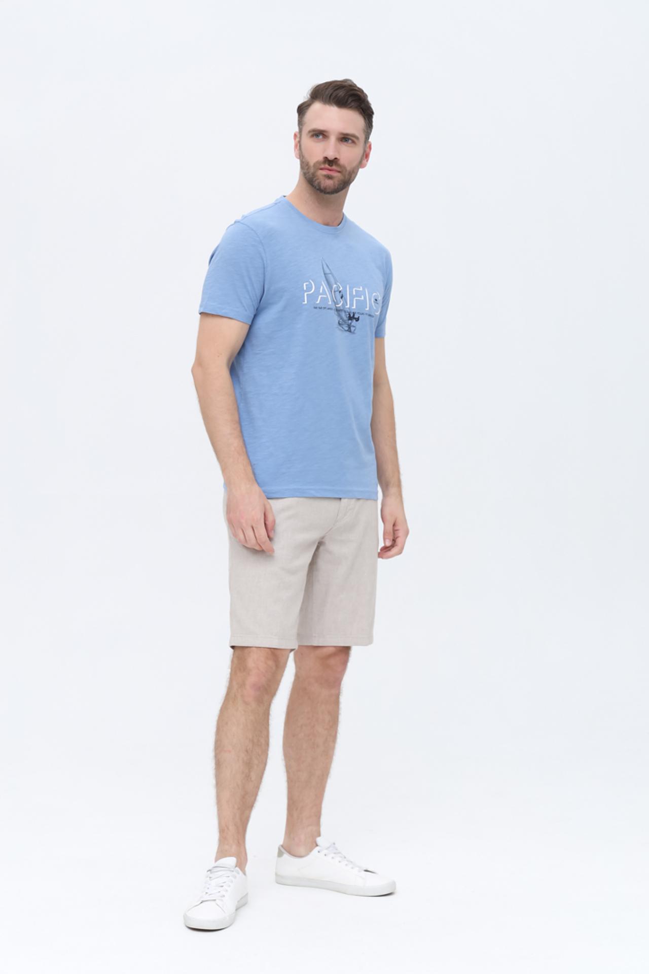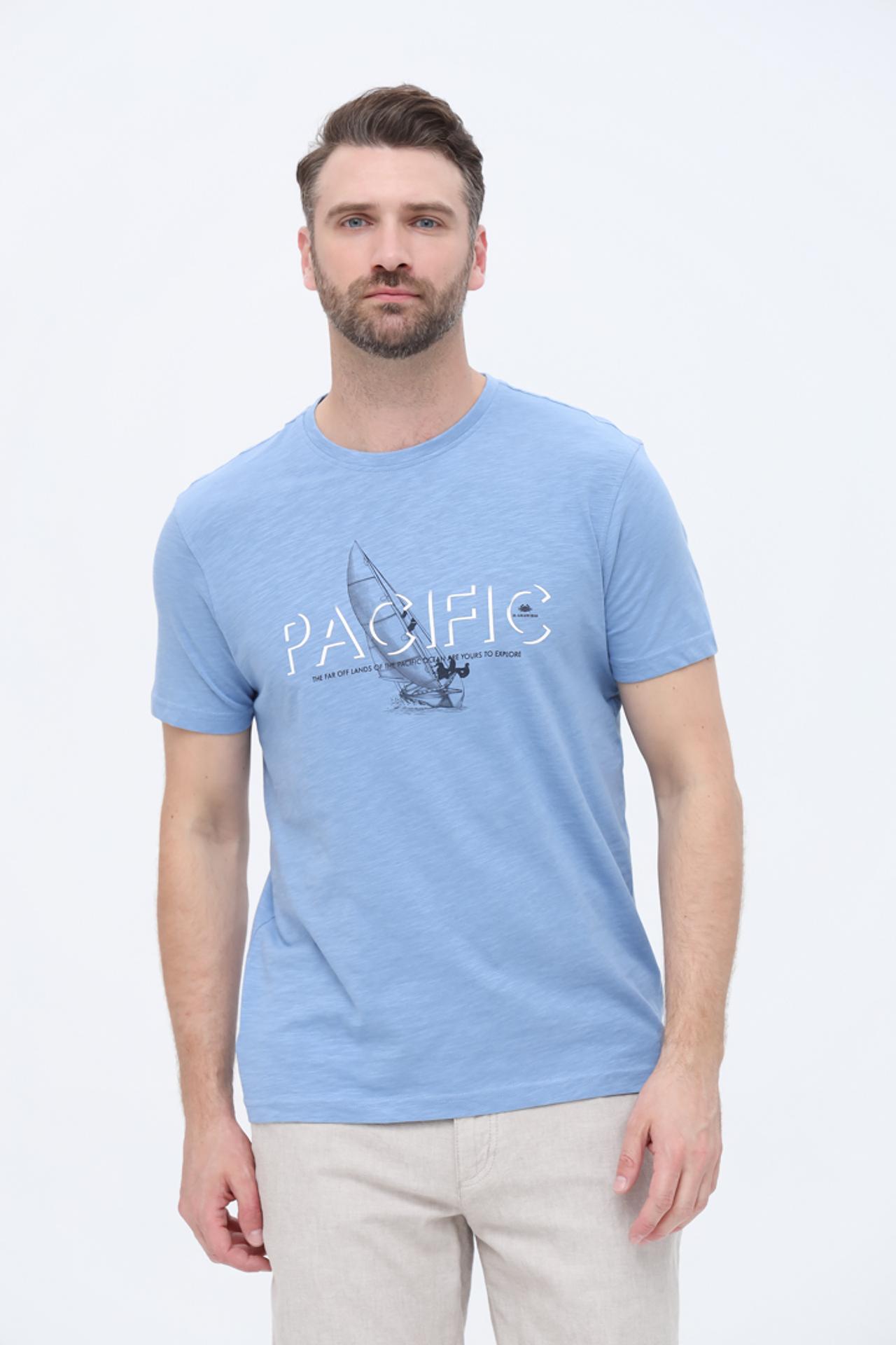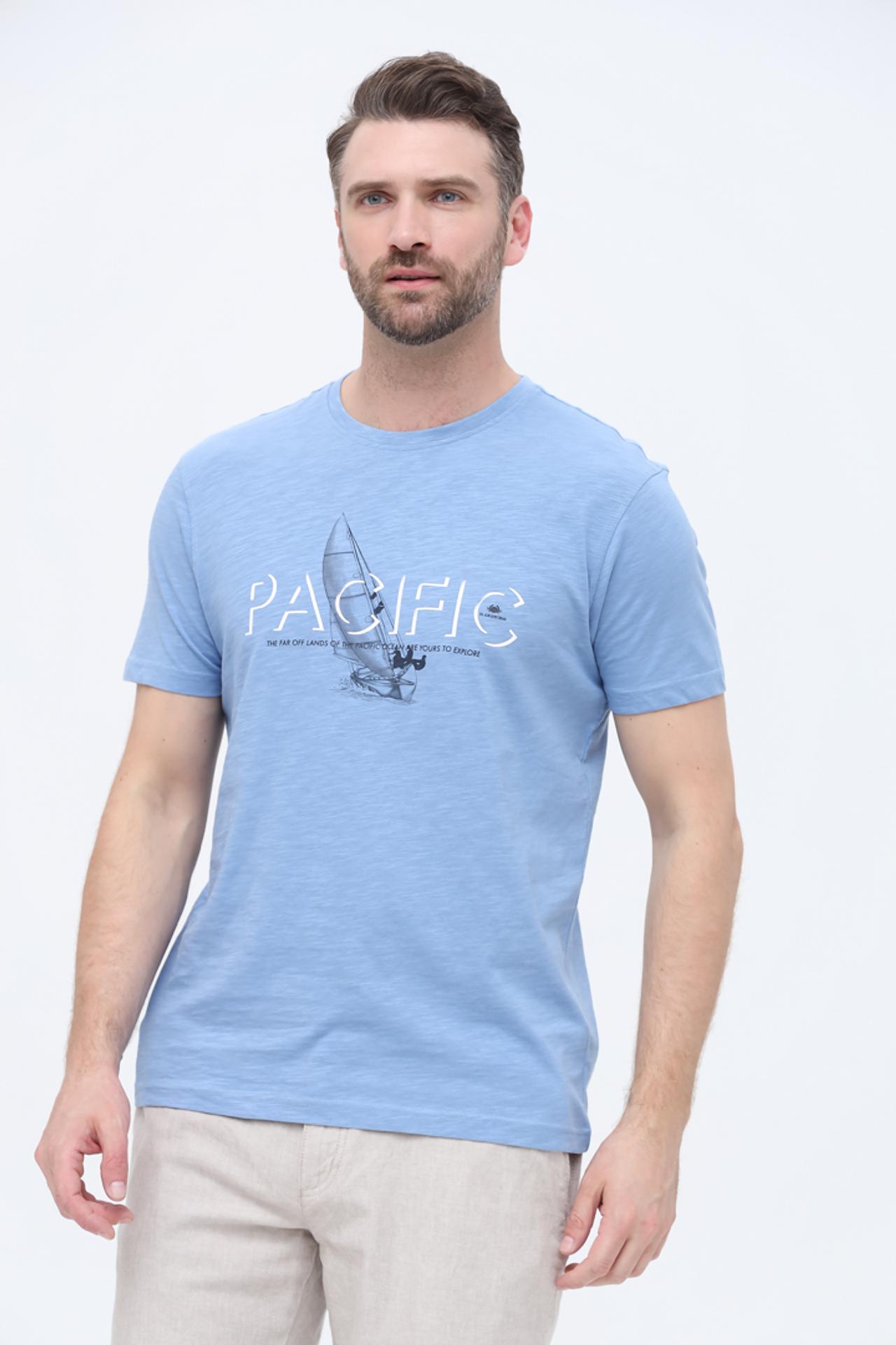 - Стильный дизайн: Модель дополнена оригинальным принтом с изображением парусника и надписью «PACIFIC», что придает изделию морской шарм и индивидуальность. Голубой оттенок подчеркивает свежесть и легкость образа.