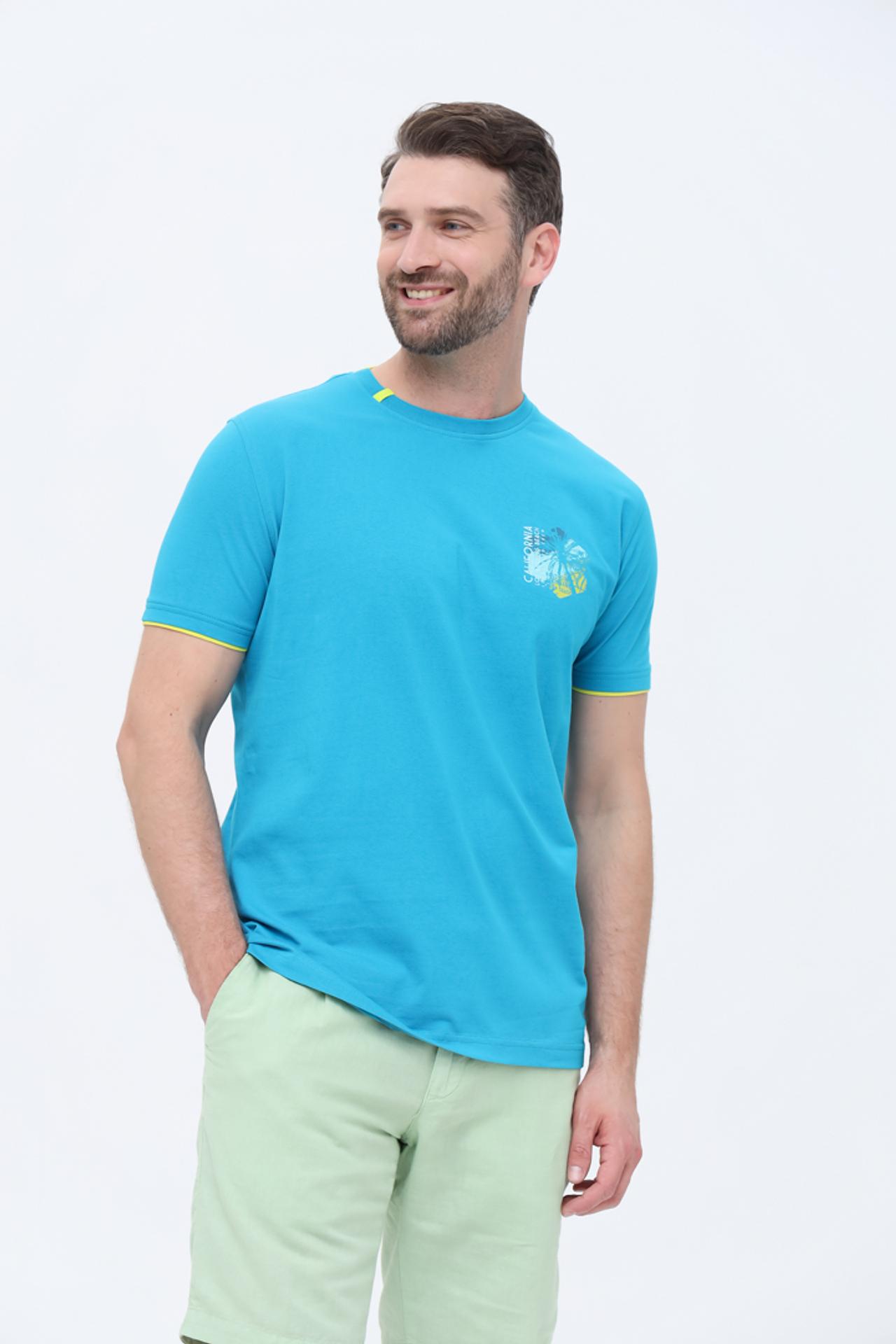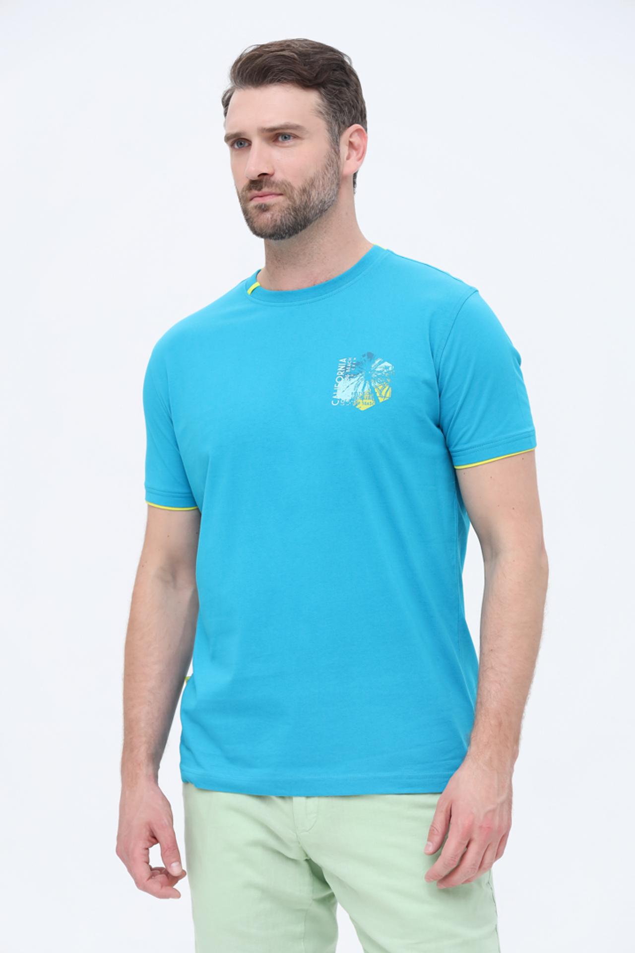 Дизайн футболки продуман до мелочей. Бирюзовый цвет подчеркнет вашу индивидуальность. Дополнительный акцент – принт на груди, который добавит образу оригинальности. Желтые элементы на рукавах и горловине добавляют контраст.