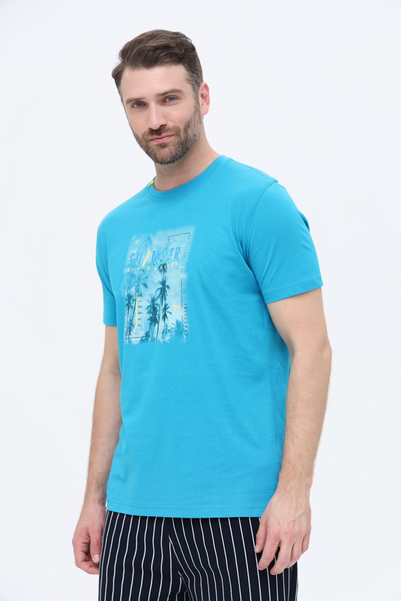 - Яркий дизайн: Насыщенный голубой цвет и оригинальный летний принт с пальмами делают эту мужскую футболку стильной и запоминающейся, подчеркивая индивидуальность.