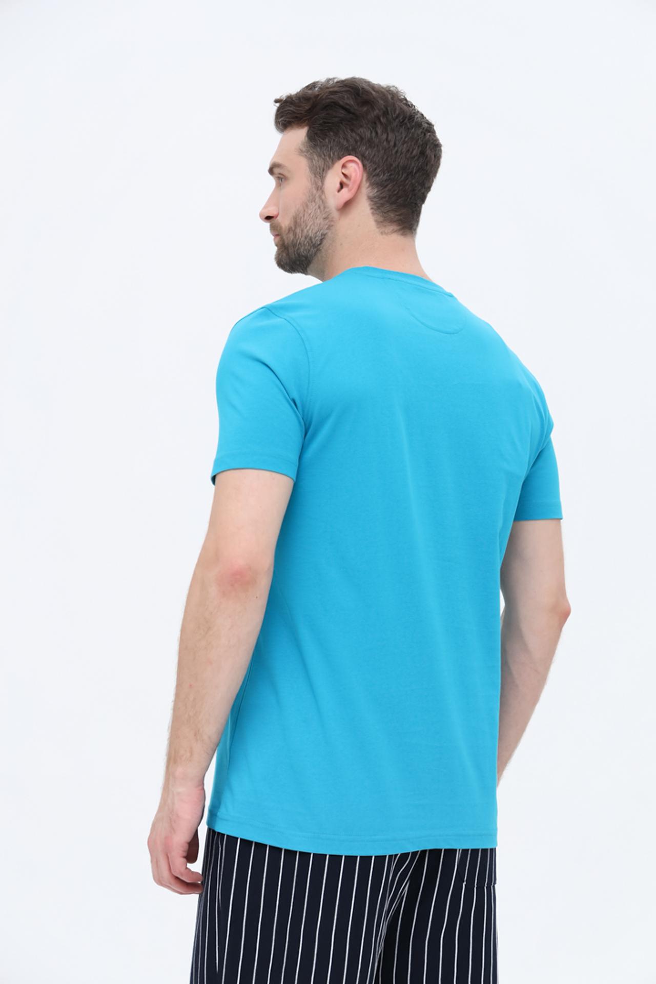 Мужская футболка Sea Barrier, выполненная из 100% высококачественного хлопка, идеальна для летнего сезона. Модель бирюзового цвета украшена стильным летним принтом с изображением пальм и надписью, что придает ей уникальный и расслабленный вид. Отличный выбор для создания комфортных повседневных образов.