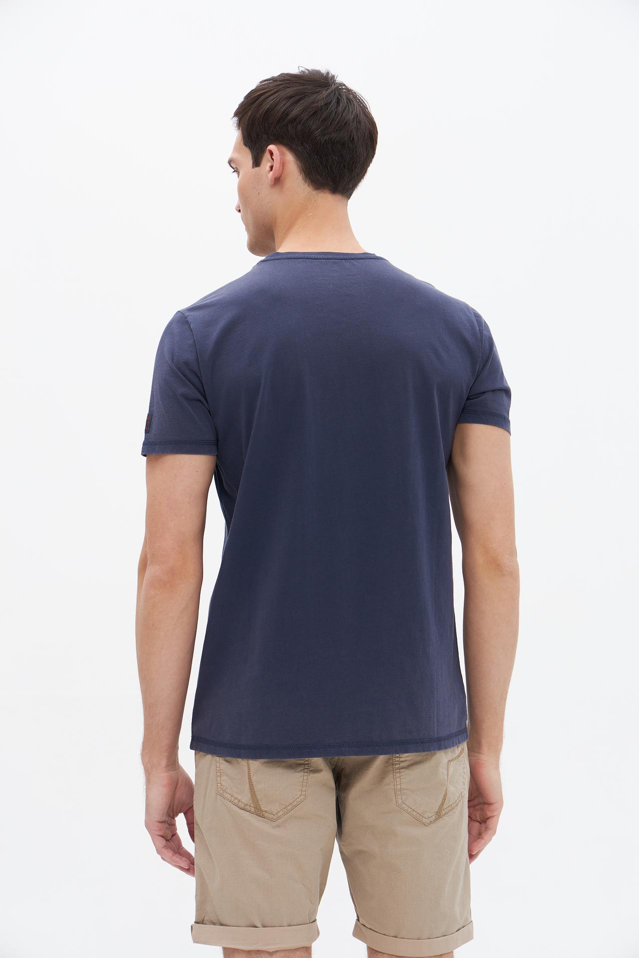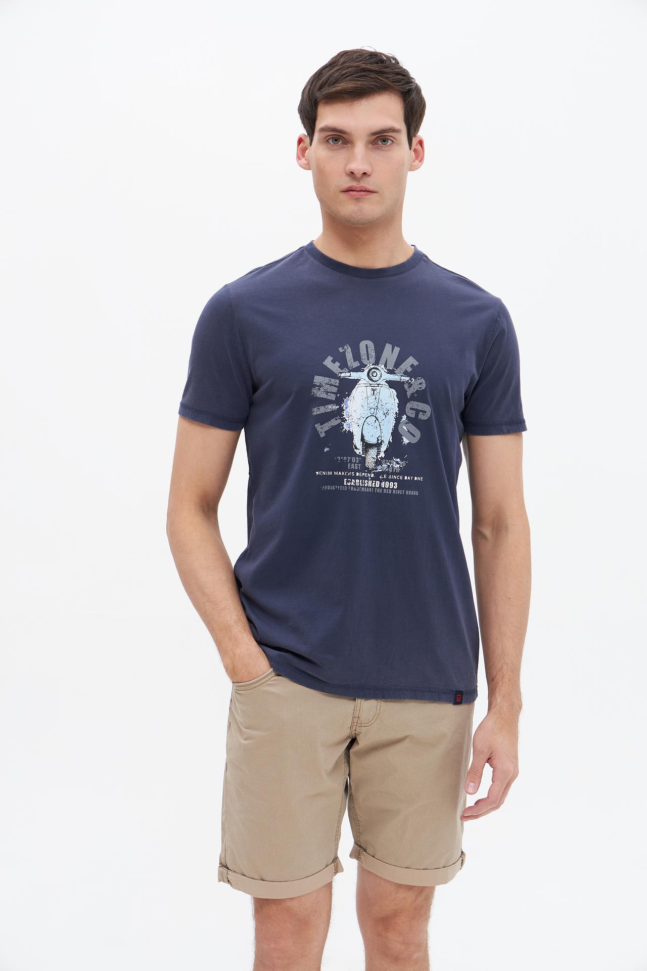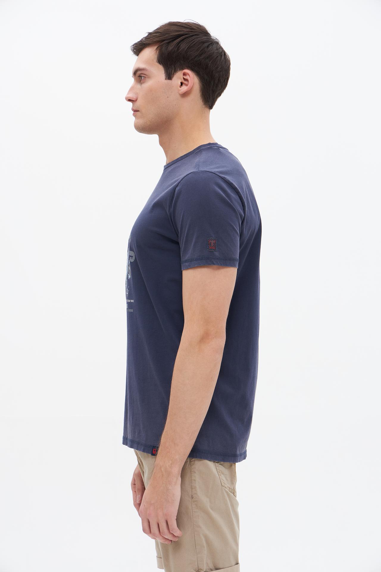 Изделие представлено в глубоком темно-синем цвете, который легко сочетается с различными элементами гардероба. Футболка украшена оригинальным принтом, добавляющим индивидуальность.