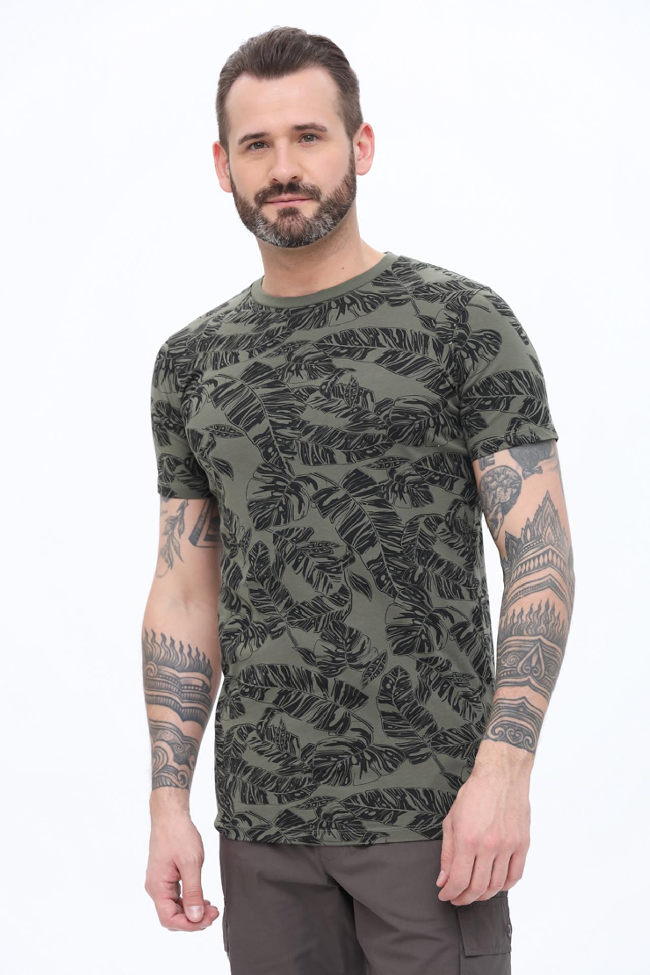 - Оригинальный дизайн: Оливковый цвет в сочетании с принтом в виде листьев делают эту футболку стильной и запоминающейся.