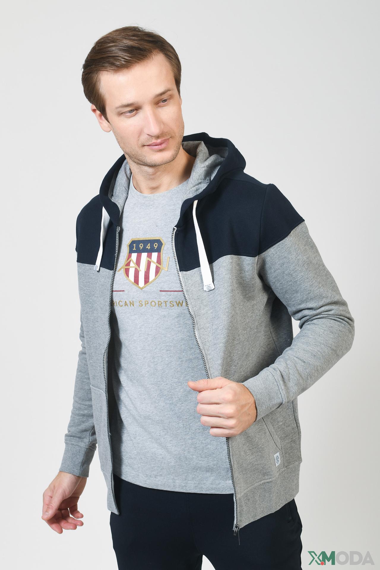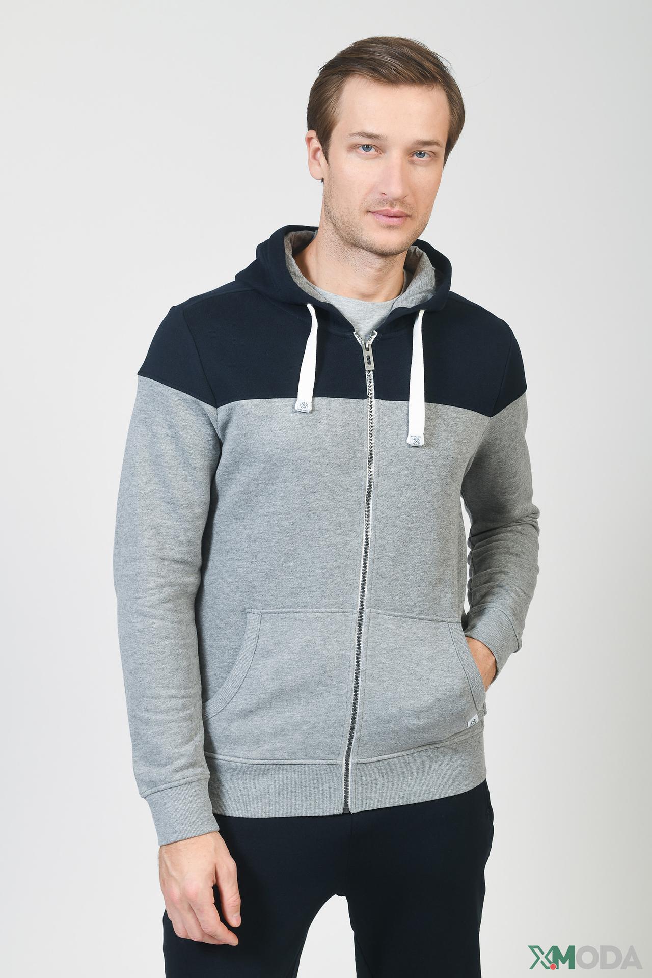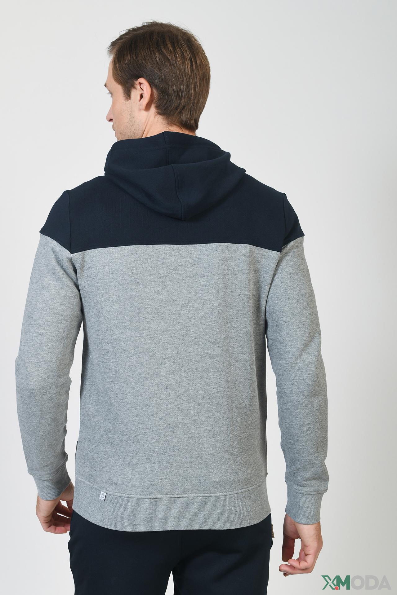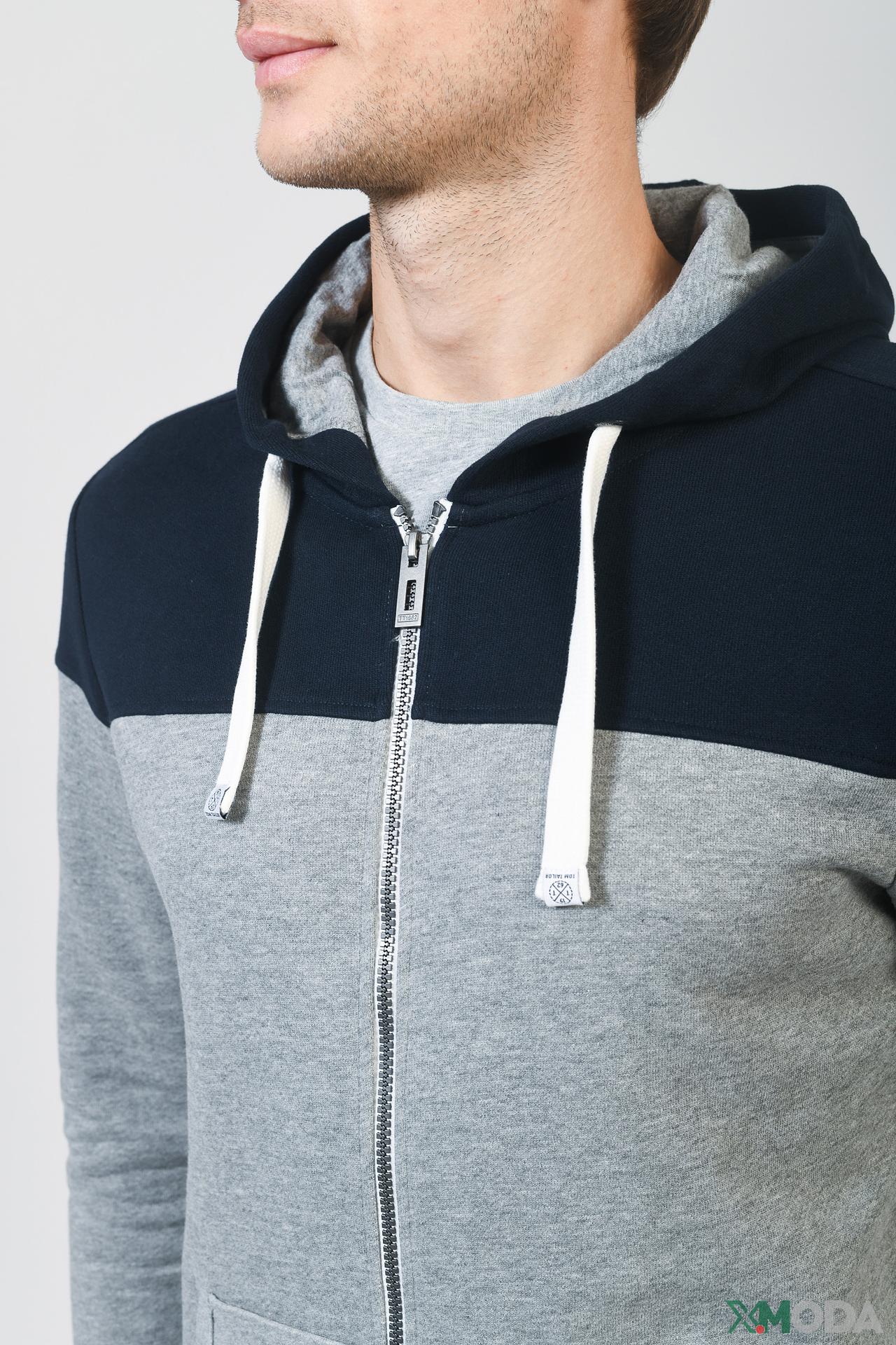 - Дизайн: Стильный двухцветный дизайн с капюшоном, сочетающий серый и синий цвета, придающий кардигану современный и модный вид.