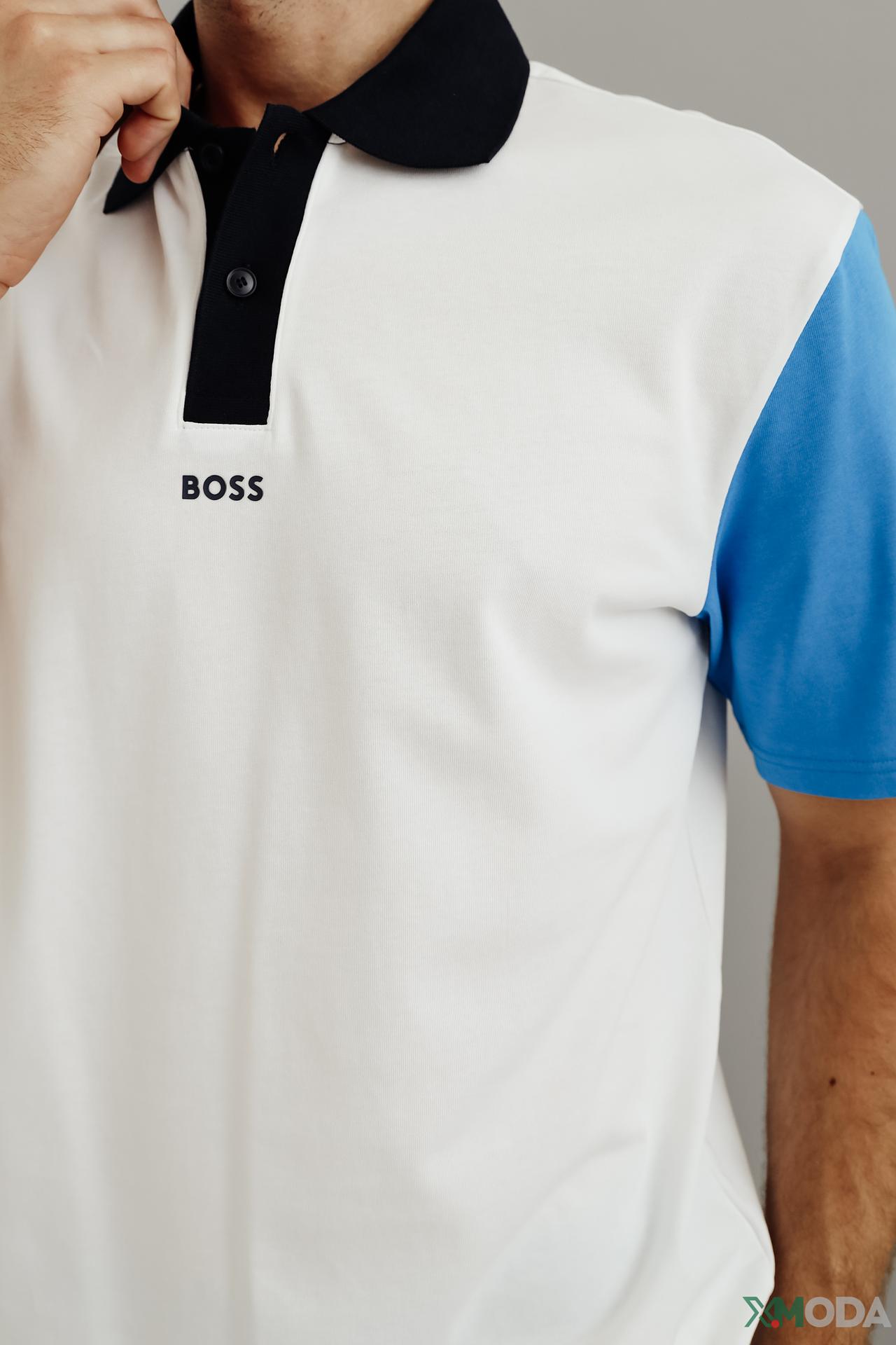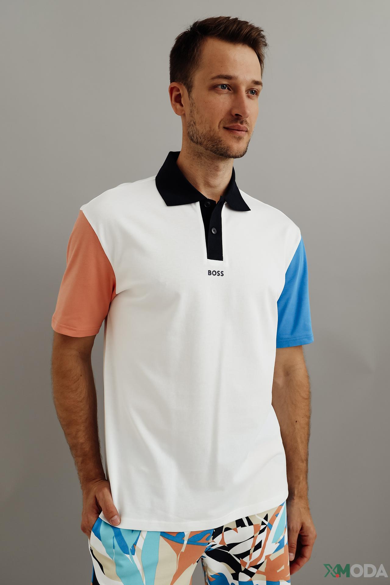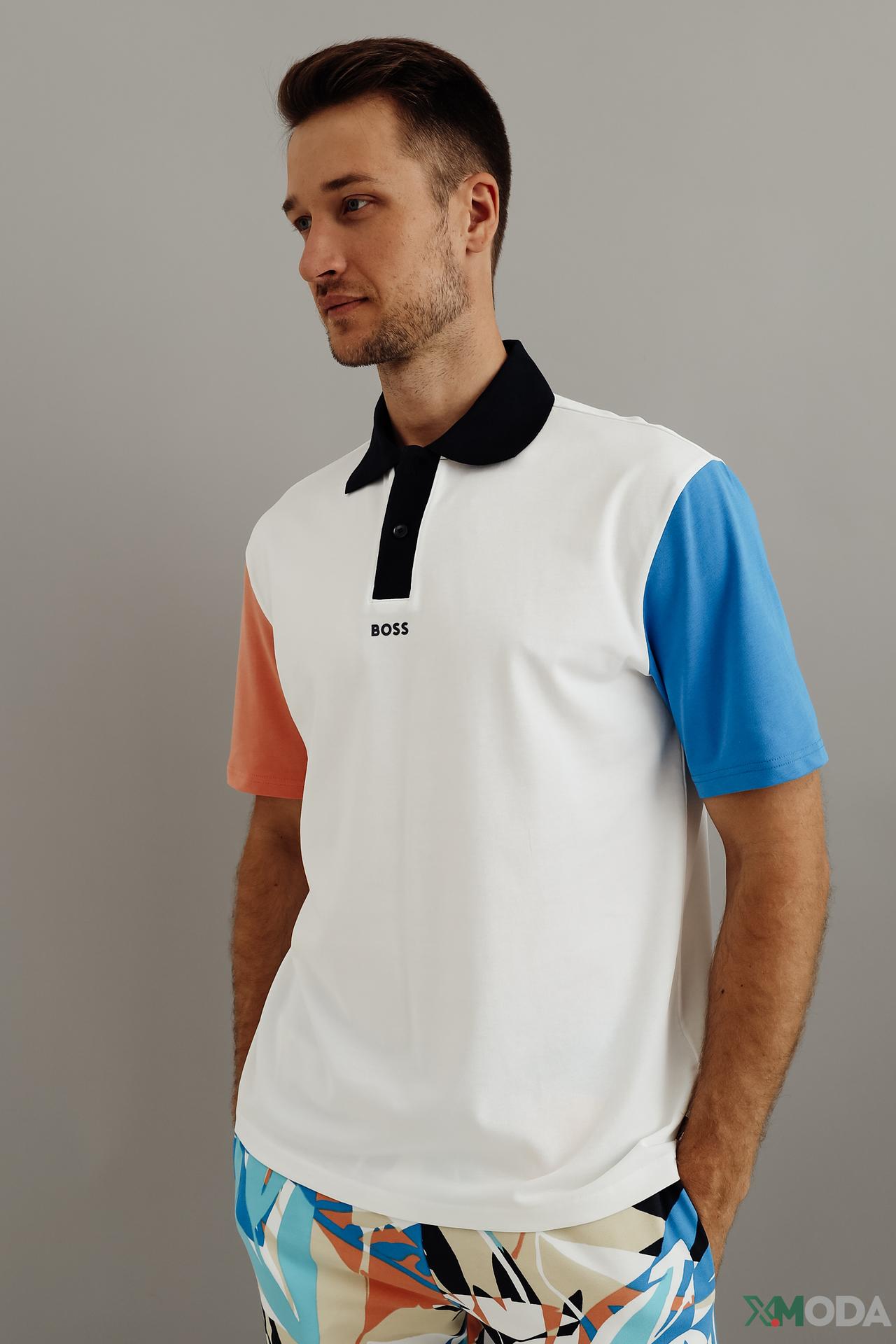 - Уникальный дизайн. Разноцветный дизайн с белым основным корпусом, черным воротником, персиковым и голубым рукавами придает изделию динамичный и современный вид. Маленький вышитый логотип Boss на груди подчеркивает принадлежность к известному бренду.