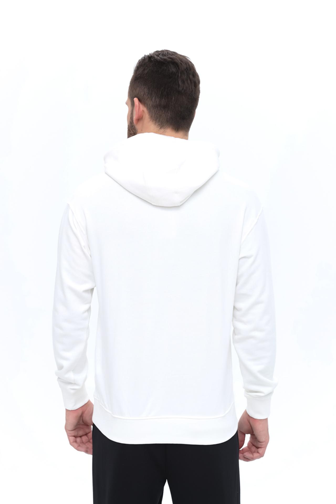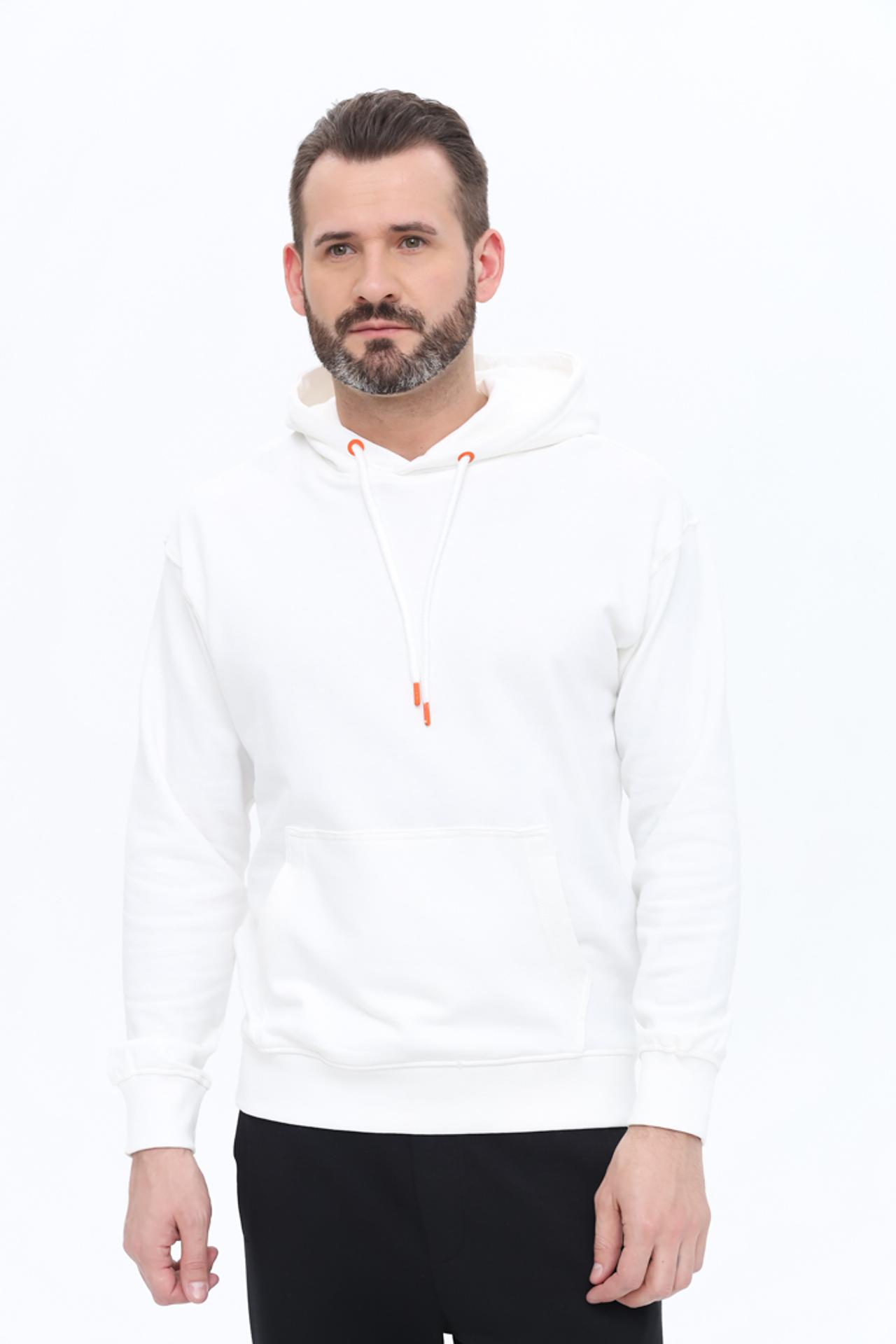 - Дизайн: Модель в классическом белом цвете оснащена удобным капюшоном, объемным карманом-кенгуру и регулируемыми шнурками с яркими оранжевыми наконечниками, добавляющими изюминку образу.