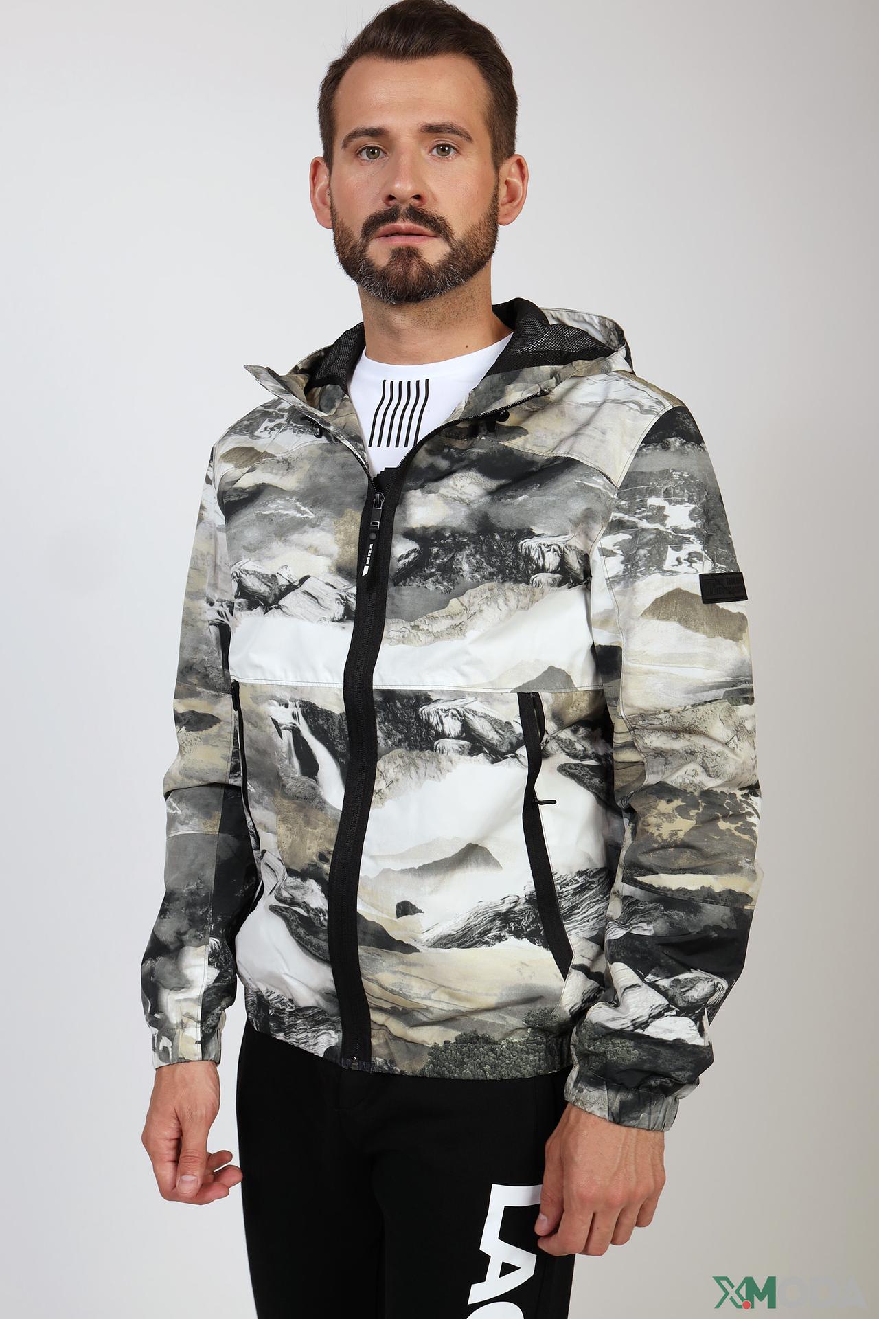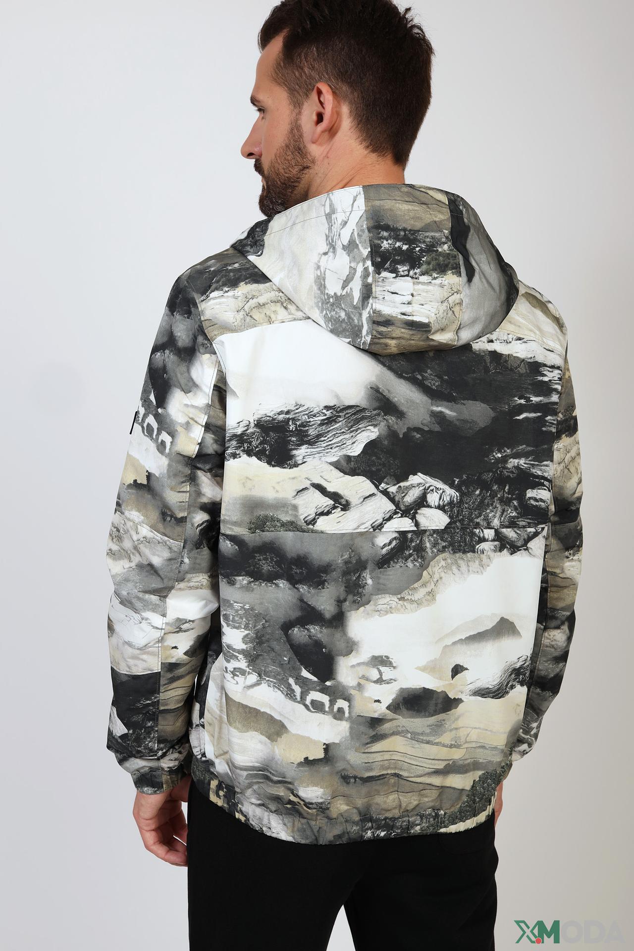 - Дизайн: Яркий, запоминающийся принт в серо-бежевых тонах с элементами пейзажа. Куртка имеет капюшон и застежку-молнию.