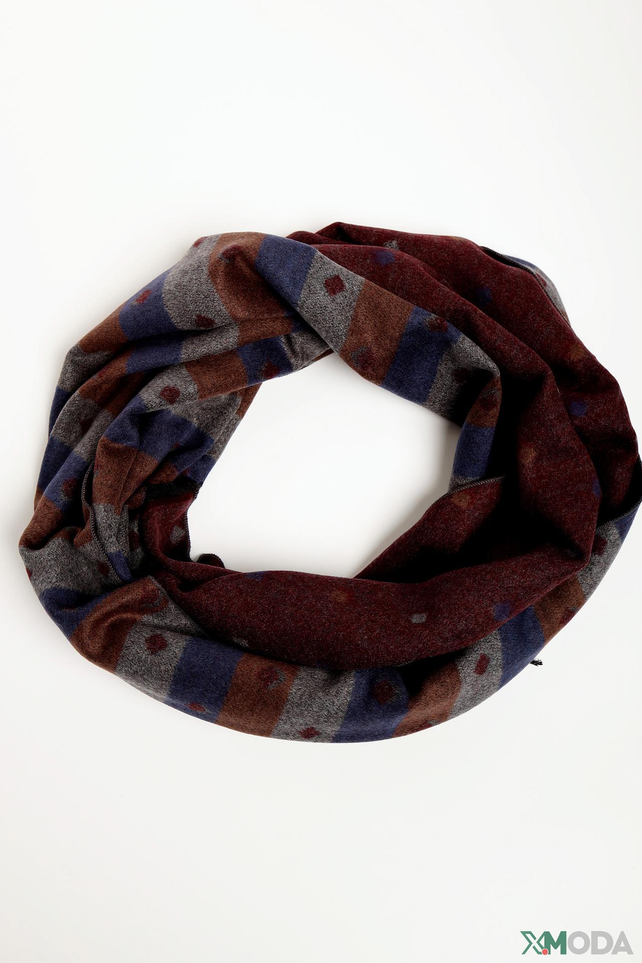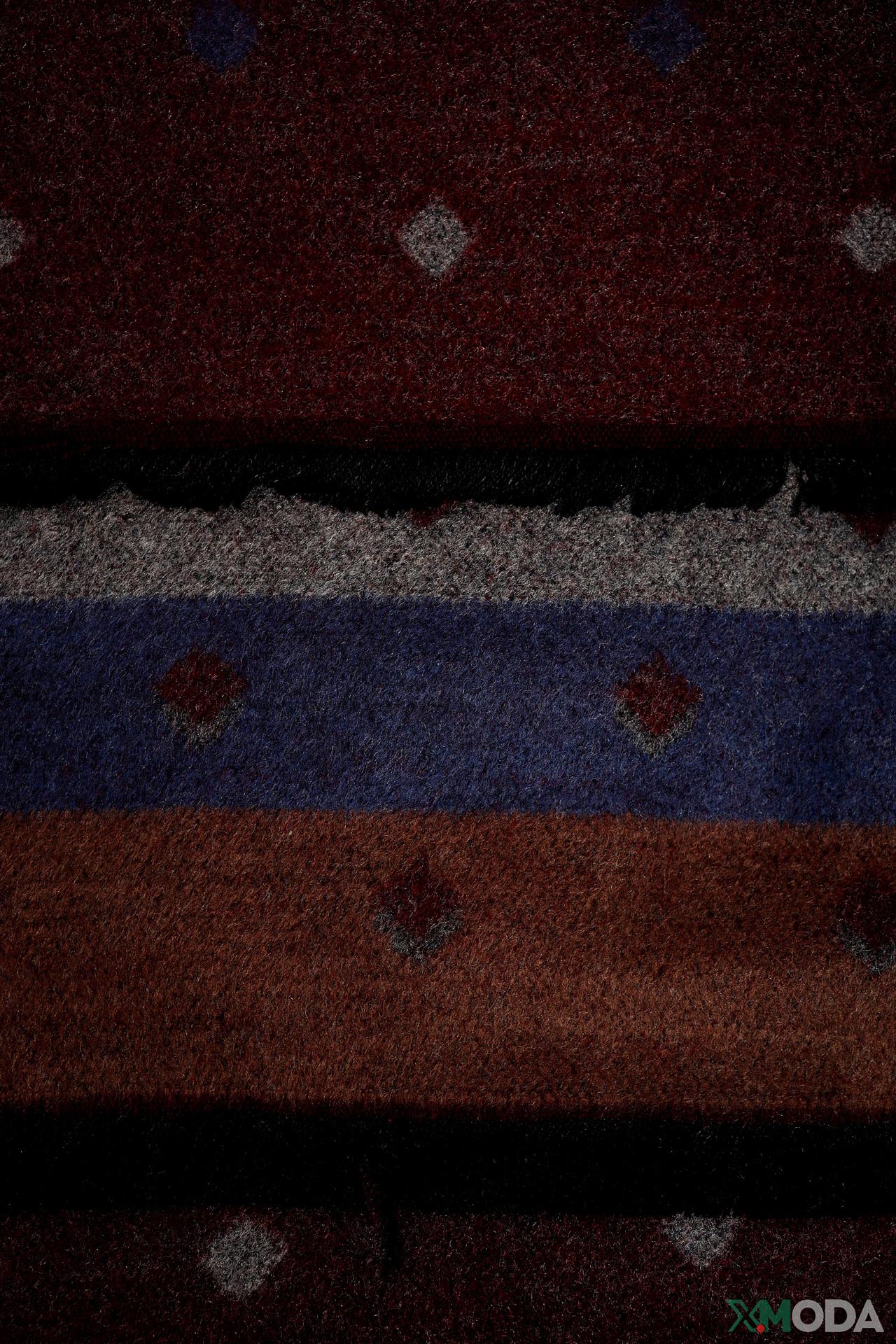 - Дизайн: Оригинальный принт с сочетанием бордовых, коричневых, серых и синих полос, дополненный мелкими ромбовидными узорами. Этот шарф добавит изысканности любому наряду.