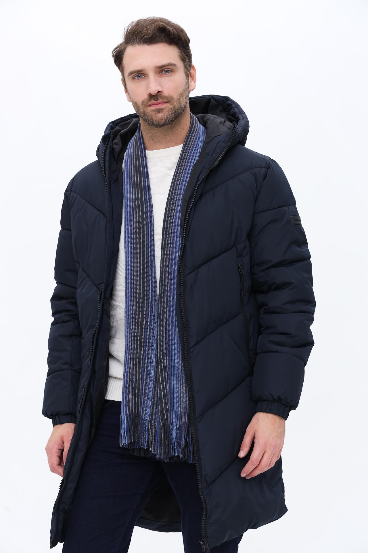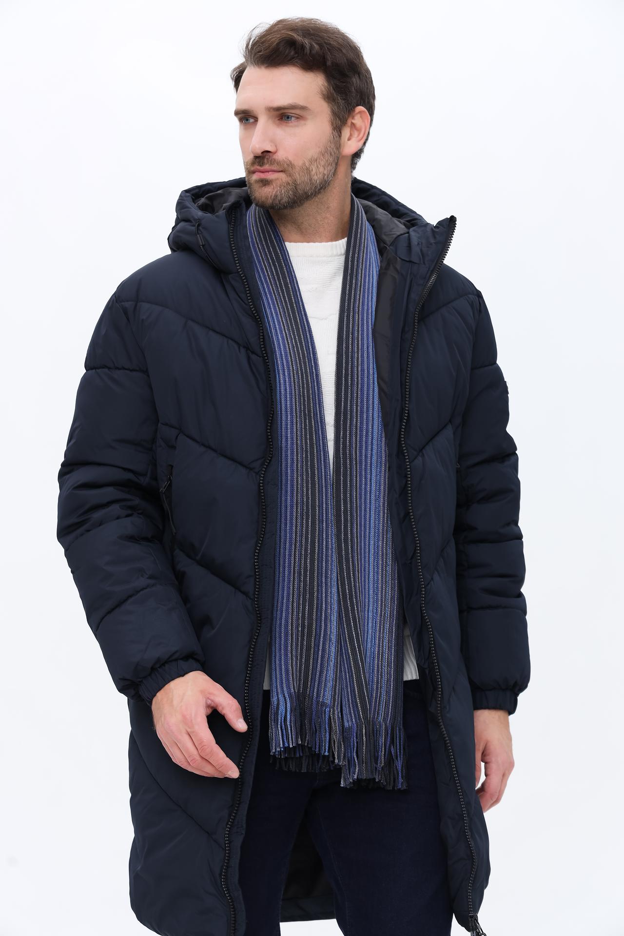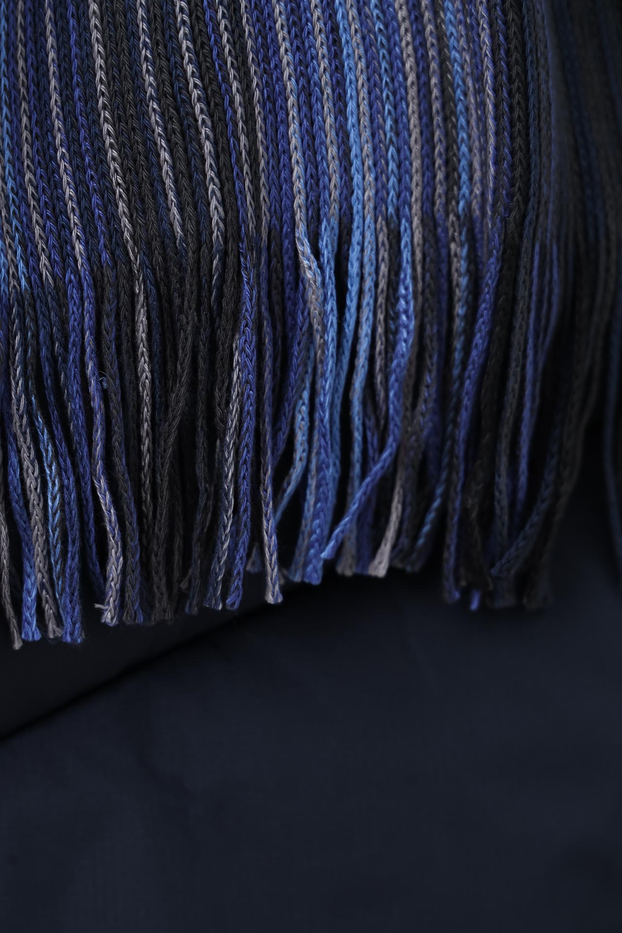 - Цветовая гамма: Шарф выполнен в многоцветной расцветке, сочетающей оттенки синего, серого и черного. Это позволяет легко сочетать его с различной верхней одеждой.