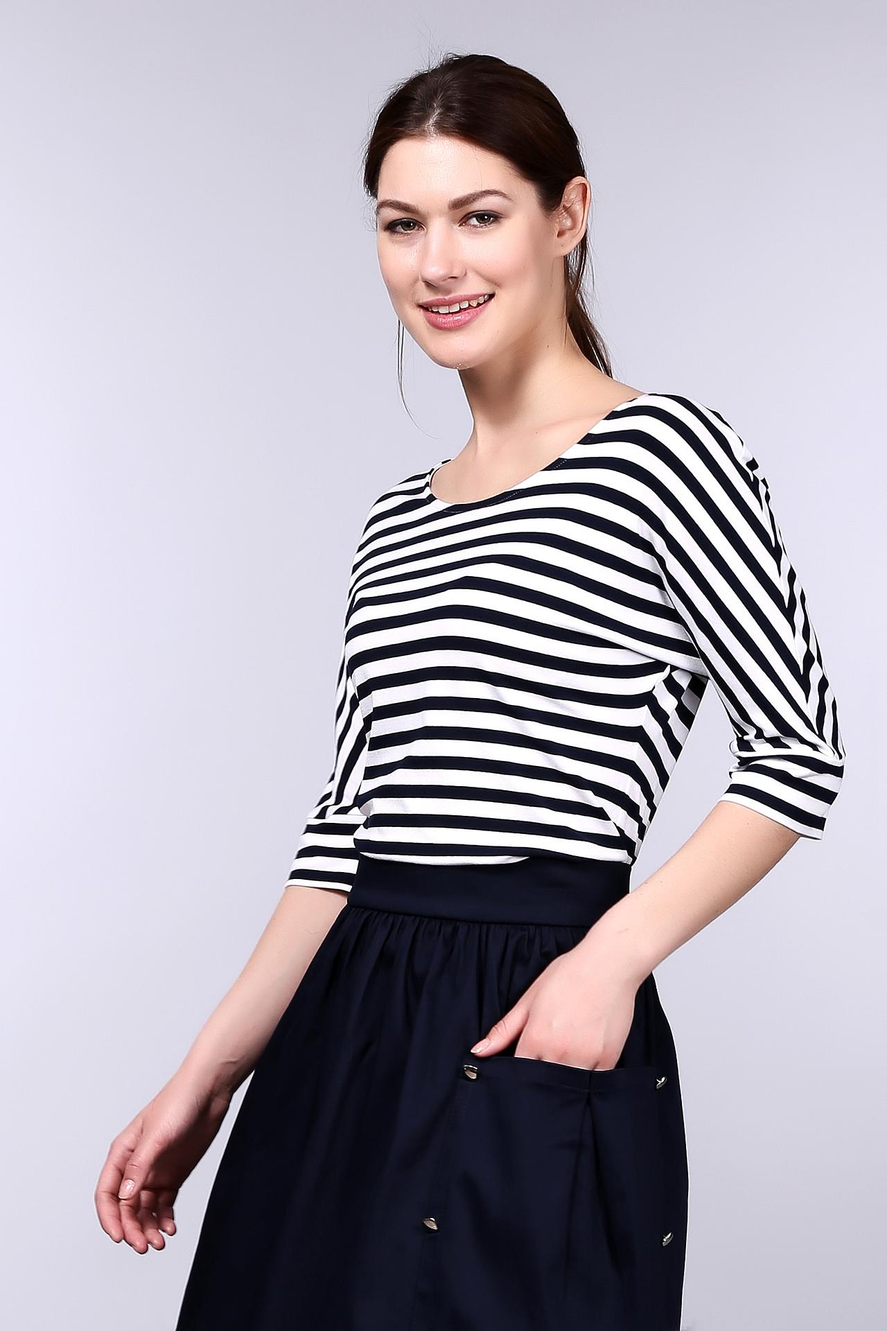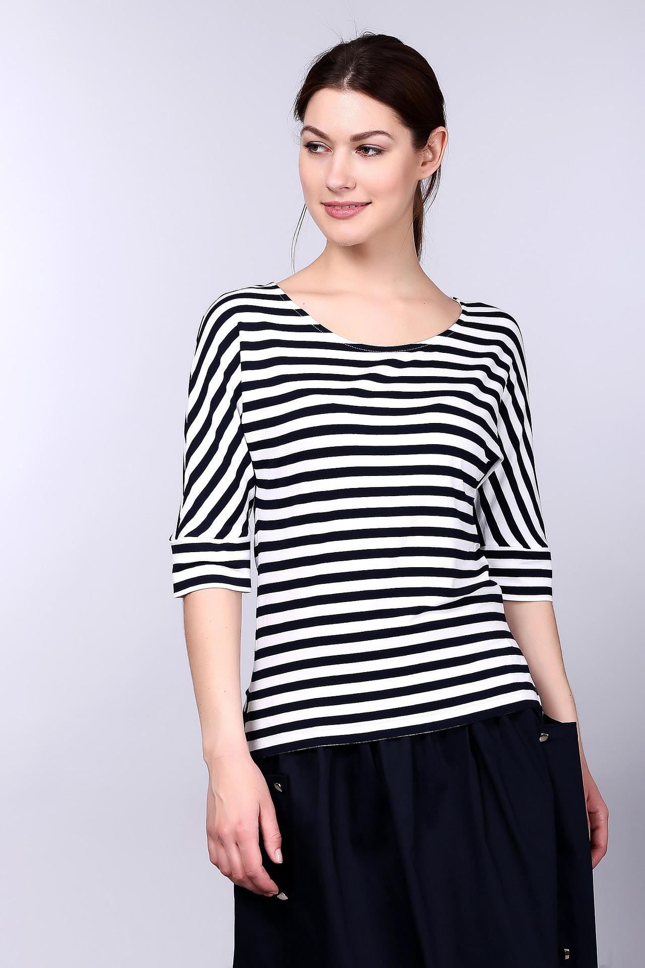 - Удобный крой: Блуза имеет прямой силуэт и рукав 3/4, что обеспечивает свободу движений и комфорт.