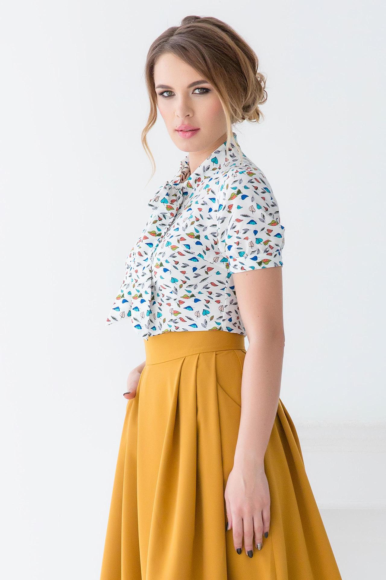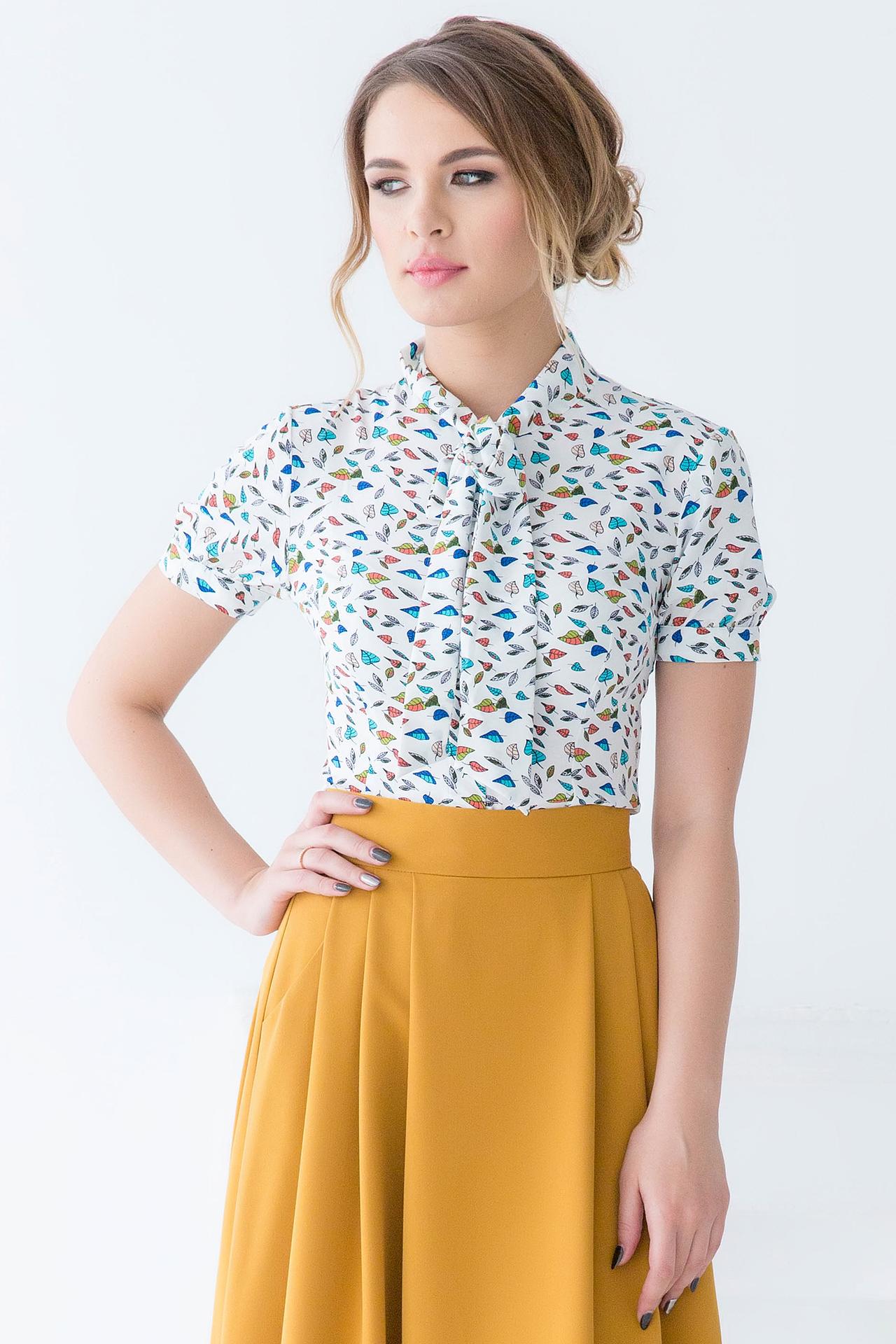 Блуза LookLikeCat белая с разноцветным принтом и бантом