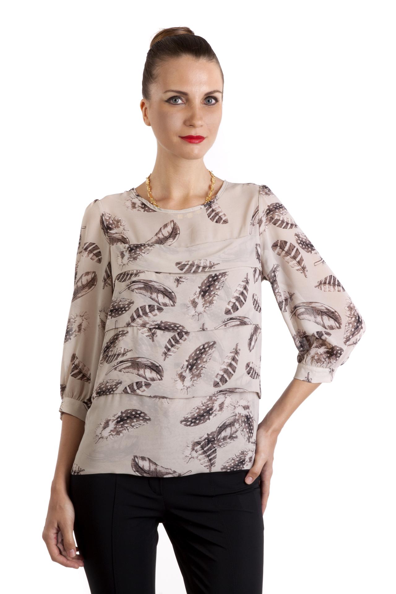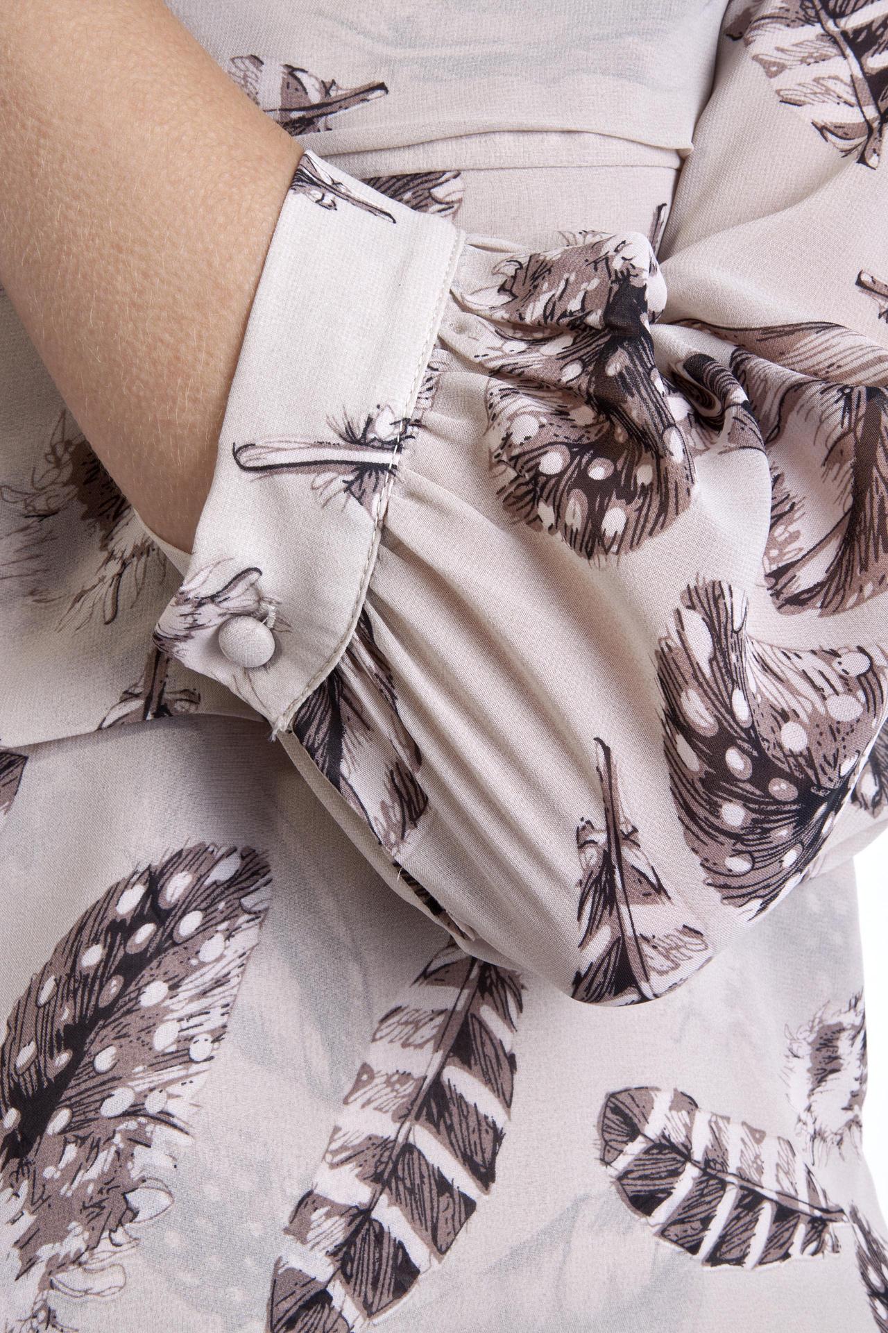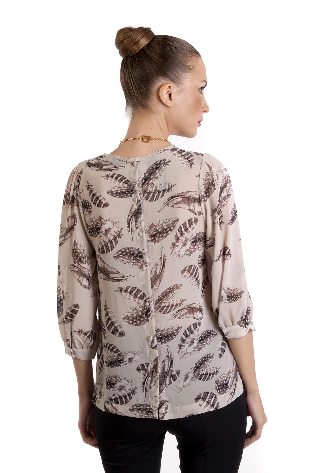 Стильная блуза бренда Locust прямого кроя выполнена в нежно-бежевом цвете. Изделие дополнено: круглым вырезом, рукавами 3/4 присборенными у манжета с застежкой-пуговица и структурными горизонтальными складками. Модель застегивается на пуговицы на спинке. Блуза декорирована рисунком в виде перьев.
