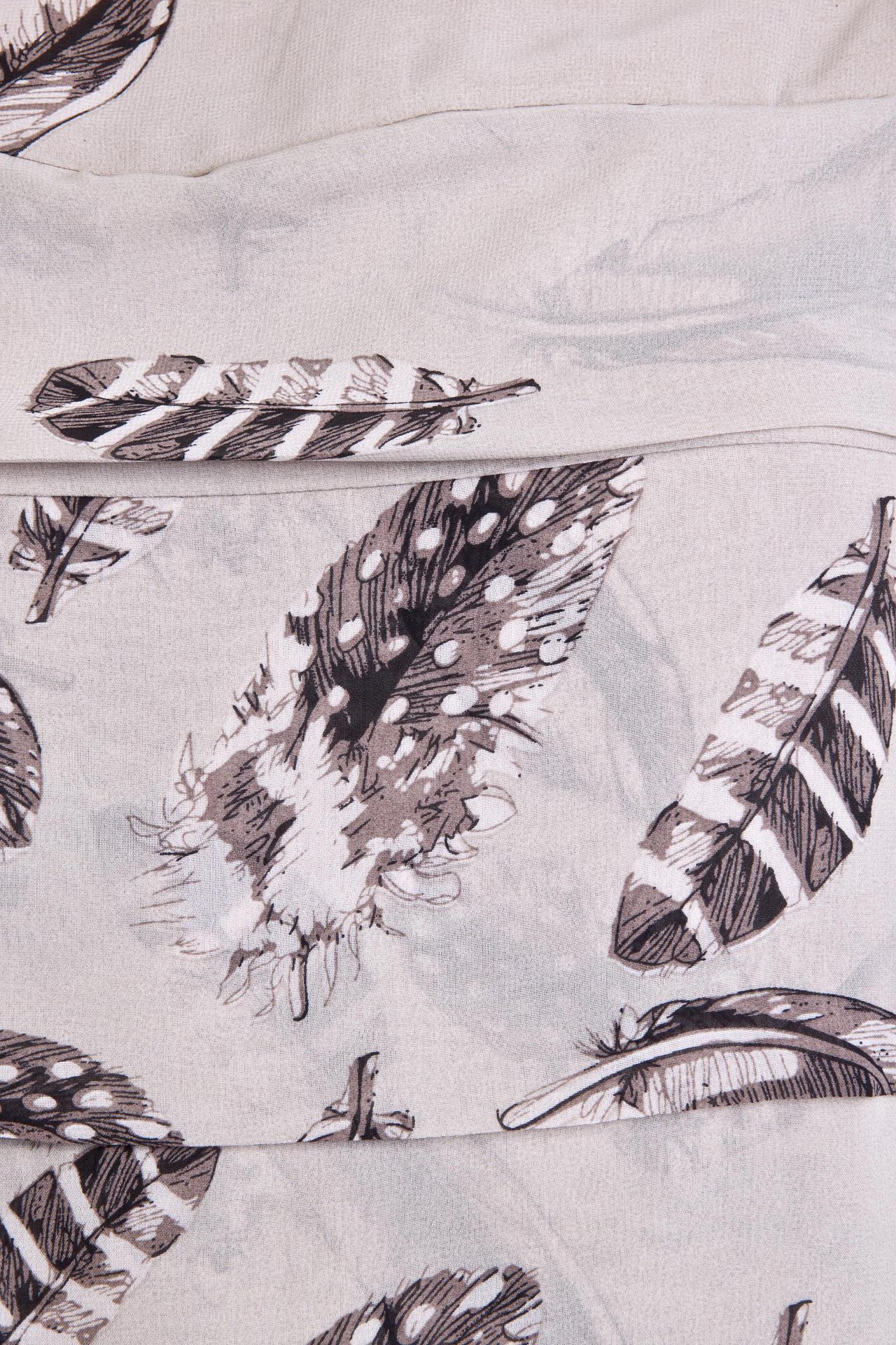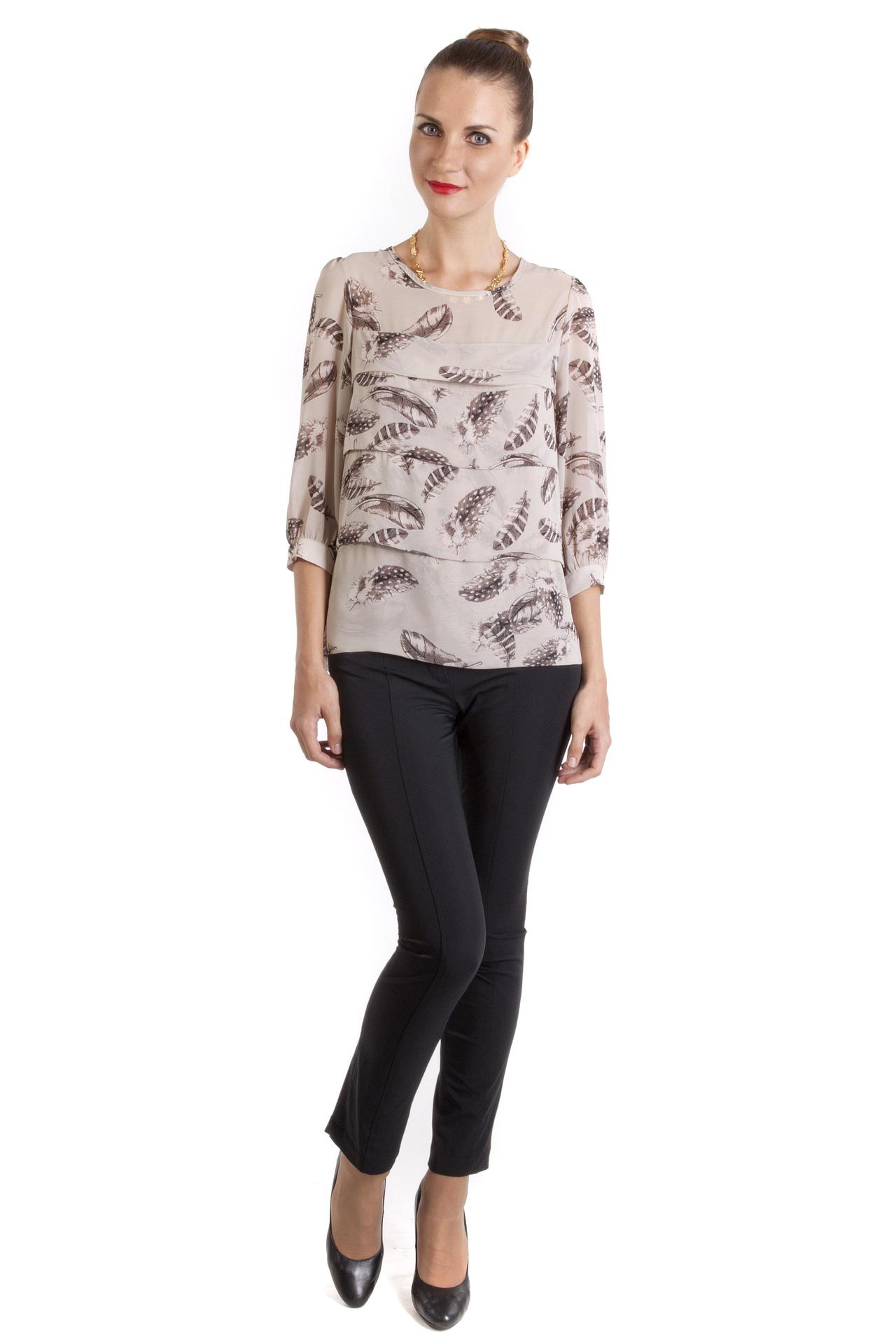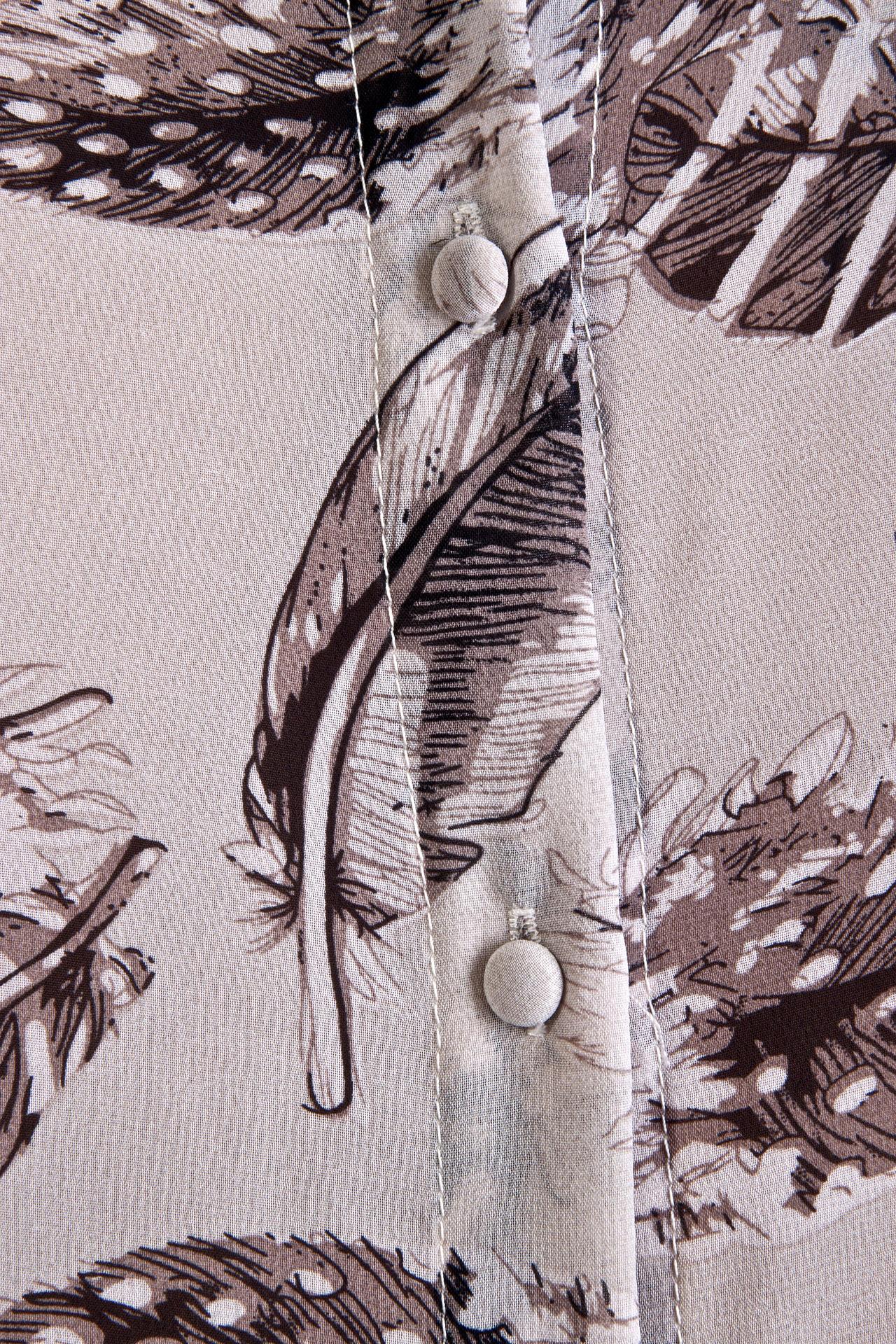 Стильная блуза бренда Locust прямого кроя выполнена в нежно-бежевом цвете. Изделие дополнено: круглым вырезом, рукавами 3/4 присборенными у манжета с застежкой-пуговица и структурными горизонтальными складками. Модель застегивается на пуговицы на спинке. Блуза декорирована рисунком в виде перьев.