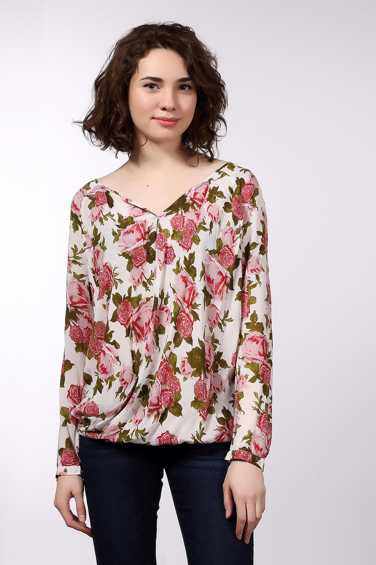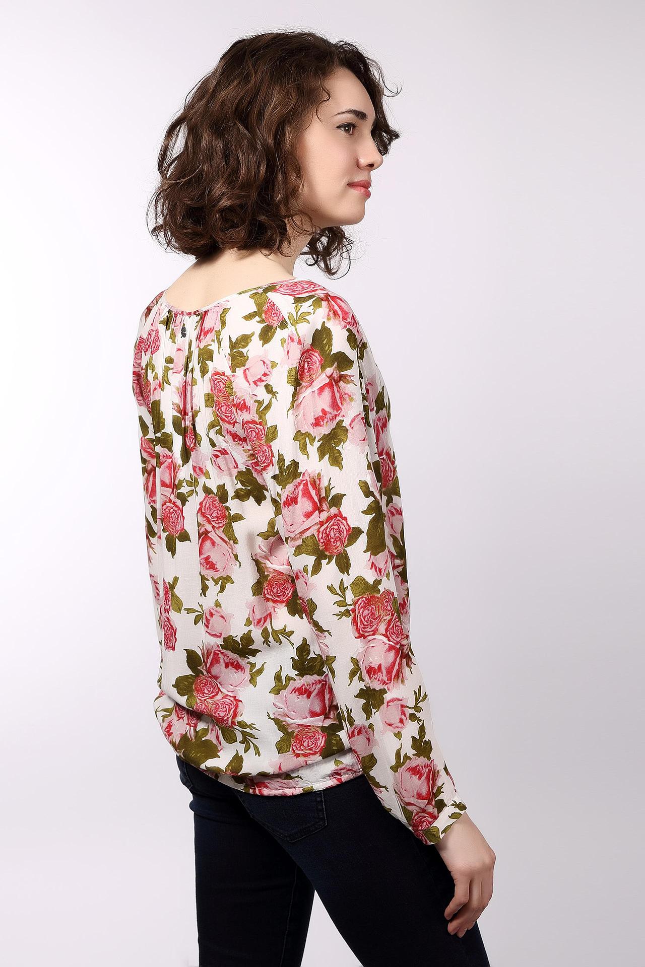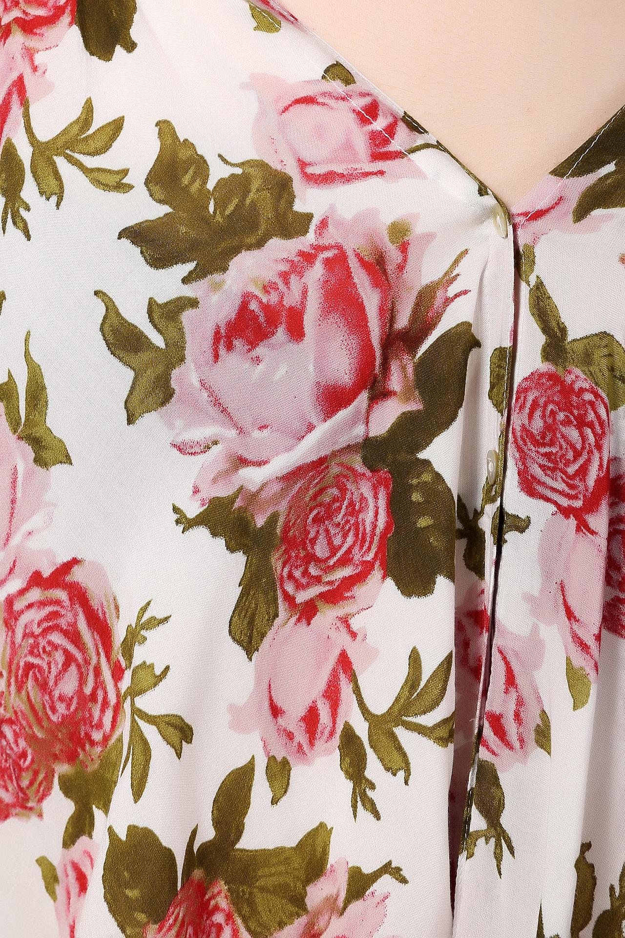 - Цветовая гамма: Яркий цветочный узор с насыщенными оттенками розовых роз и зеленых листьев на классическом белом фоне делает эту блузу универсальной для различных образов.