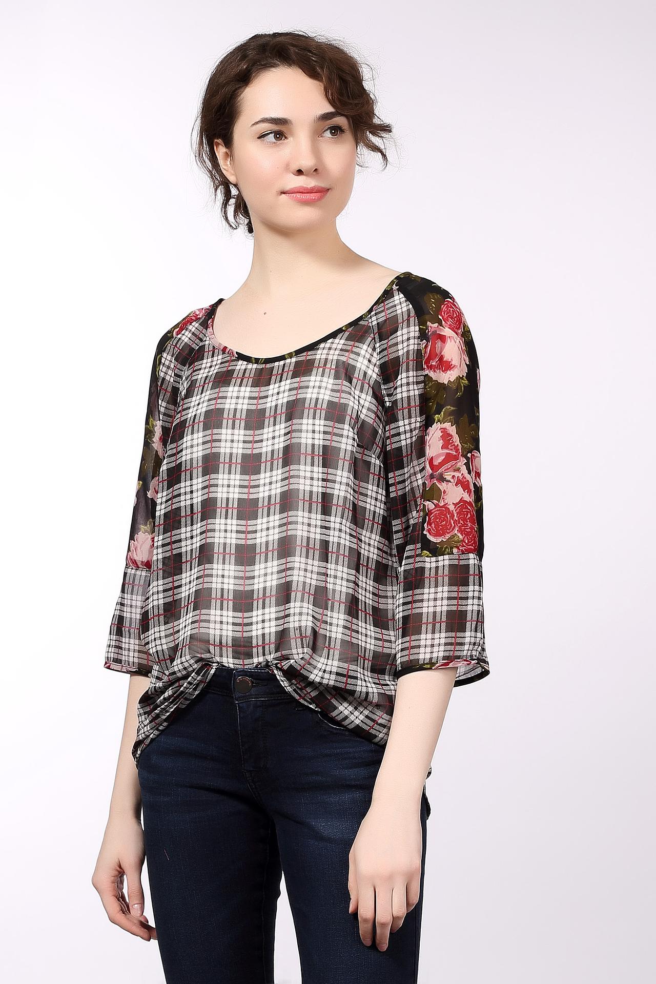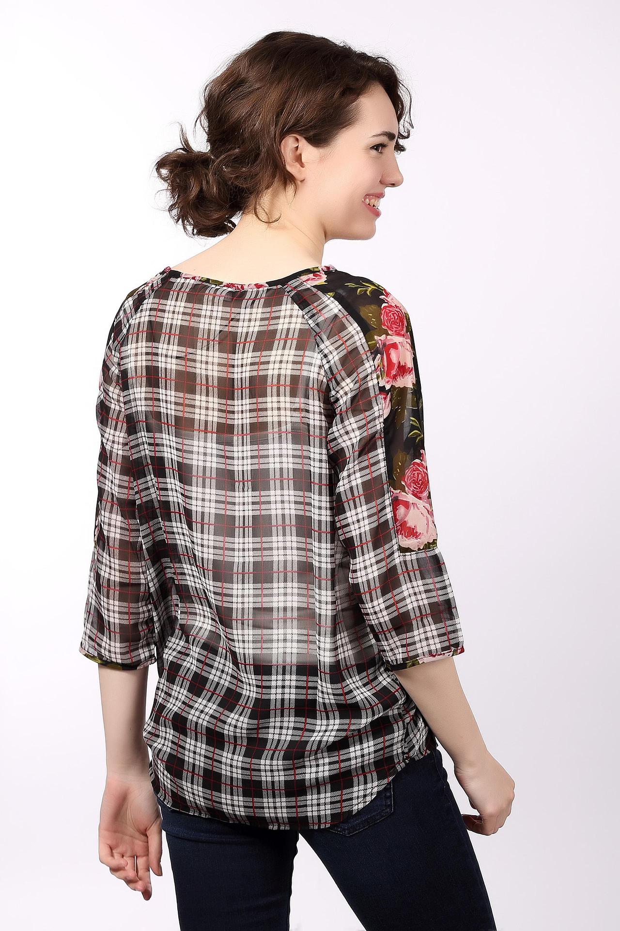 - Оригинальный дизайн. Сочетание классической клетки и цветочного принта на рукавах делает блузу запоминающейся и стильной. Такой дизайн добавит образу женственности и оригинальности.