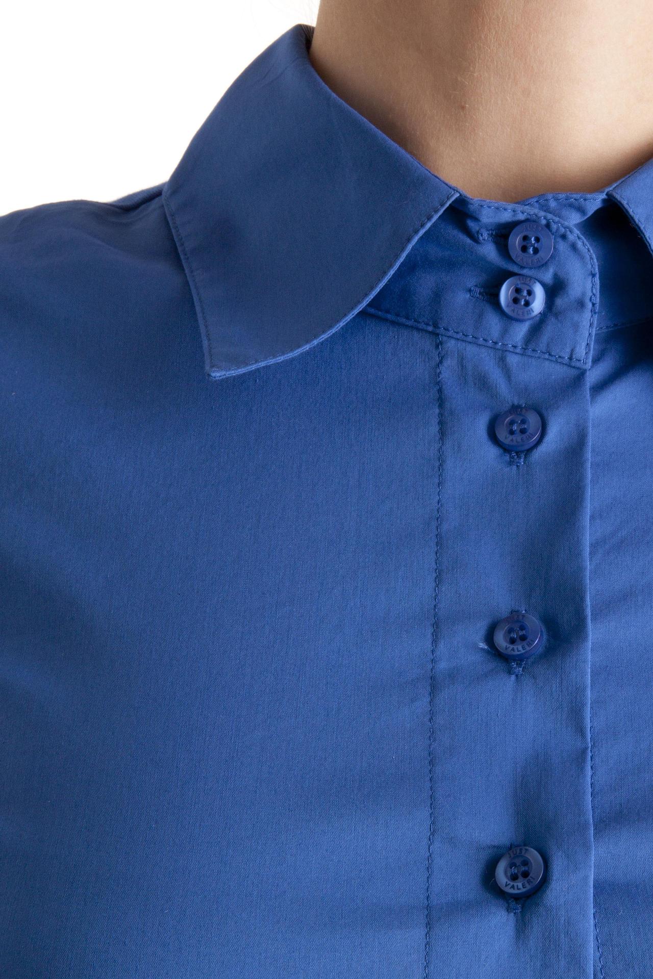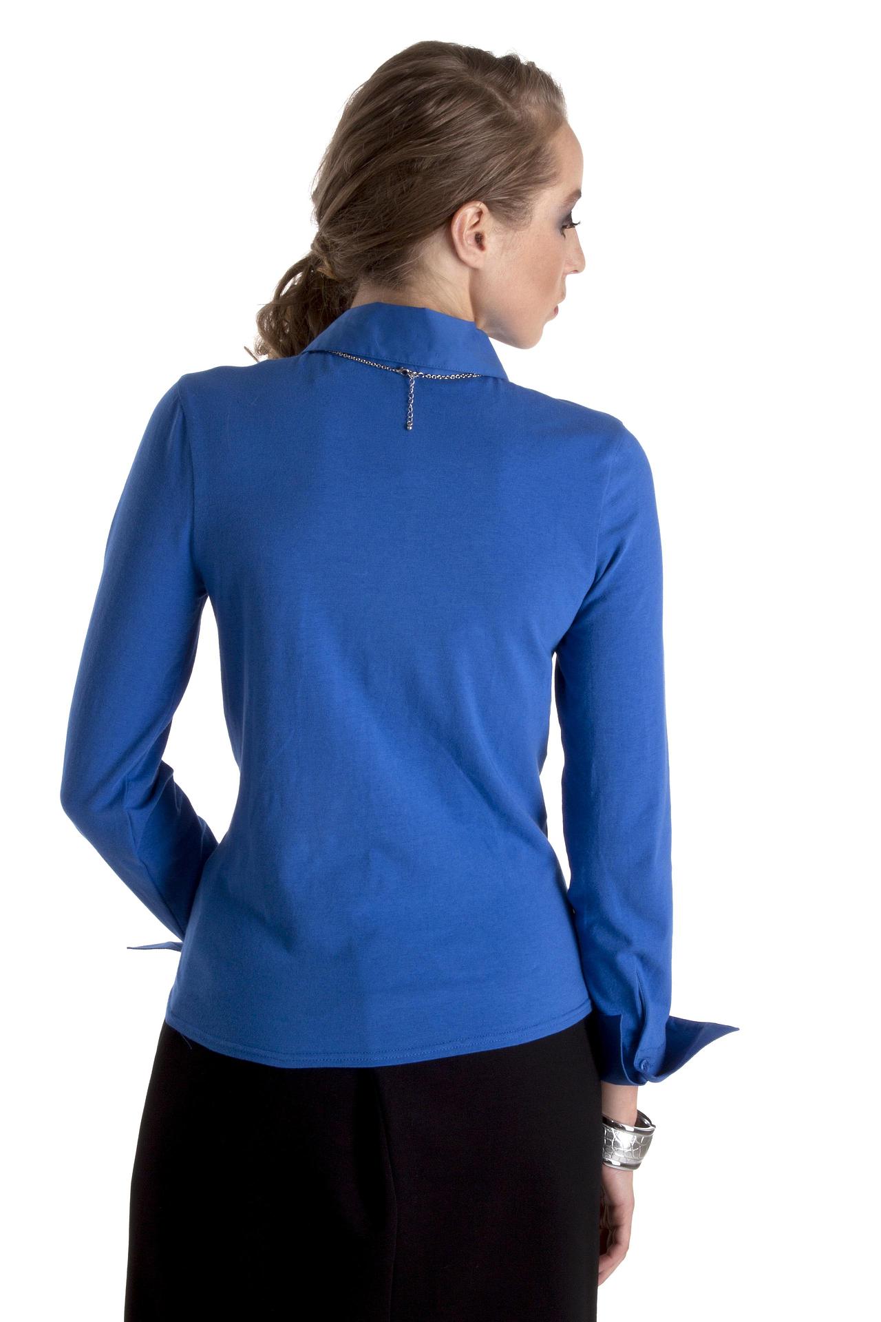 Синяя блуза Just Valeri из комбинированной ткани приталенного кроя. Изделие дополнено: отложным воротником и манжетами с пуговицами. Центральная часть изделия застегивается на пуговицы.