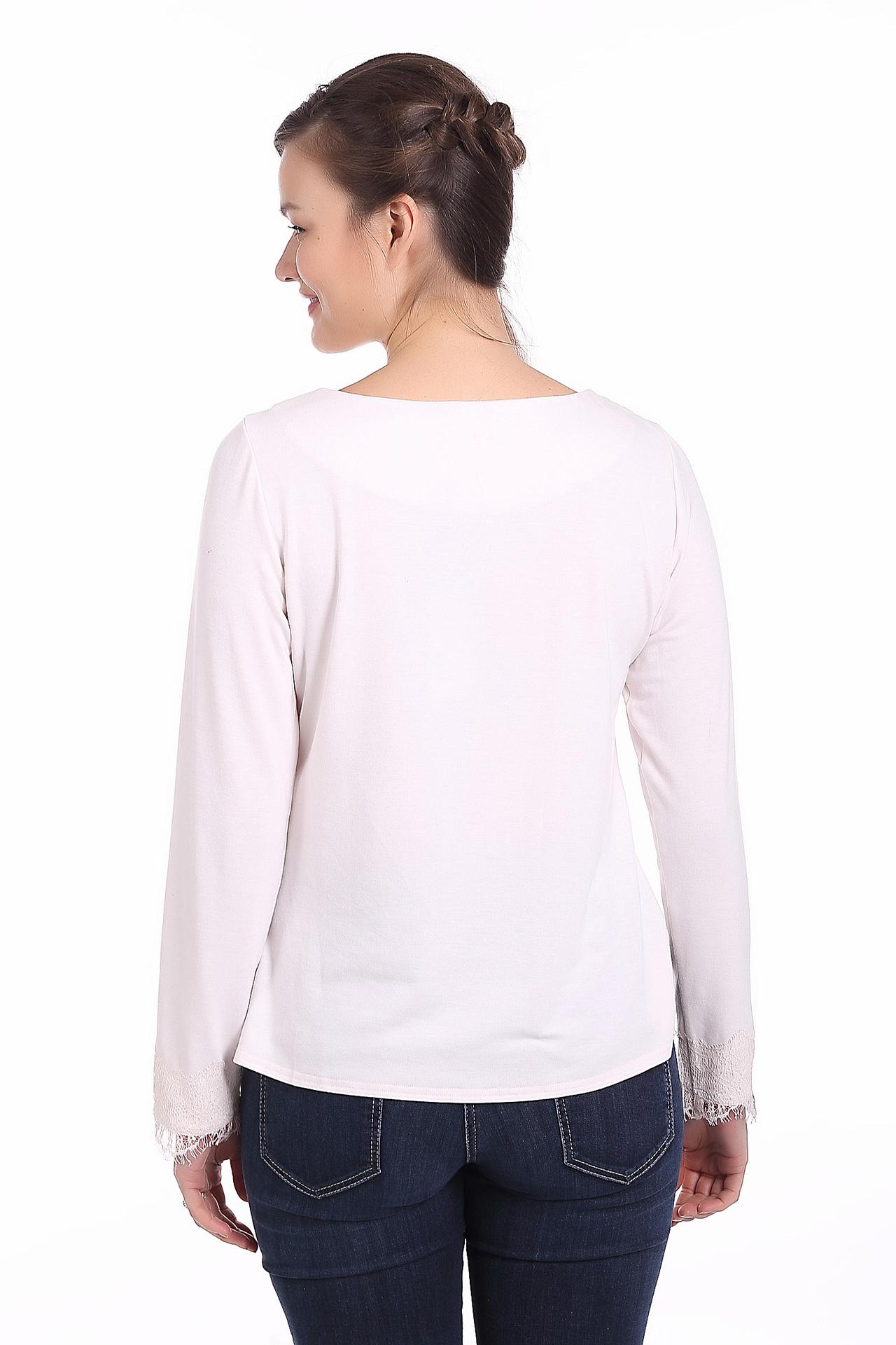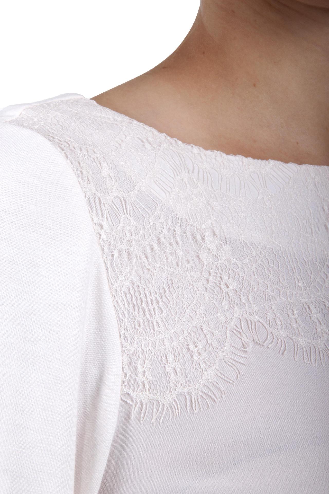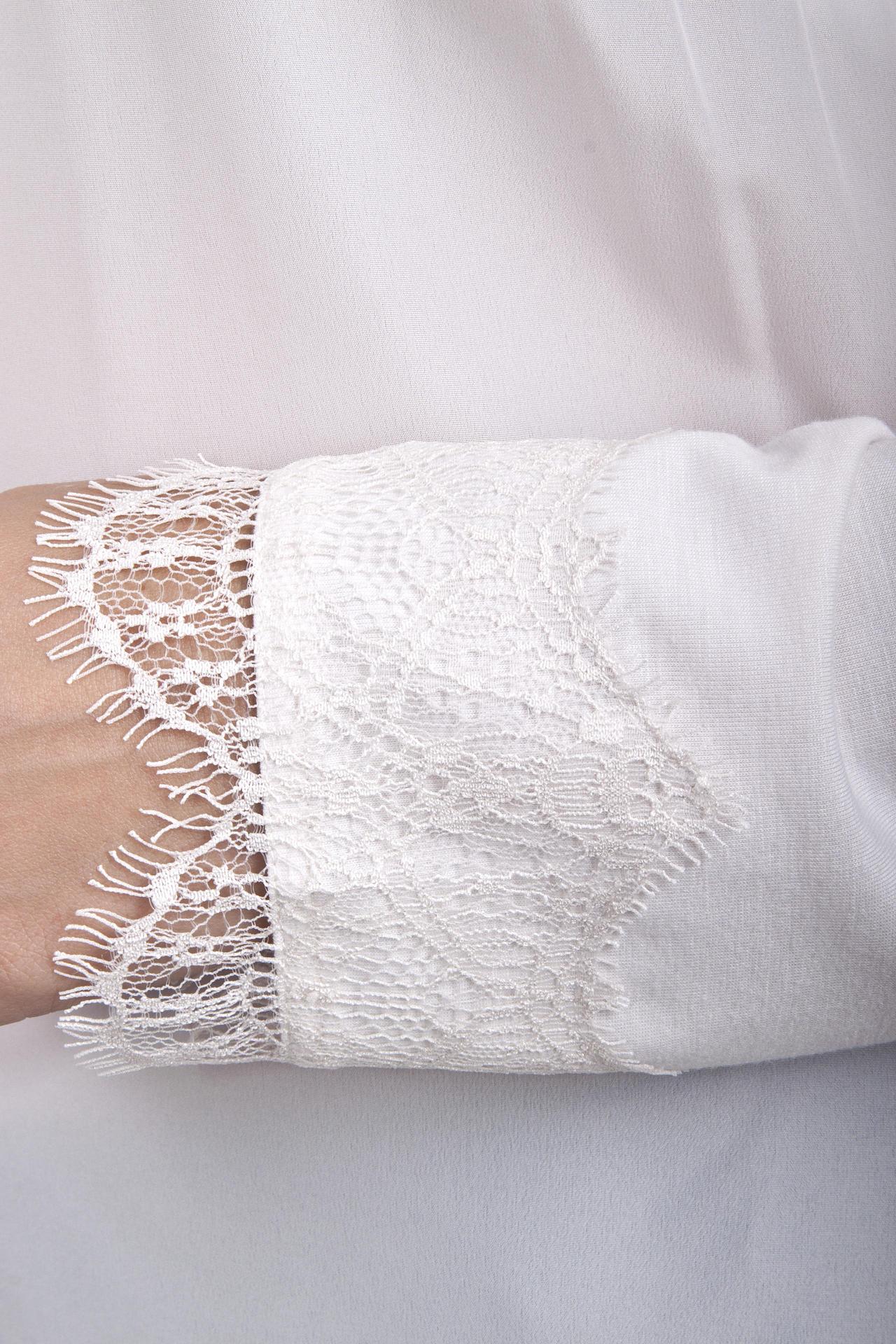 Белая блуза Pezzo прямого кроя. Изделие дополнено круглым вырезом и длинными рукавами. Зона декольте и манжеты декорированы нежными кружевами в цвет изделия.