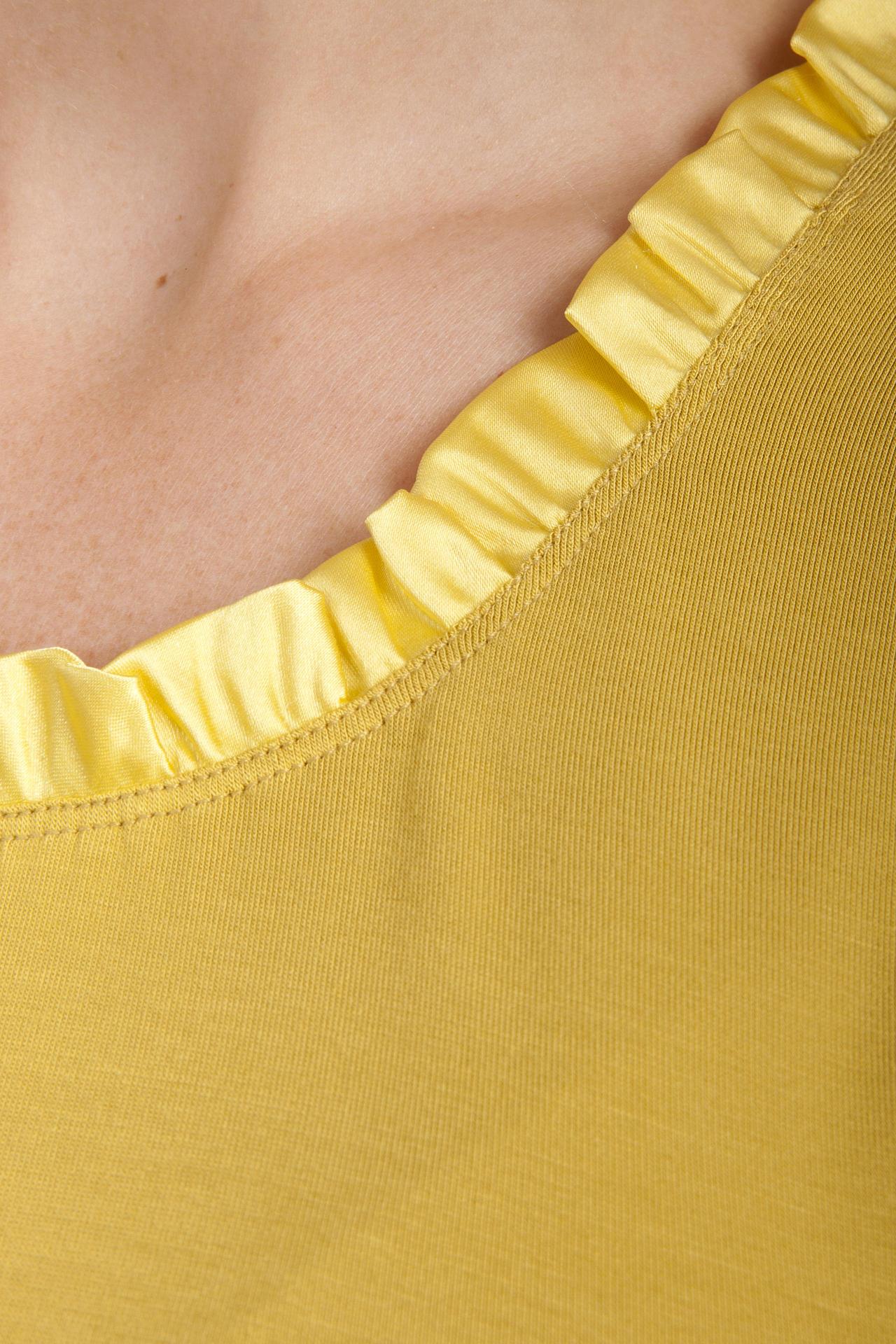 - Изысканный декор. Круглый вырез горловины оформлен деликатной атласной рюшей в тон, что придает образу нотку романтичности и утонченности. Эта деталь делает блузу нарядной и самодостаточной.