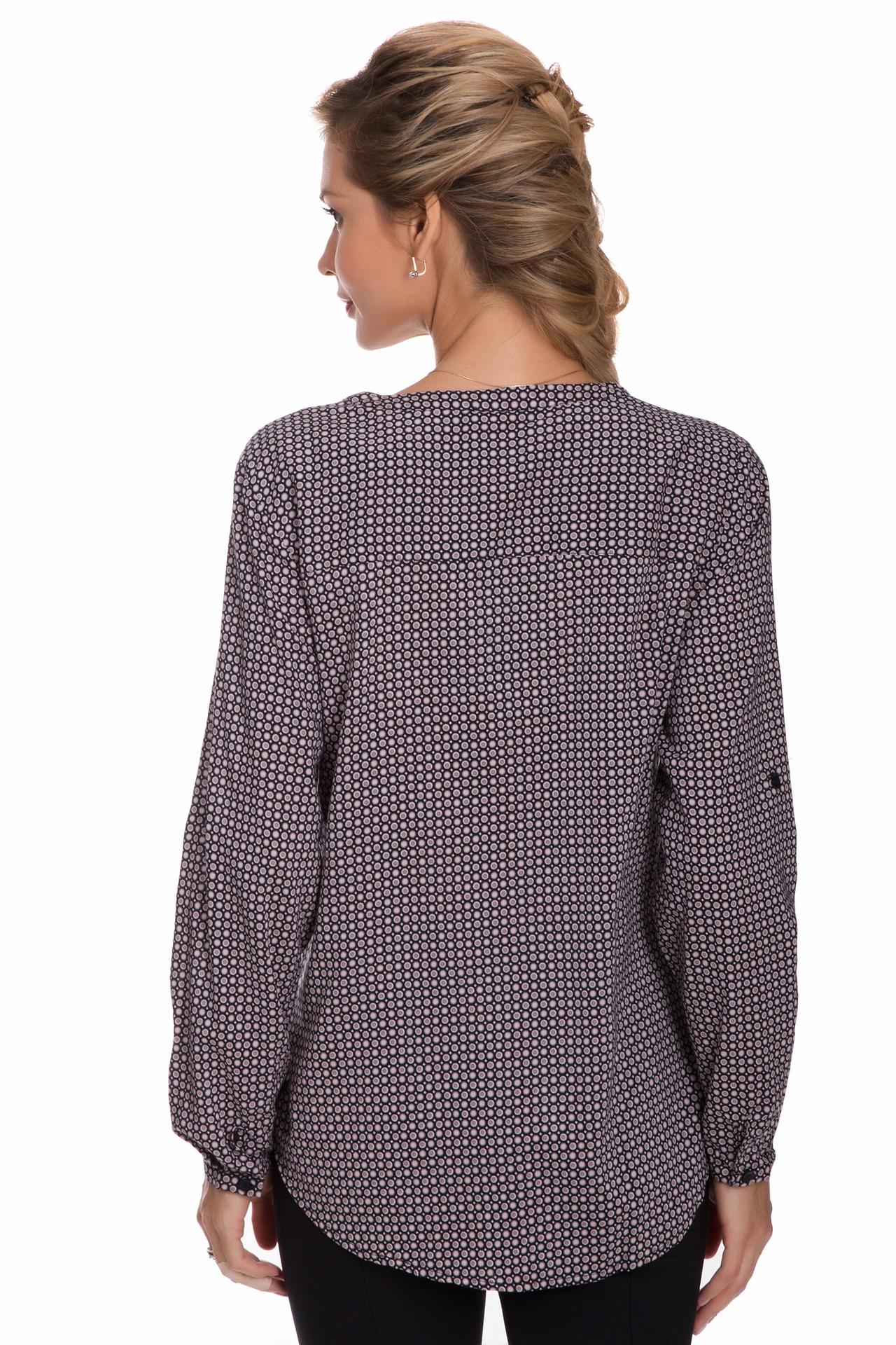 Элегантная женская блуза Tom Tailor черного цвета с белыми, сиреневыми и фиолетовыми деталями. Эта модель была сделана из вискозы и эластана. Изделие создано для осени или весны. Блуза свободного кроя. Дополнена интересным орнаментом и карманами на груди. Застегивается с помощью черных маленьких пуговиц. Можно носить как с брюками, так и с юбками.