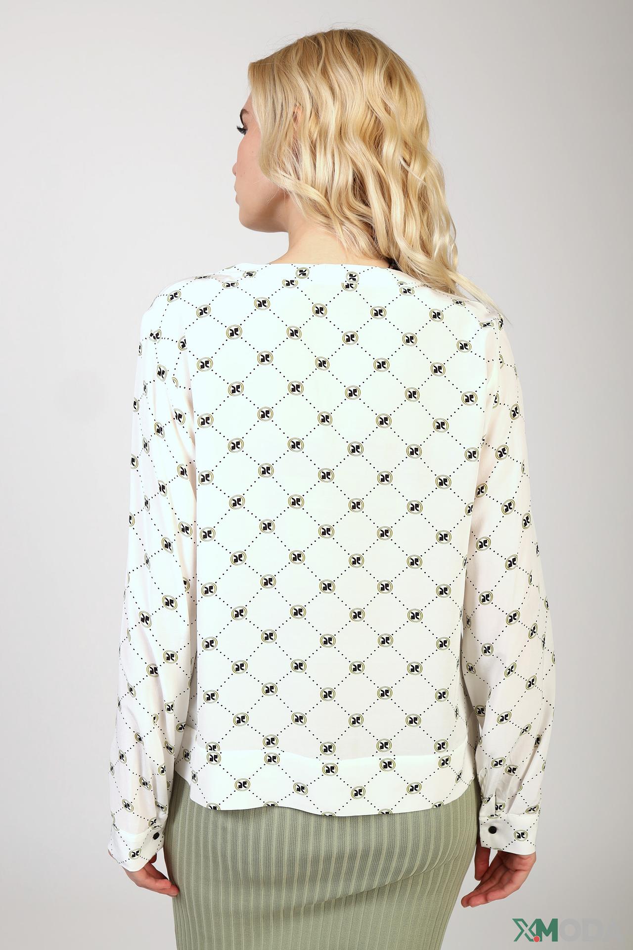 - Изысканный принт. Модель украшена уникальным геометрическим принтом на белом фоне, который придает изделию современный и неповторимый вид. Сочетание черных линий и акцентов желто-зеленого оттенка делает блузу выразительной и легко сочетаемой с различными элементами гардероба.
