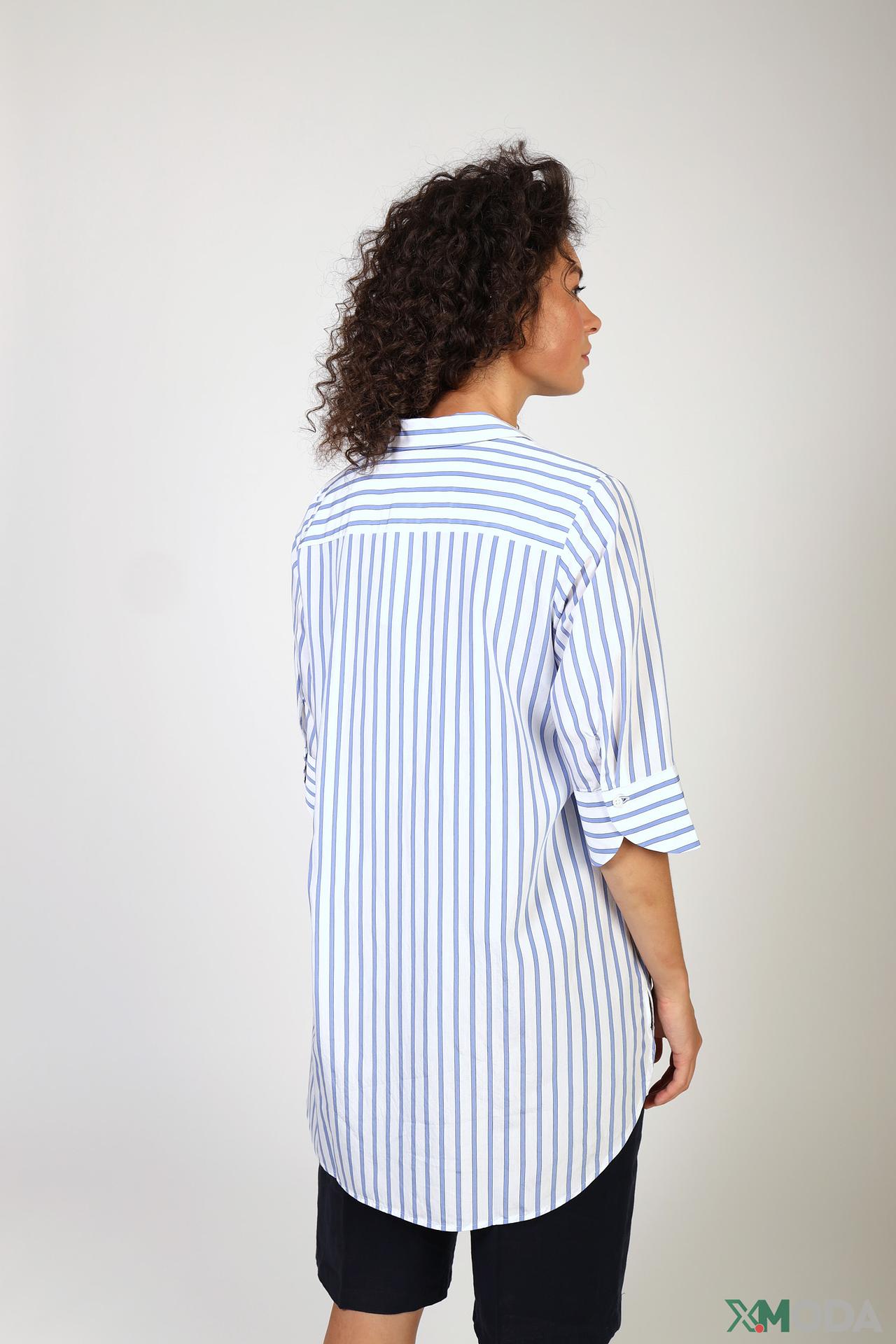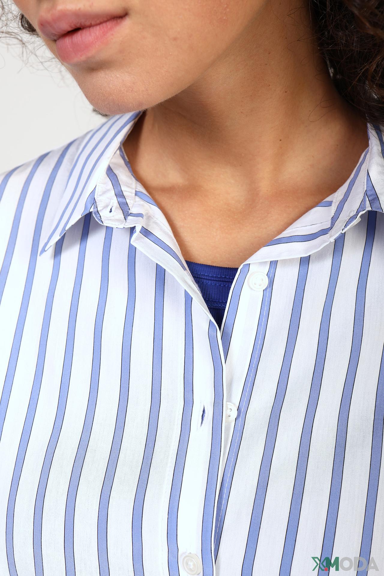 Блуза женская белого цвета бренда Comma. Модель выполнена прямым фасоном. Изделие дополнено откладным воротом на стойке, втачными рукавами до локтя с манжетами на пуговицу, застежка на пуговицы, боковыми выемками, задней кокеткой. Низ блузы подшит полукругом. Ткань блузы имеет полосатый принт. Сочетать можно с различными брюками.