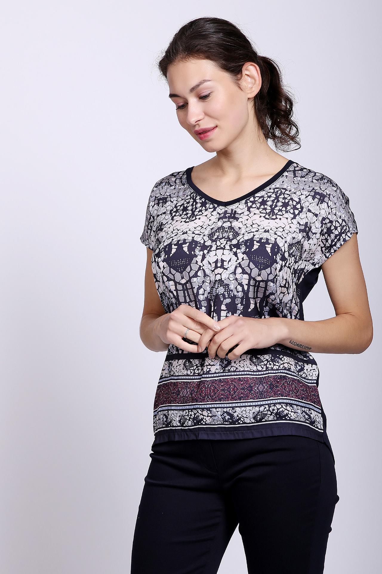 - Уникальный принт. Современный абстрактный узор под рептилию в сине-серо-белых тонах дополнен выразительной декоративной полосой по низу, делая блузу центральным элементом образа.