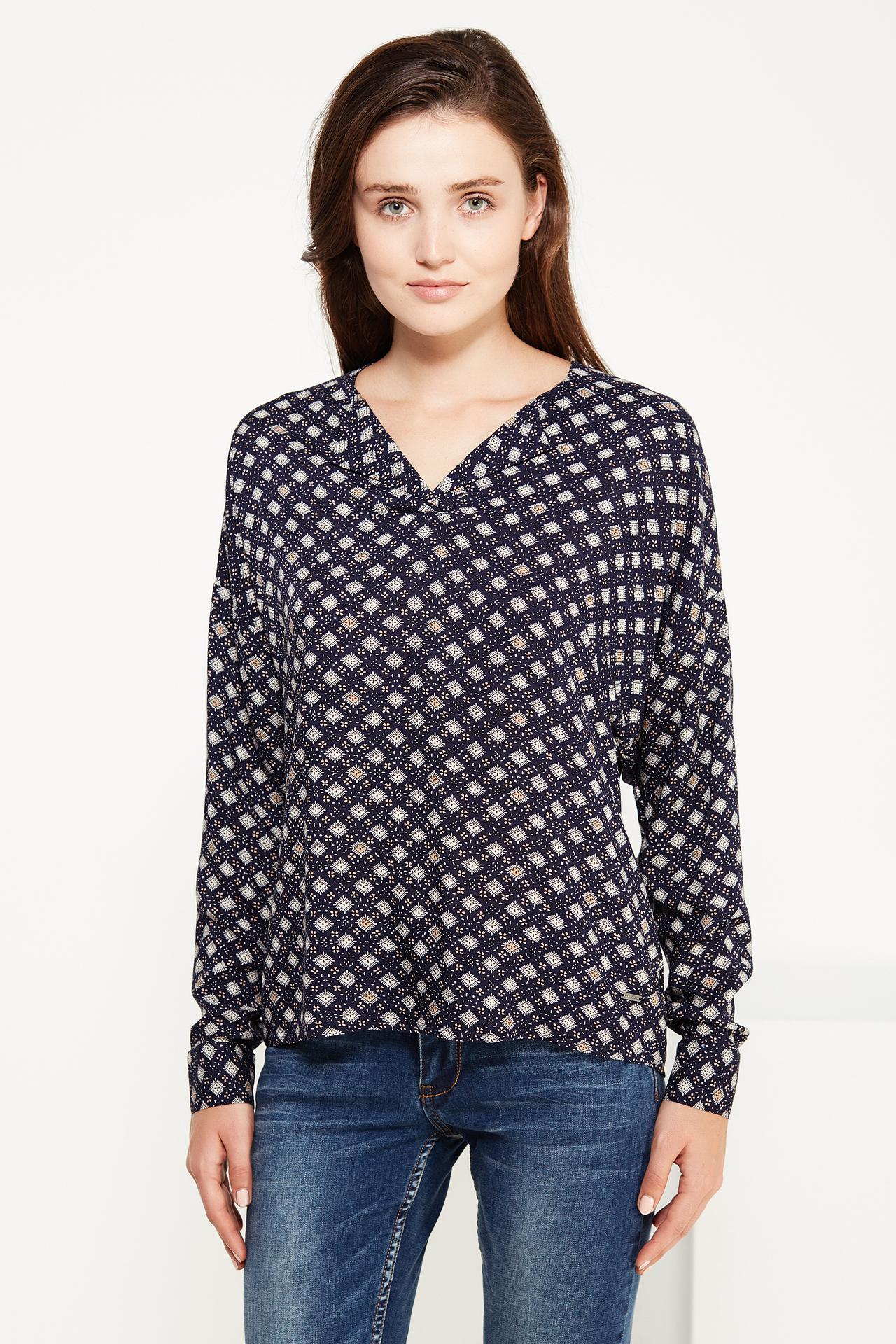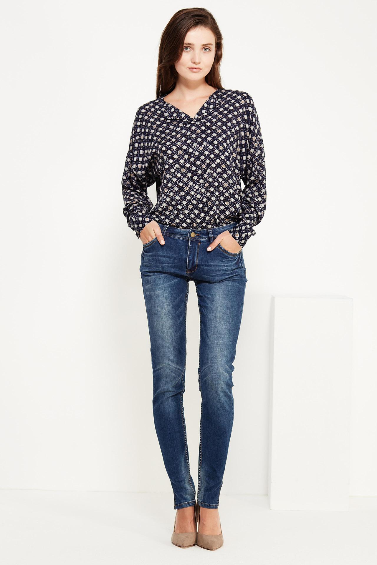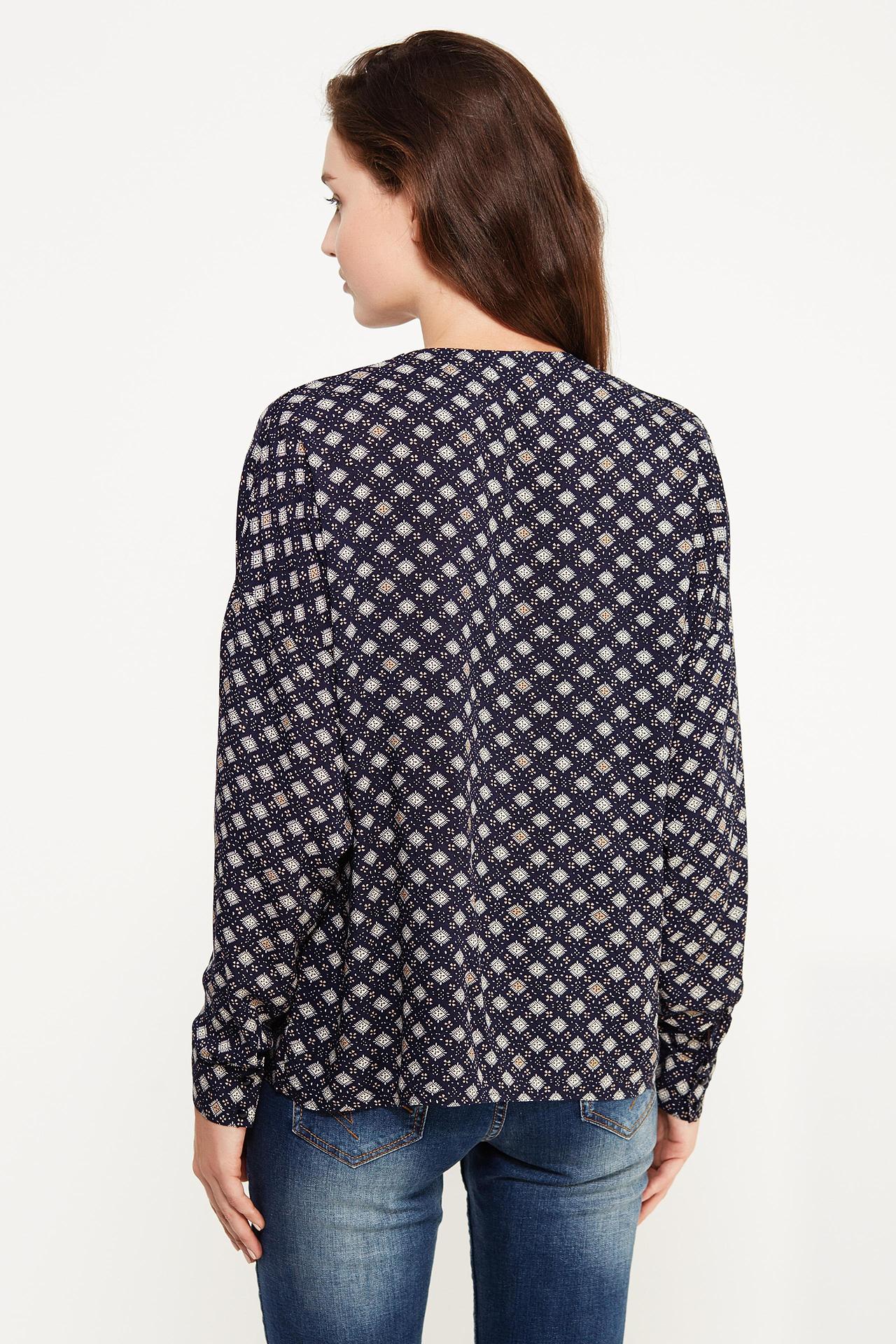 - Дизайн: Синий цвет с геометрическим принтом придает блузке элегантный и современный вид.