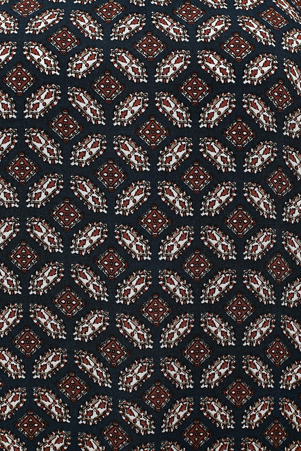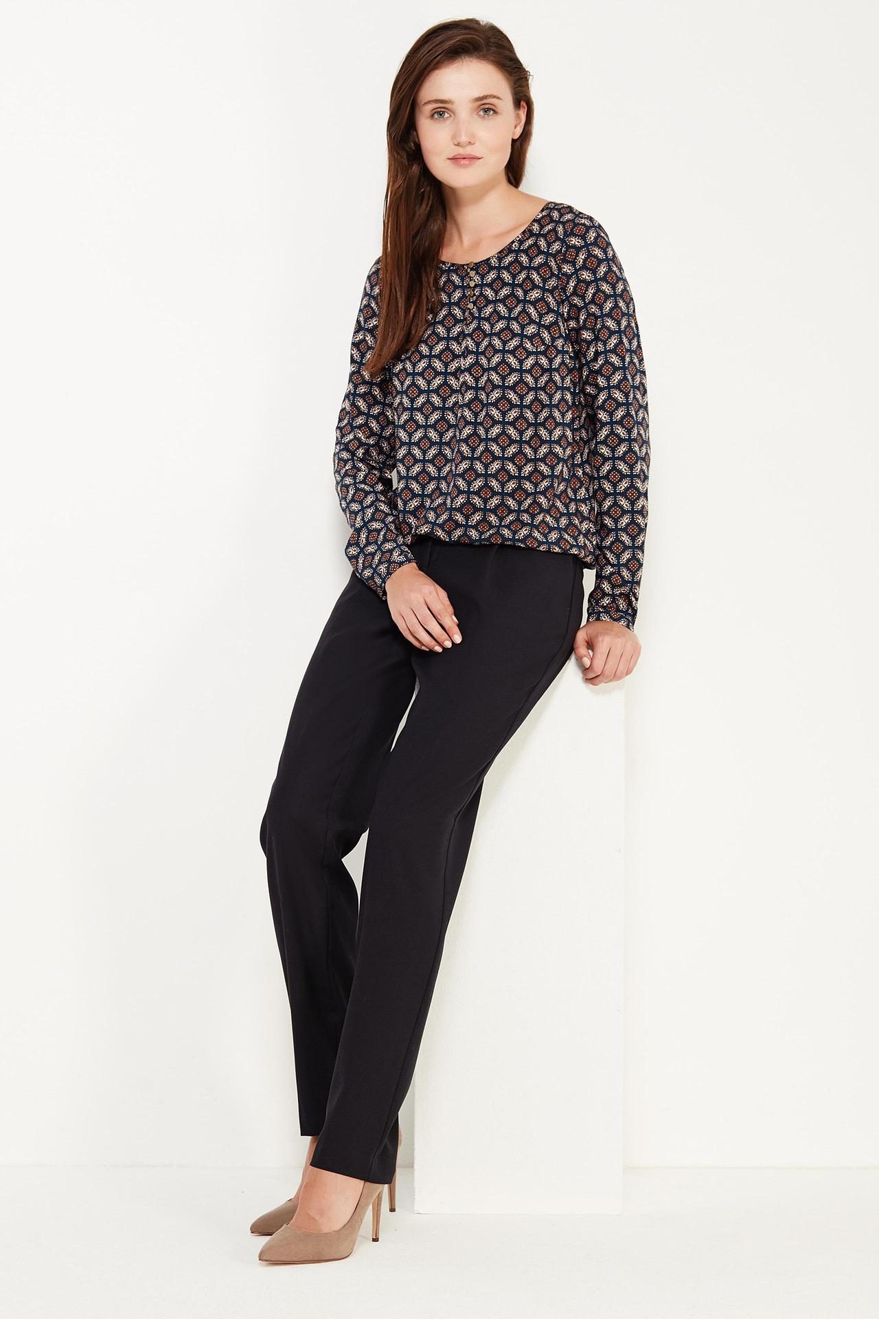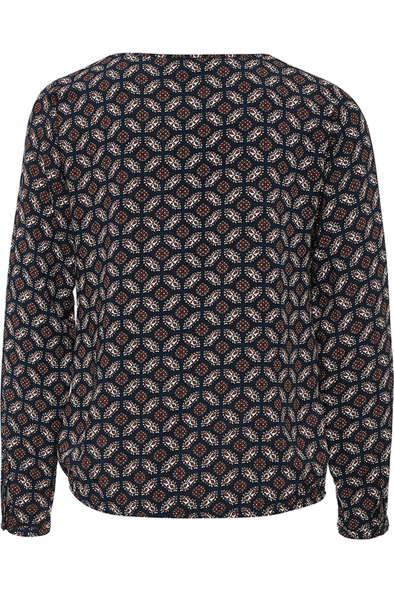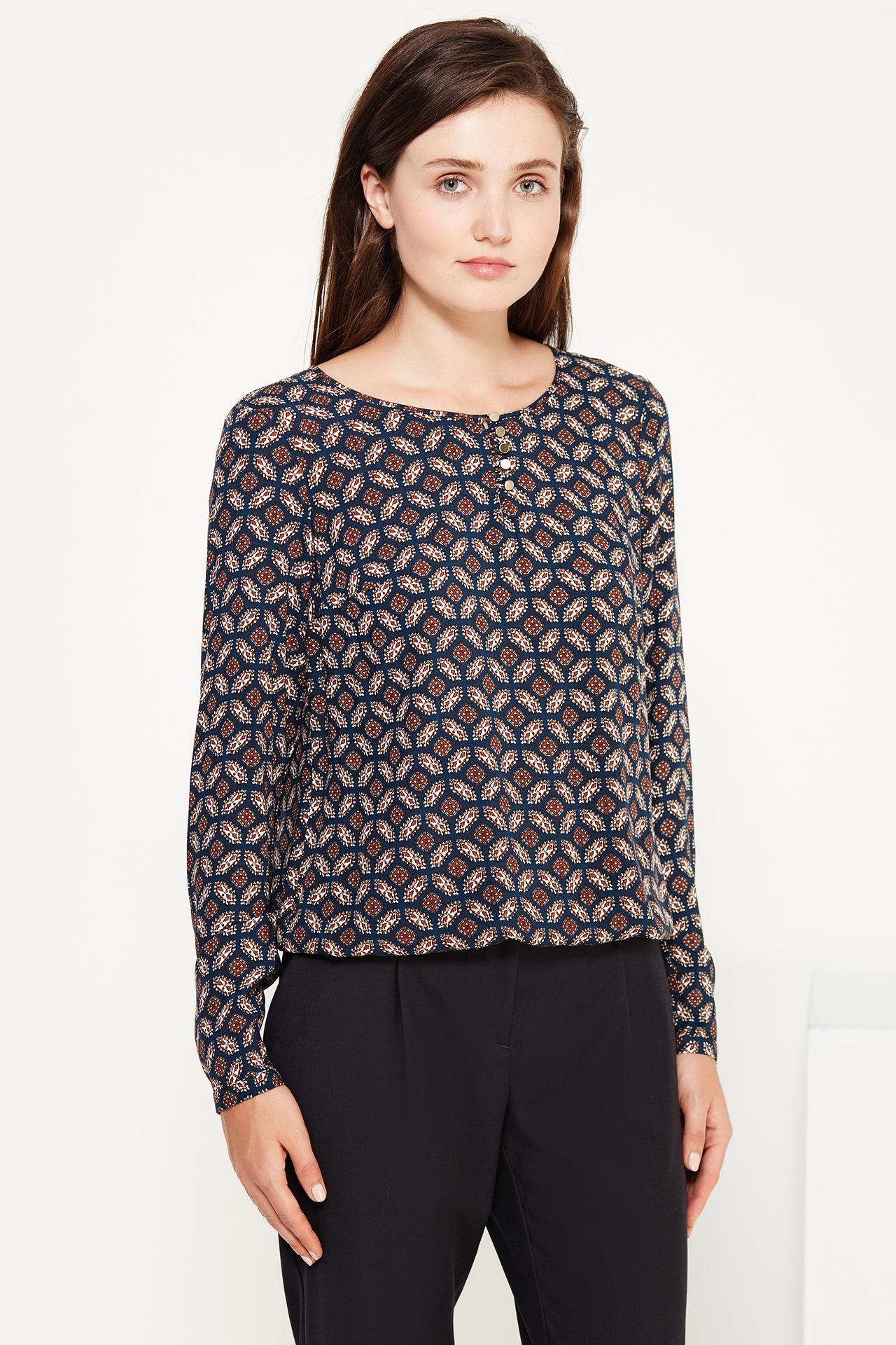 - Дизайн: Блуза украшена стильным принтом, состоящим из ромбов с узором внутри. V-образный вырез с планкой на пуговицах добавляет изысканности.