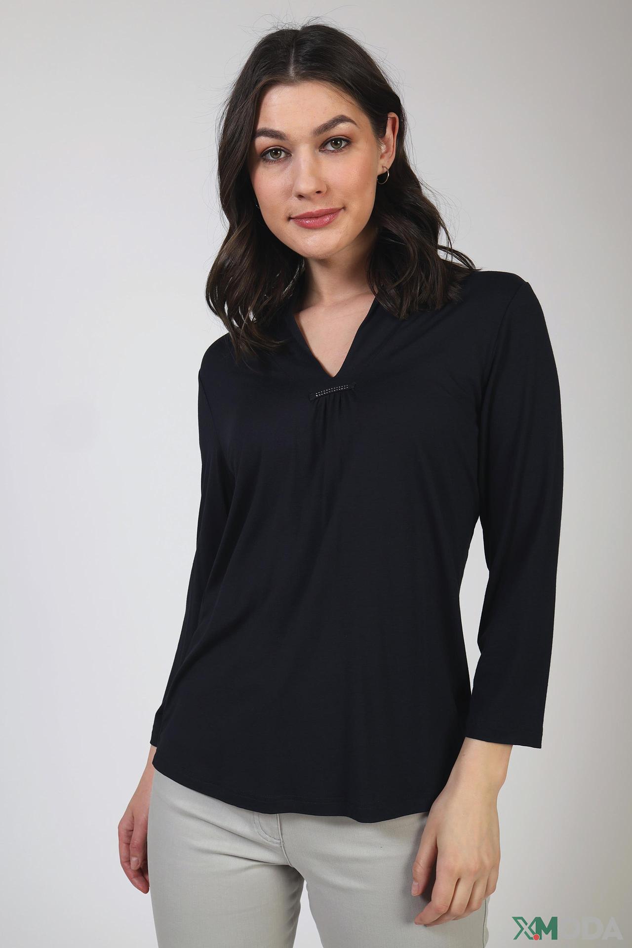 - Дизайн: Классический крой с рукавом три четверти и V-образным вырезом. Декоративная вставка со стразами у выреза горловины добавляет изысканности.