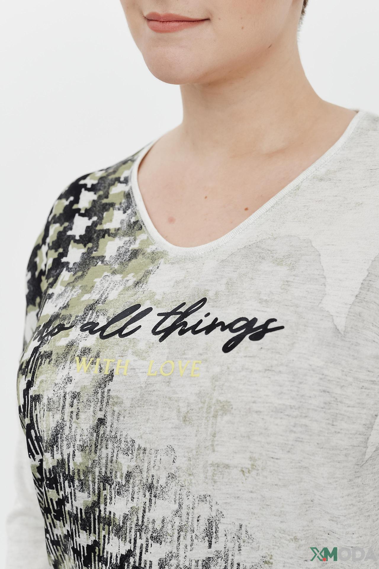 - Дизайн: Модель украшена эффектным принтом, включающим геометрические узоры и надпись. V-образный вырез горловины и укороченный рукав добавляют изящества.