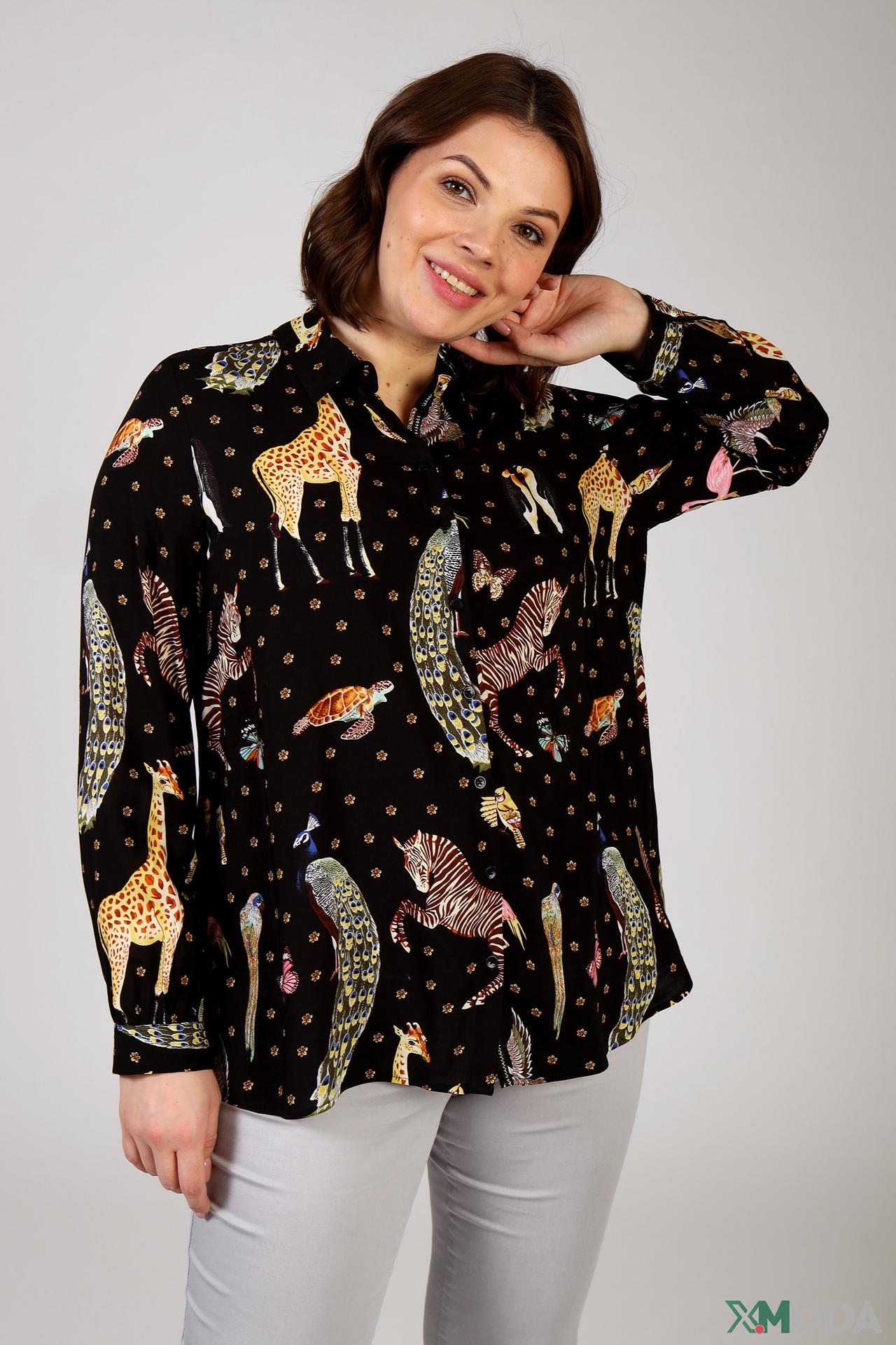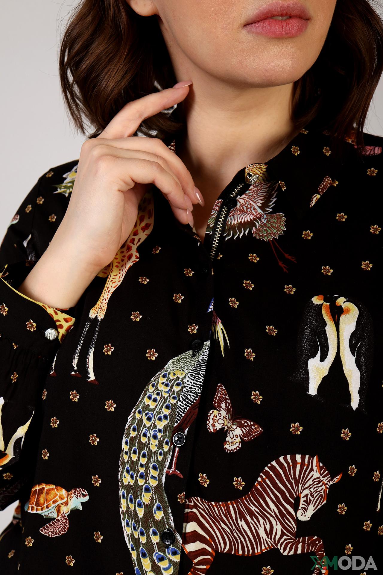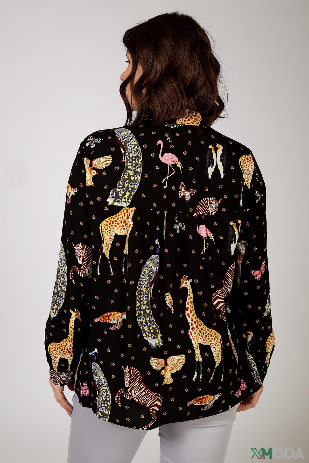 - Дизайн: Оригинальный принт с животными (жирафы, зебры, павлины, фламинго) и тропическими мотивами создает запоминающийся образ. Классический крой блузы с длинными рукавами и воротником-стойкой универсален и подходит для различных случаев.