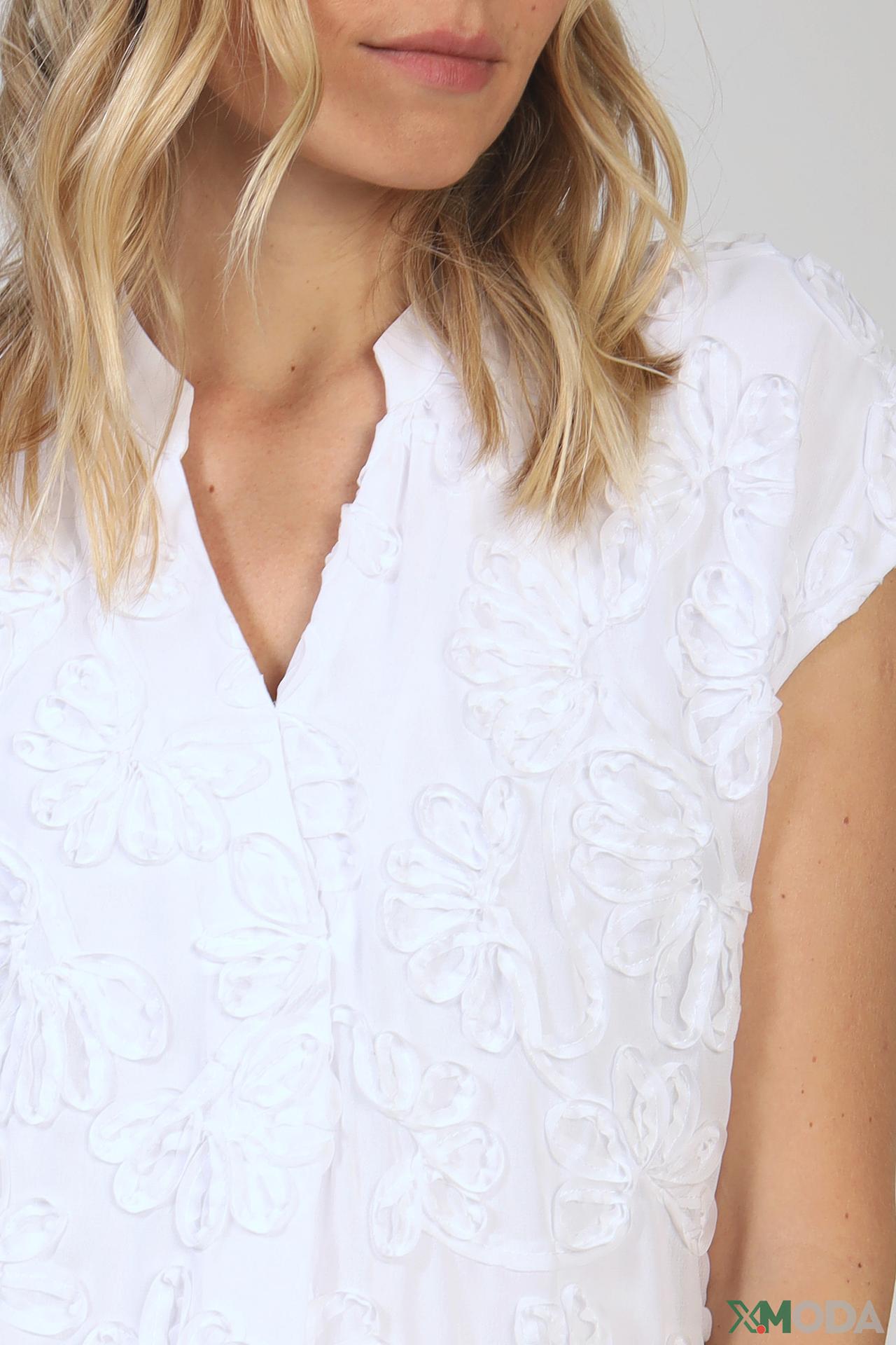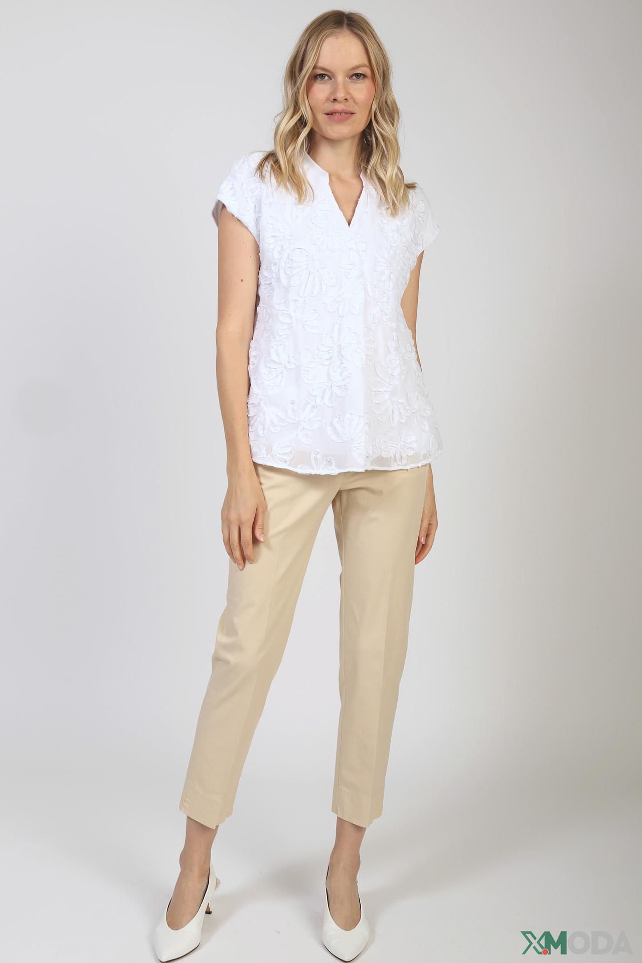 Блуза декорирована изящной цветочной вышивкой, придающей ей неповторимый шарм и женственность. V-образный вырез горловины выгодно подчеркивает линию шеи, а свободный крой обеспечивает свободу движений.