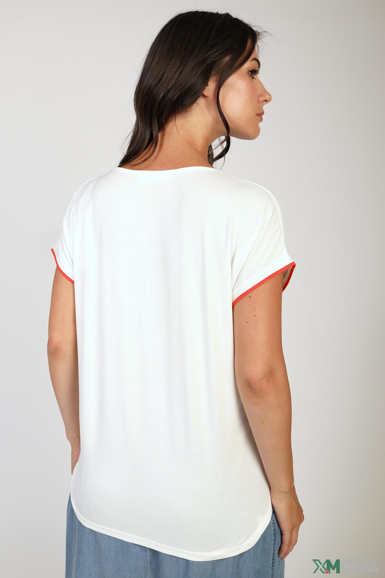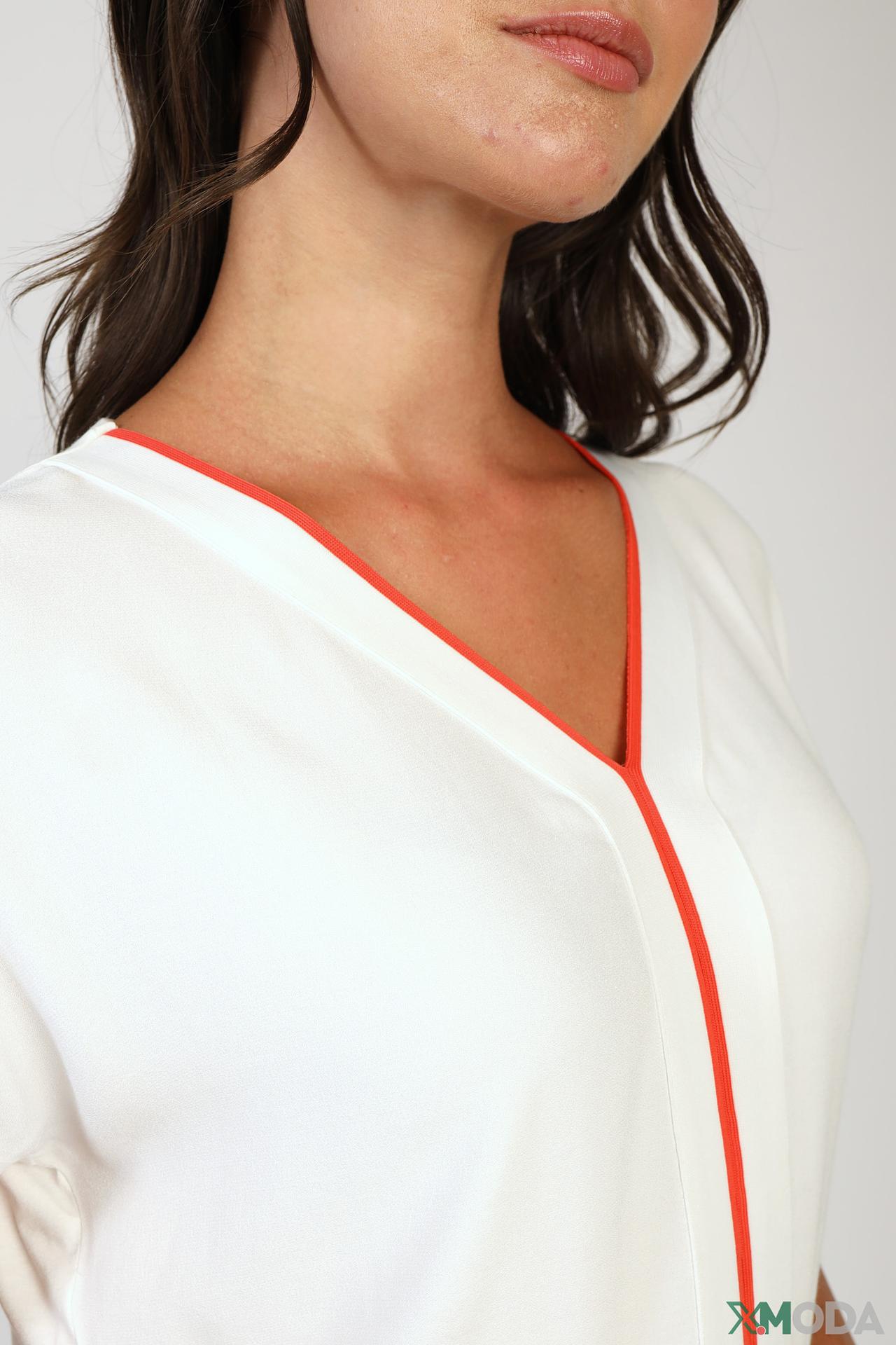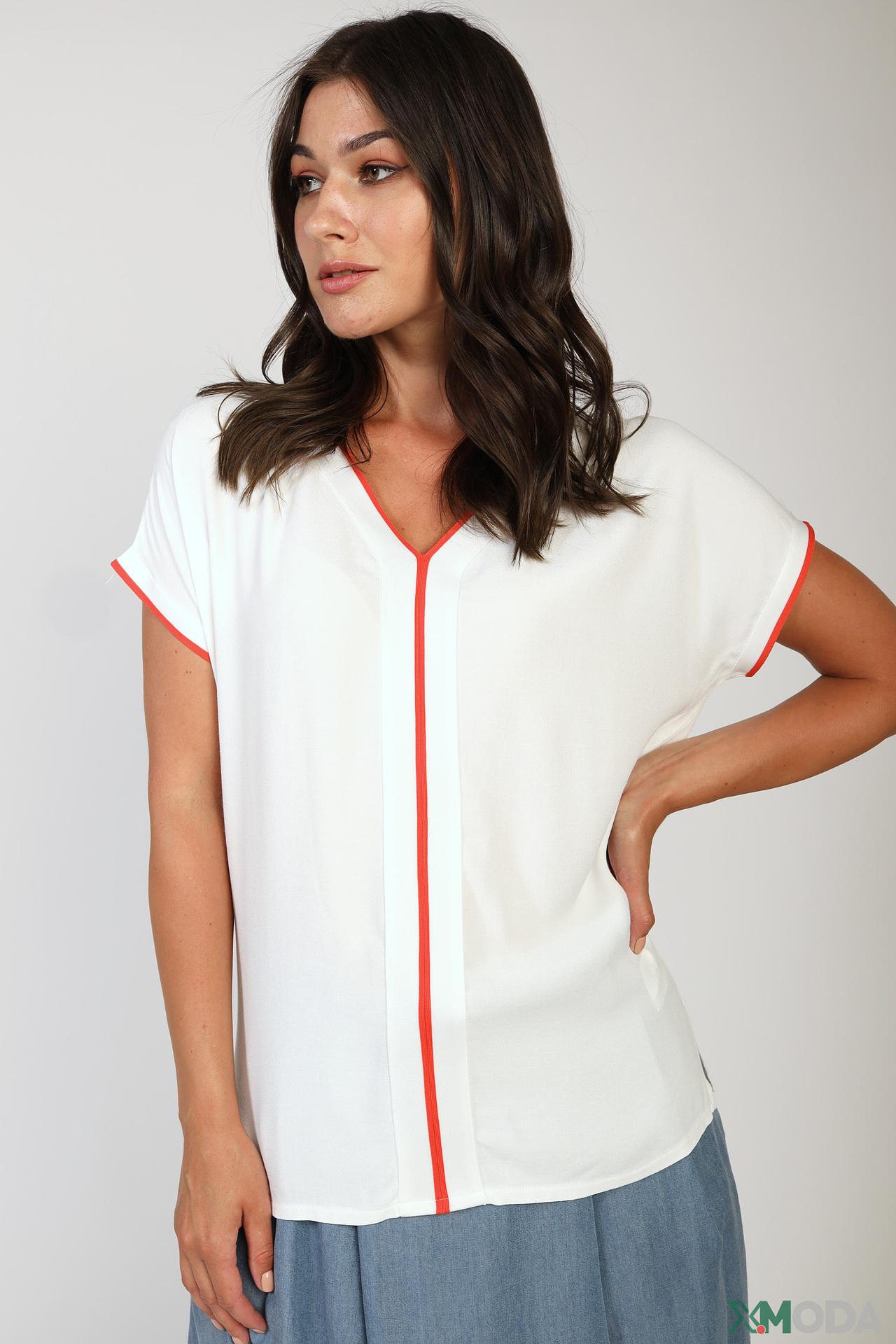 Блуза женская белого цвета бренда Bianca. Модель выполнена прямым фасоном. Изделие дополнено V- образным вырезом, короткими рукавами реглан, боковыми разрезами, передним средним швом. Вырез ворота, рукава и средний шов обшит бейкой красного цвета. Такая Изделие будет разнообразить ваш гардероб. Состав: 8% эластан, 92% вискоза. Сочетать можно с различными юбками, брюками.