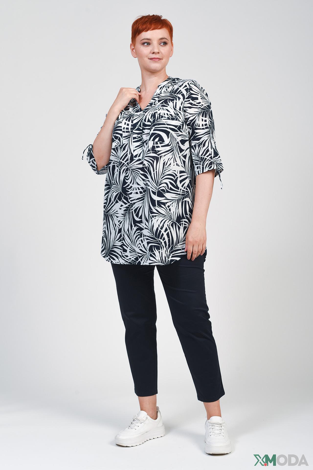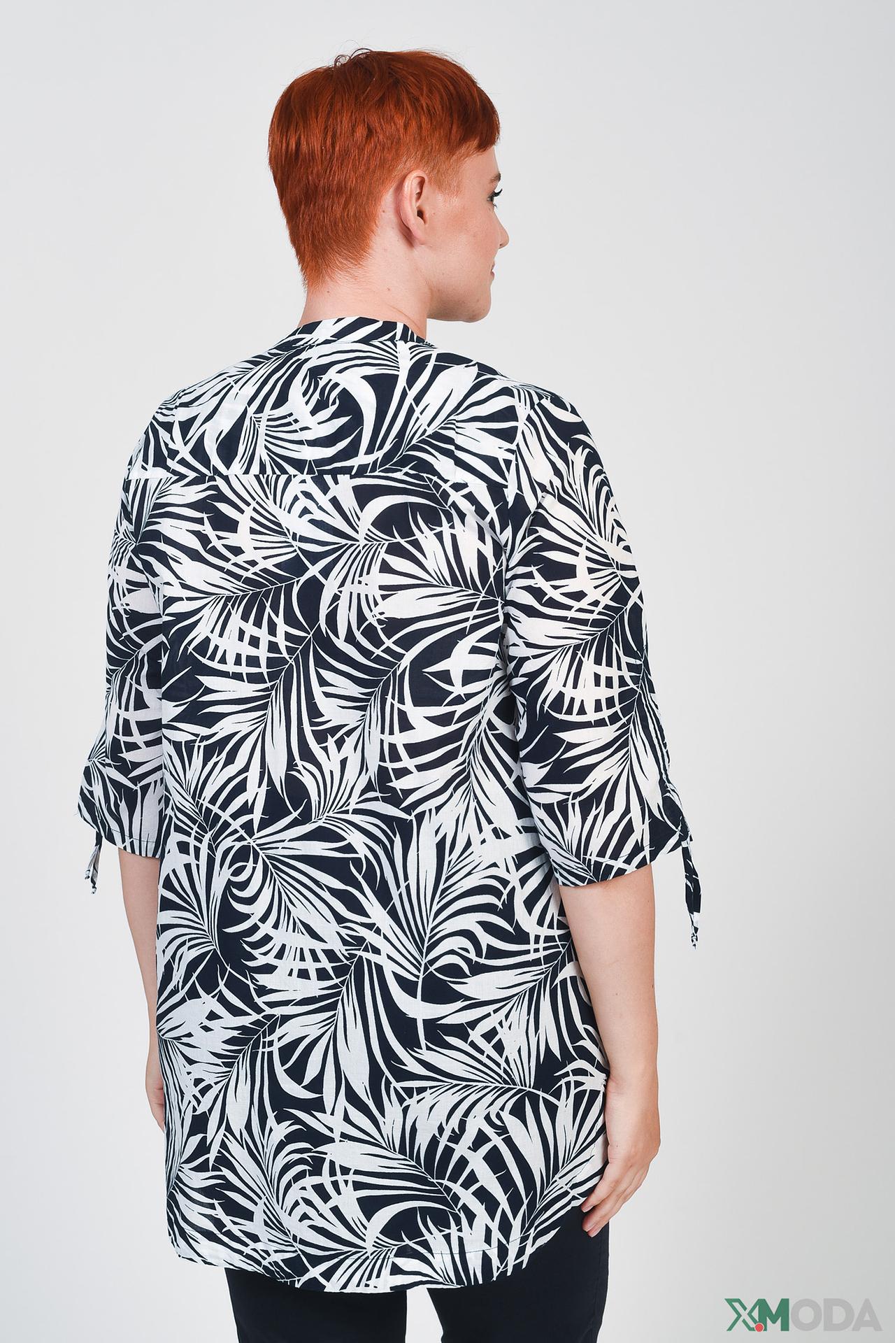 - Дизайн: Блуза имеет свободный крой и V-образный вырез горловины. Рукава 3/4 дополнены элегантными завязками, позволяющими регулировать их длину. Оригинальный принт с листьями добавляет образу динамичности и изысканности.