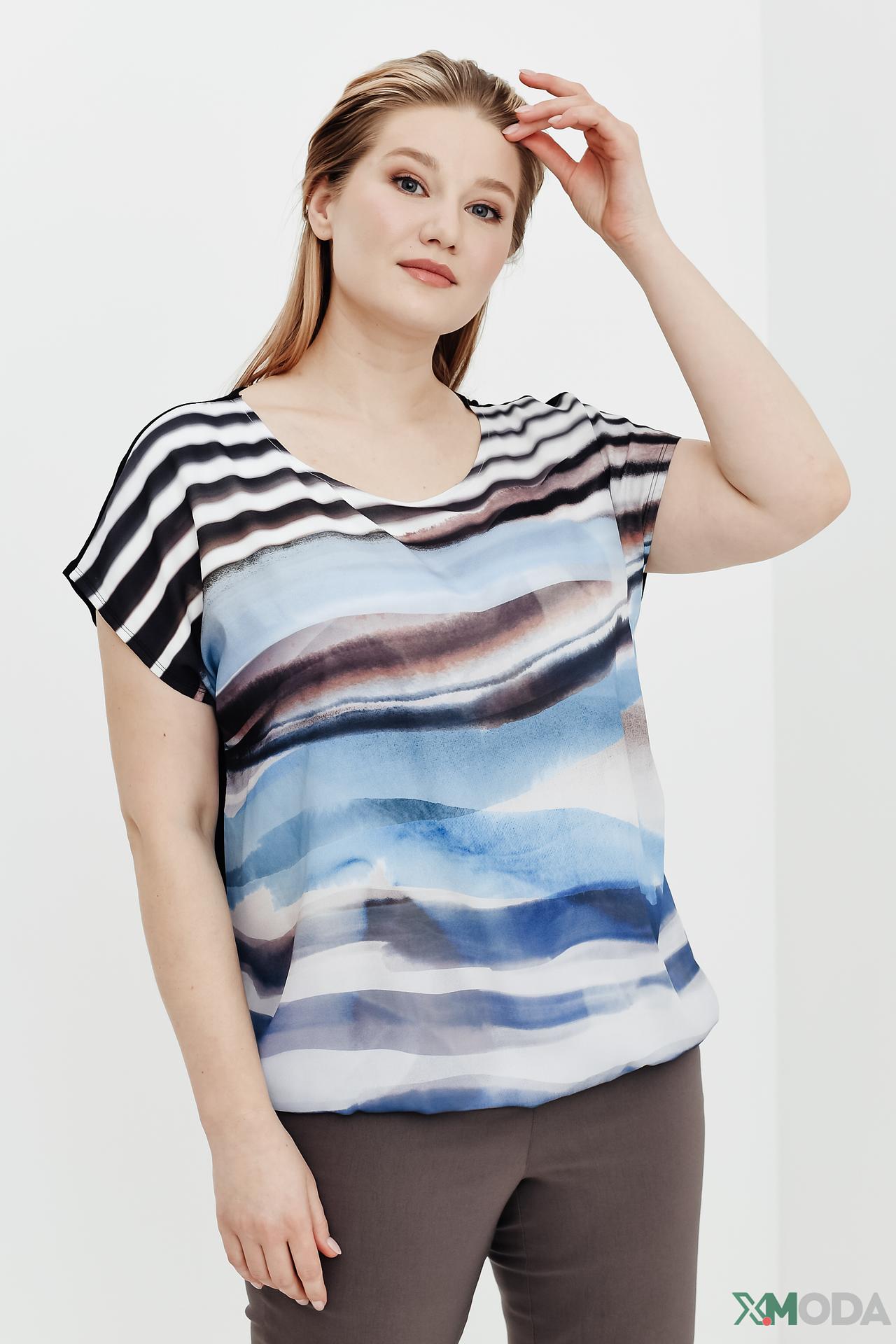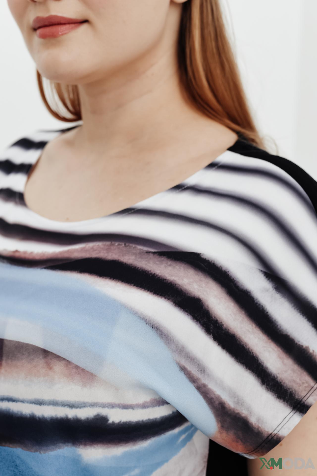 - Привлекательный дизайн: Сочетание горизонтальных полос и абстрактного акварельного принта в сине-коричневых тонах создает динамичный и запоминающийся образ. Спинка выполнена в однотонном черном цвете, что придает блузе универсальность.