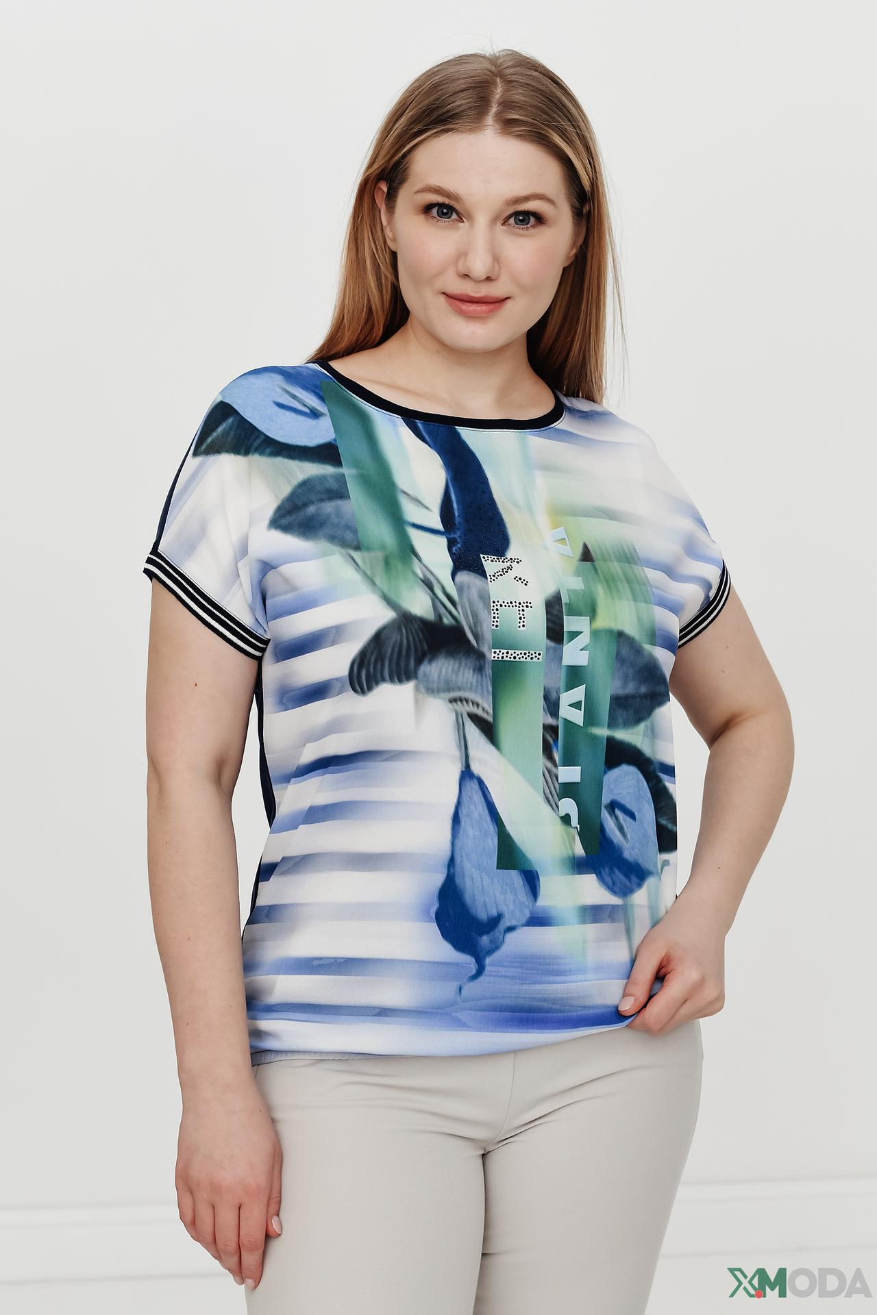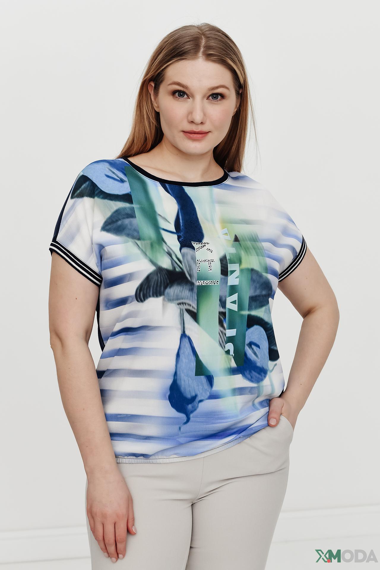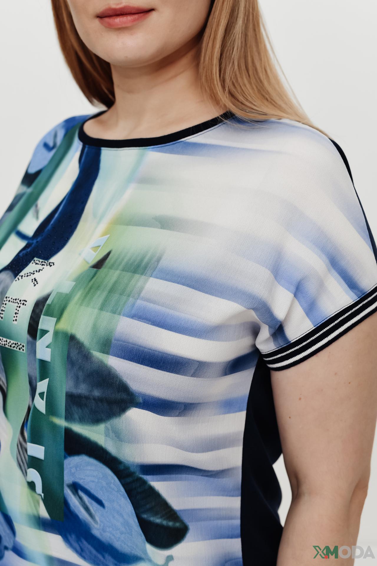 - Яркий и выразительный дизайн. Передняя часть блузы украшена красочным абстрактным принтом с цветочными элементами в оттенках синего, зеленого и белого, создавая уникальный и запоминающийся образ. Контрастные темно-синие рукава и спинка подчеркивают изящество модели.