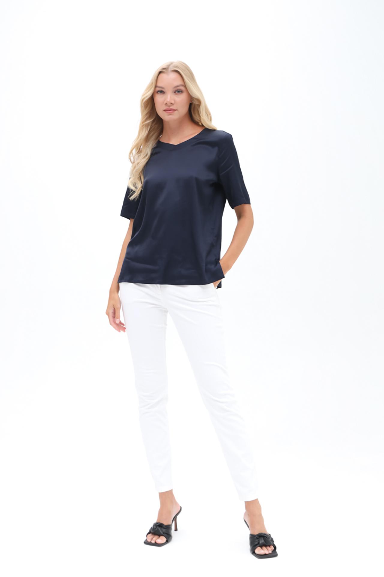 Эта модель отличается лаконичным дизайном, V-образным вырезом и короткими рукавами, что придает образу легкость и женственность. Блуза прекрасно подойдет как для повседневных выходов, так и для особых случаев, добавляя вашему стилю нотку изысканности. Вискоза в составе ткани обеспечивает воздухопроницаемость и комфорт в течение всего дня, а эластан гарантирует идеальное облегание без сковывания движений.